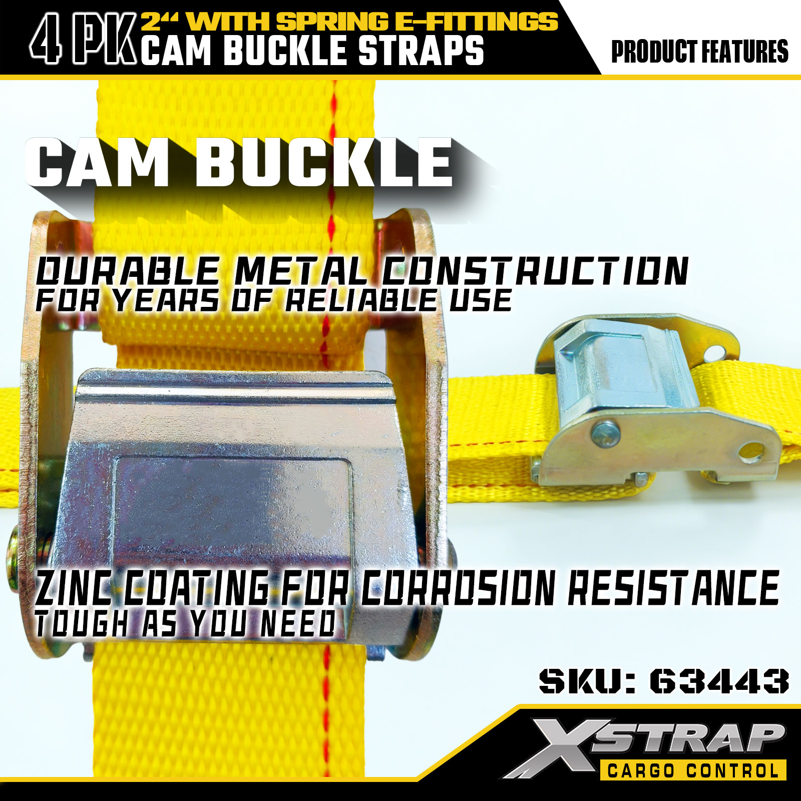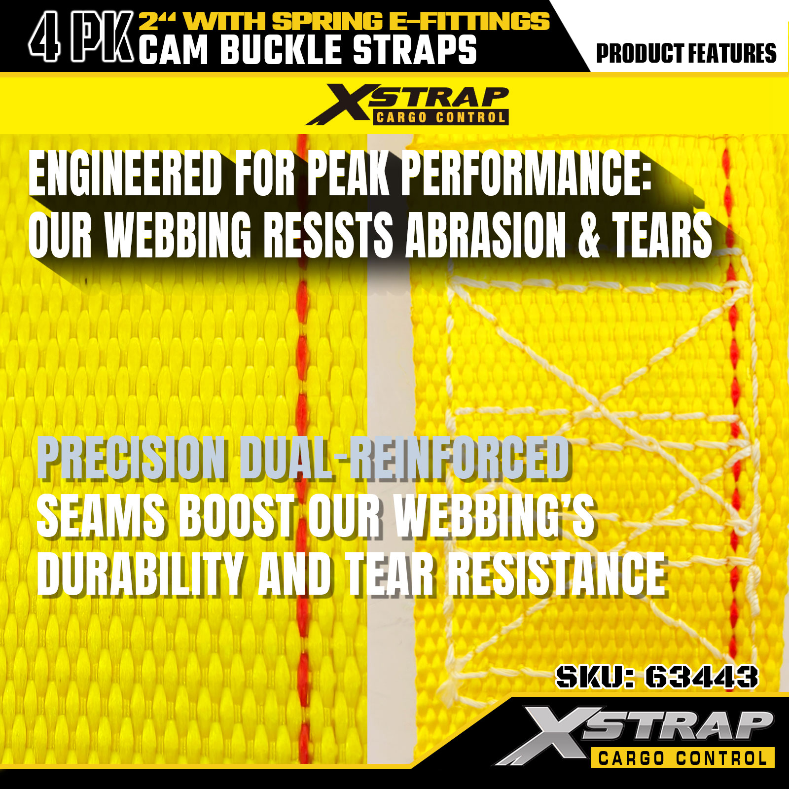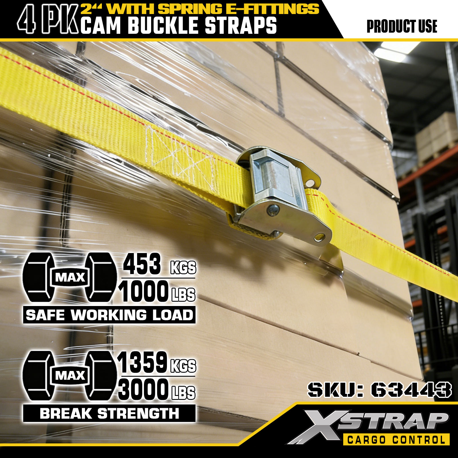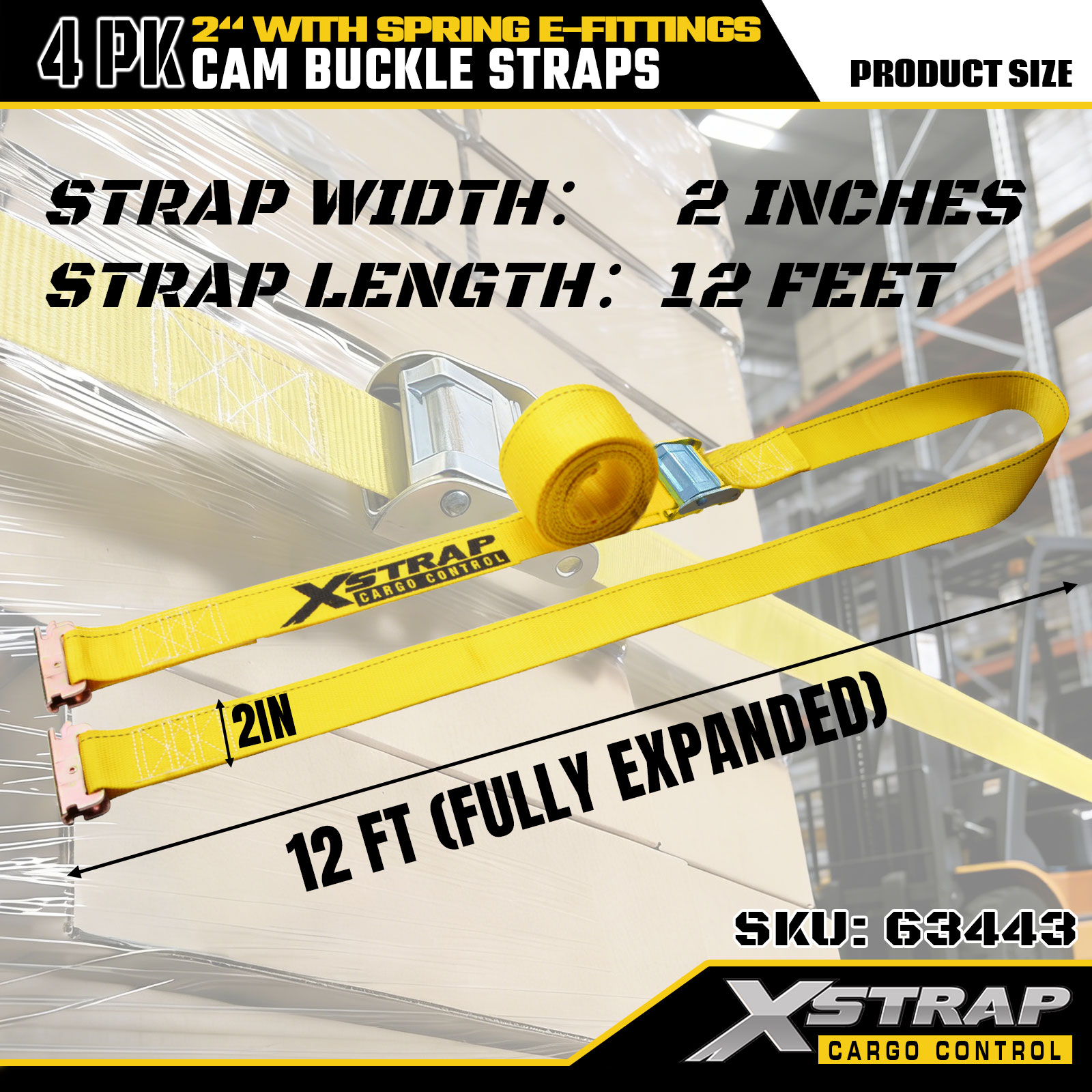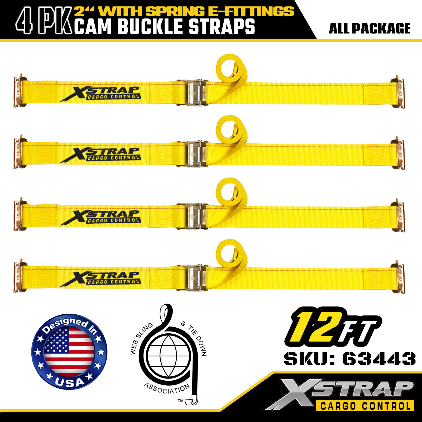 Xstrap 63443 4 Pack 2" x 12' Yellow Cam Buckle Straps with Spring E-Fittings, 1000 lbs SWL & 453 lbs Breaking Strength for Cargo Handling, Relocation & Transit