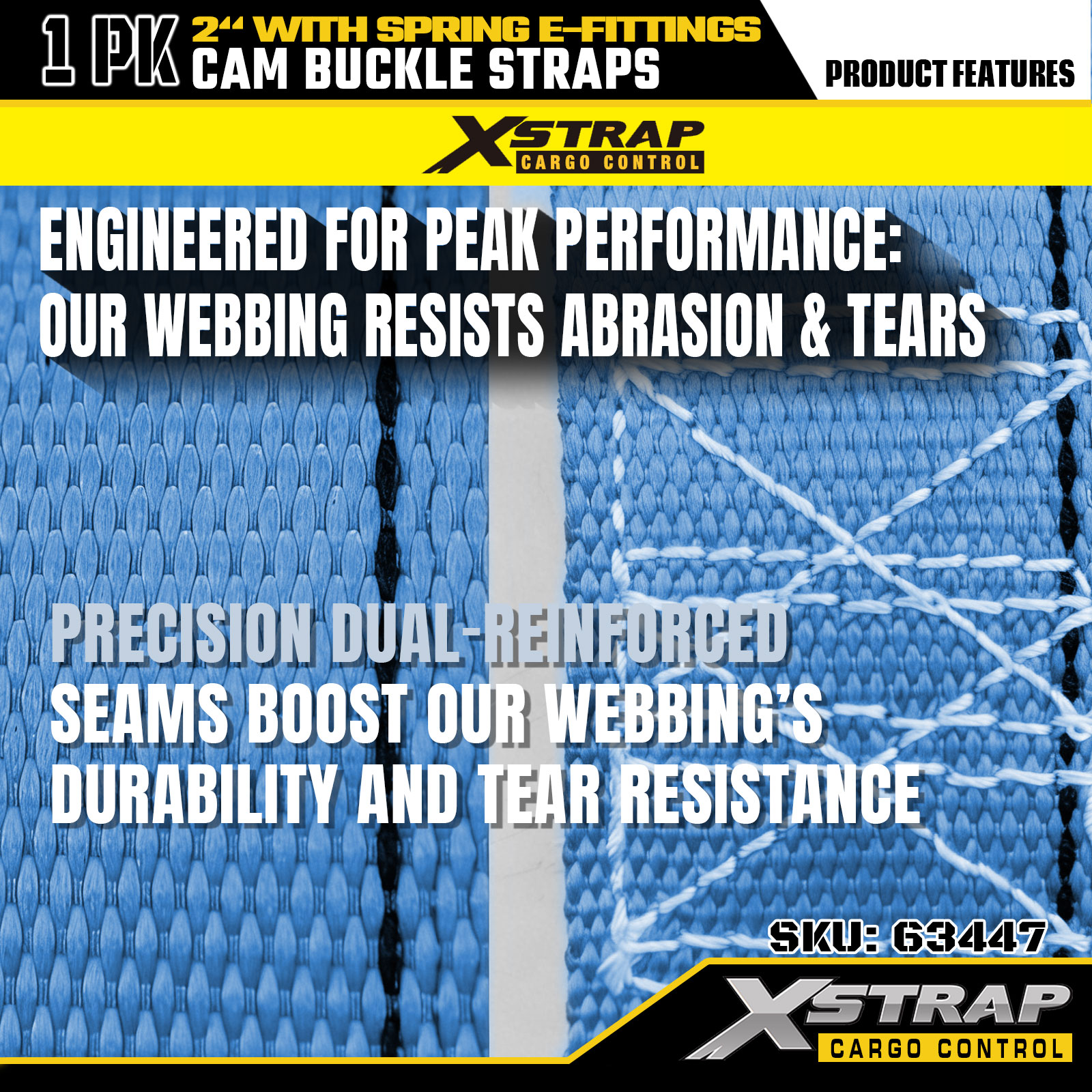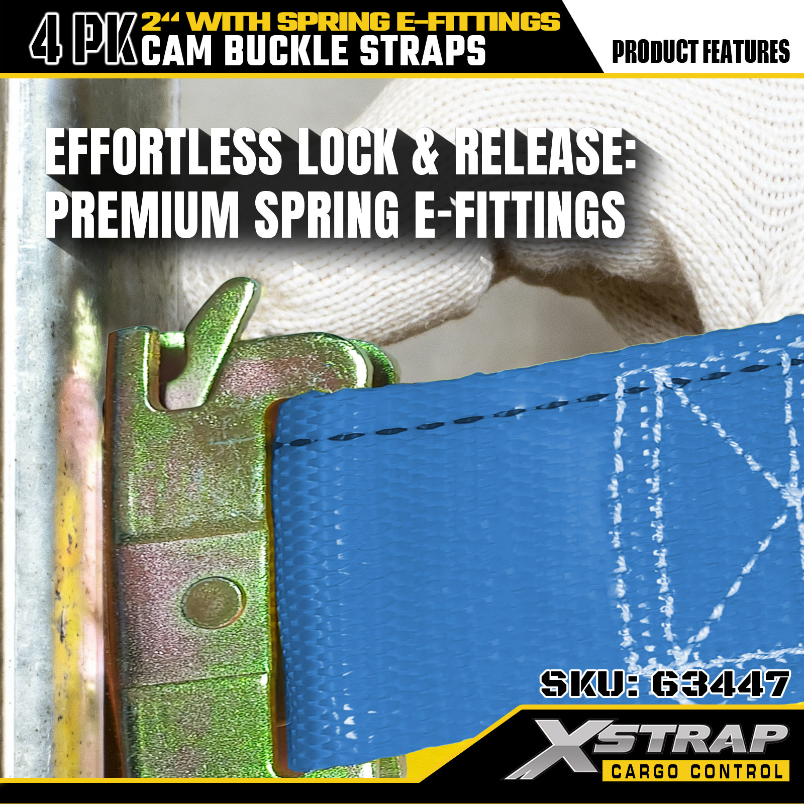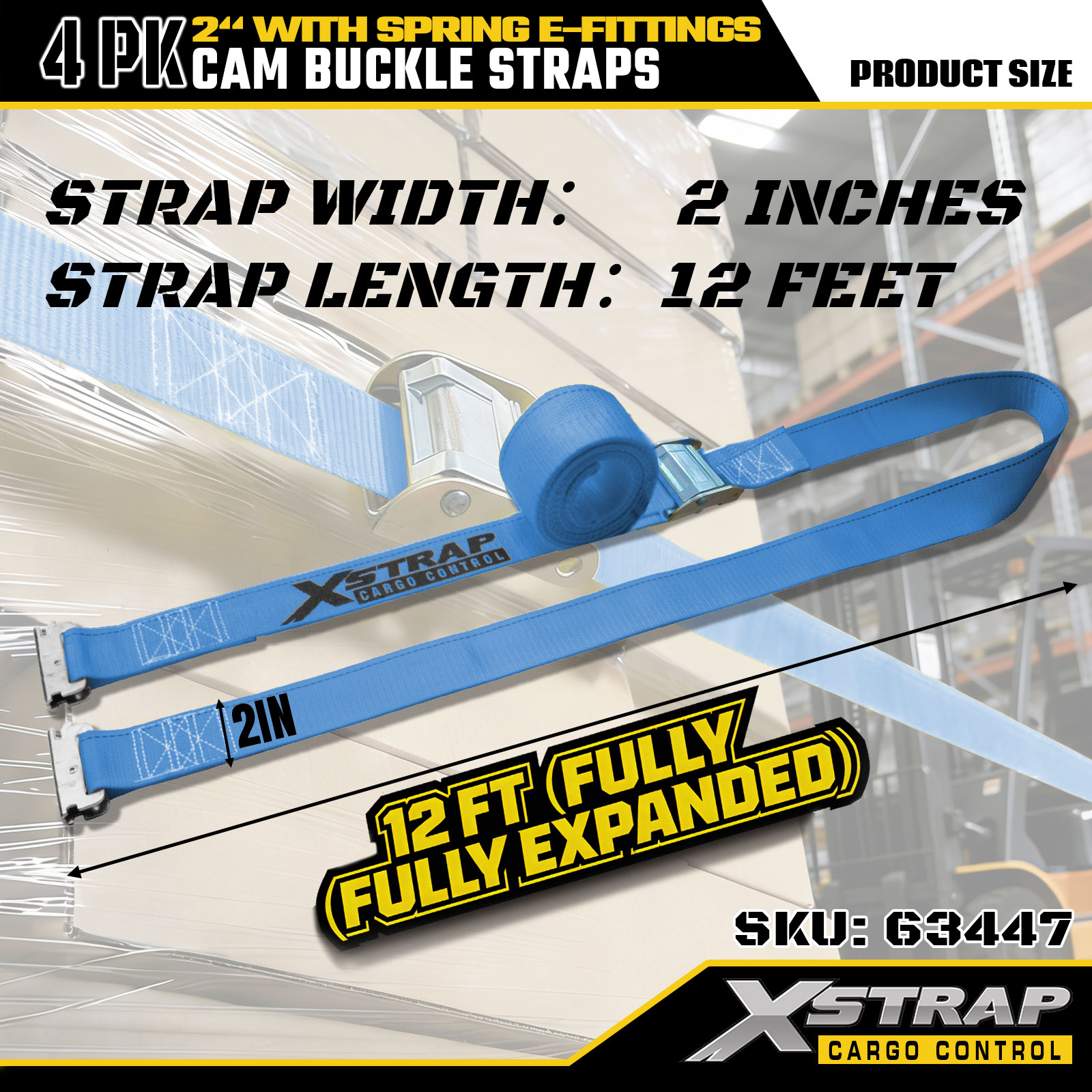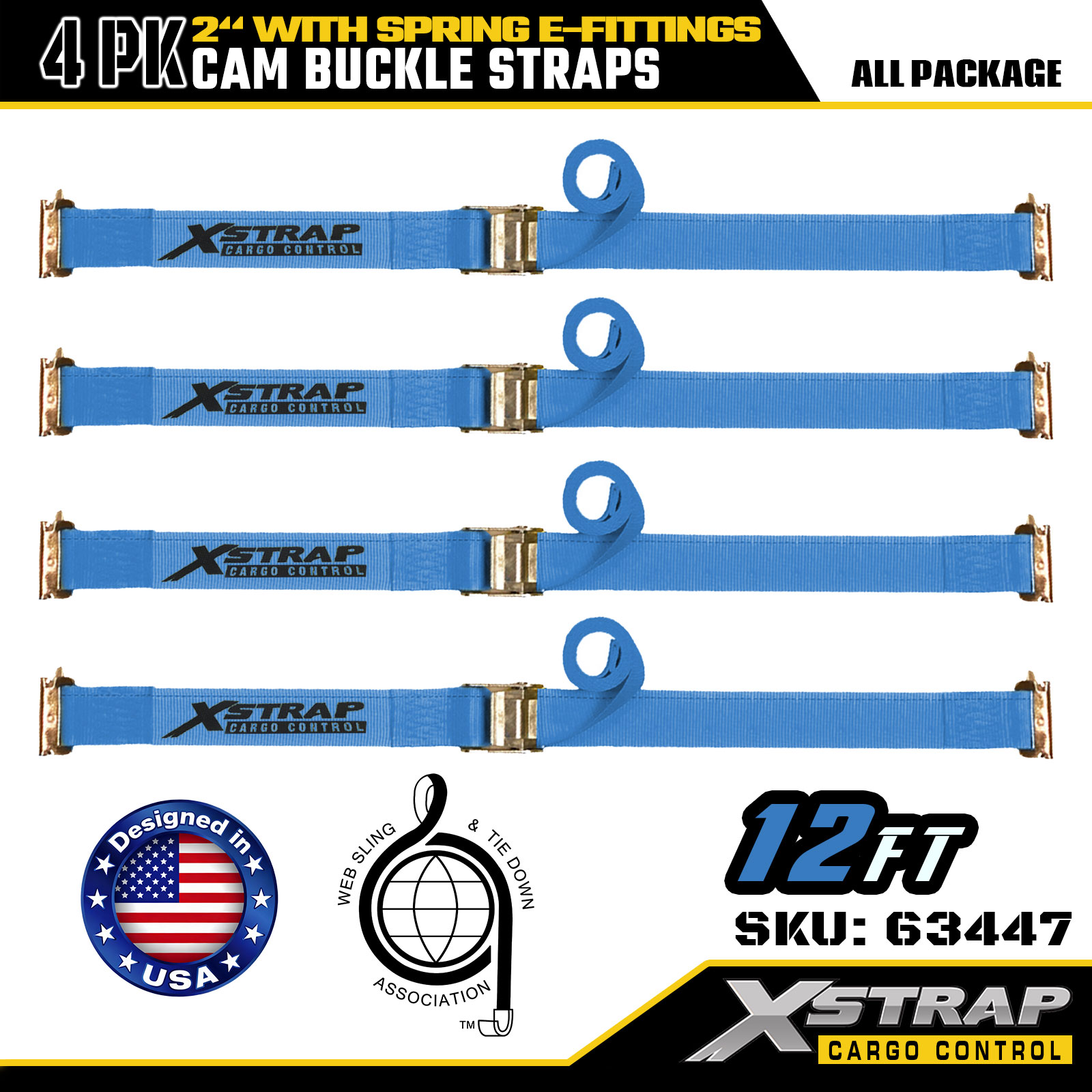 Xstrap 63447 4 Pack 2" x 12' Blue Ratchet Straps with Spring E-Fittings & F Hooks, 733 lbs SWL & 332 lbs Breaking Strength for Cargo Control, Moving & Transport
