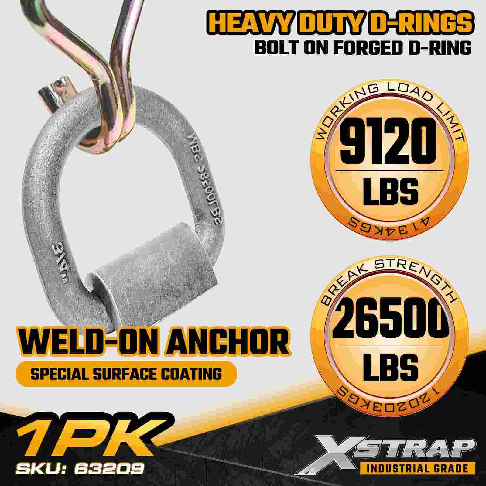 The Xstrap 63209 3/4" Forged Weld-On D-Ring is a high-capacity tie-down anchor designed for equipment trailers, construction transport, agricultural machinery, and commercial hauling. Manufactured from oversized forged steel, this heavy-duty D-ring delivers a 9,120 lbs (4,136 kgs) Working Load Limit, making it suitable for securing compact loaders, tractors, skid steers, steel bundles, and other high-weight cargo. The weld-on mounting bracket ensures a permanent, rigid attachment point that performs reliably in demanding industrial environments.