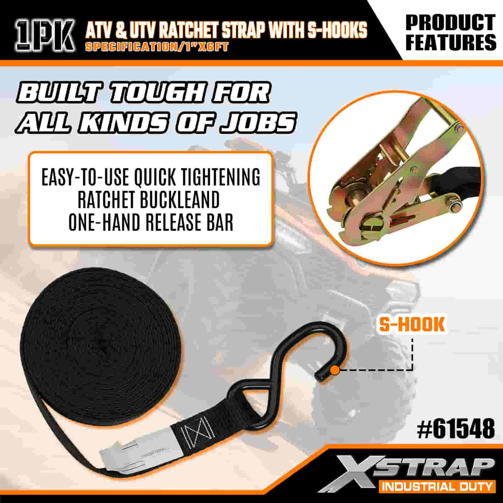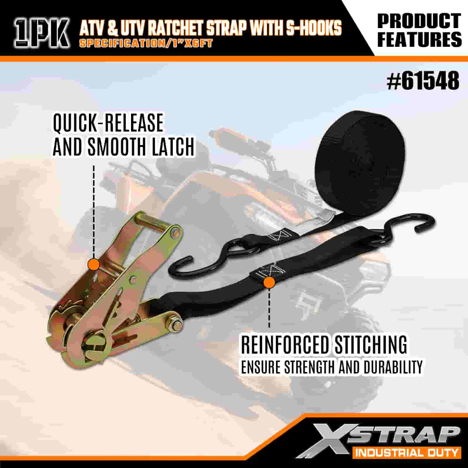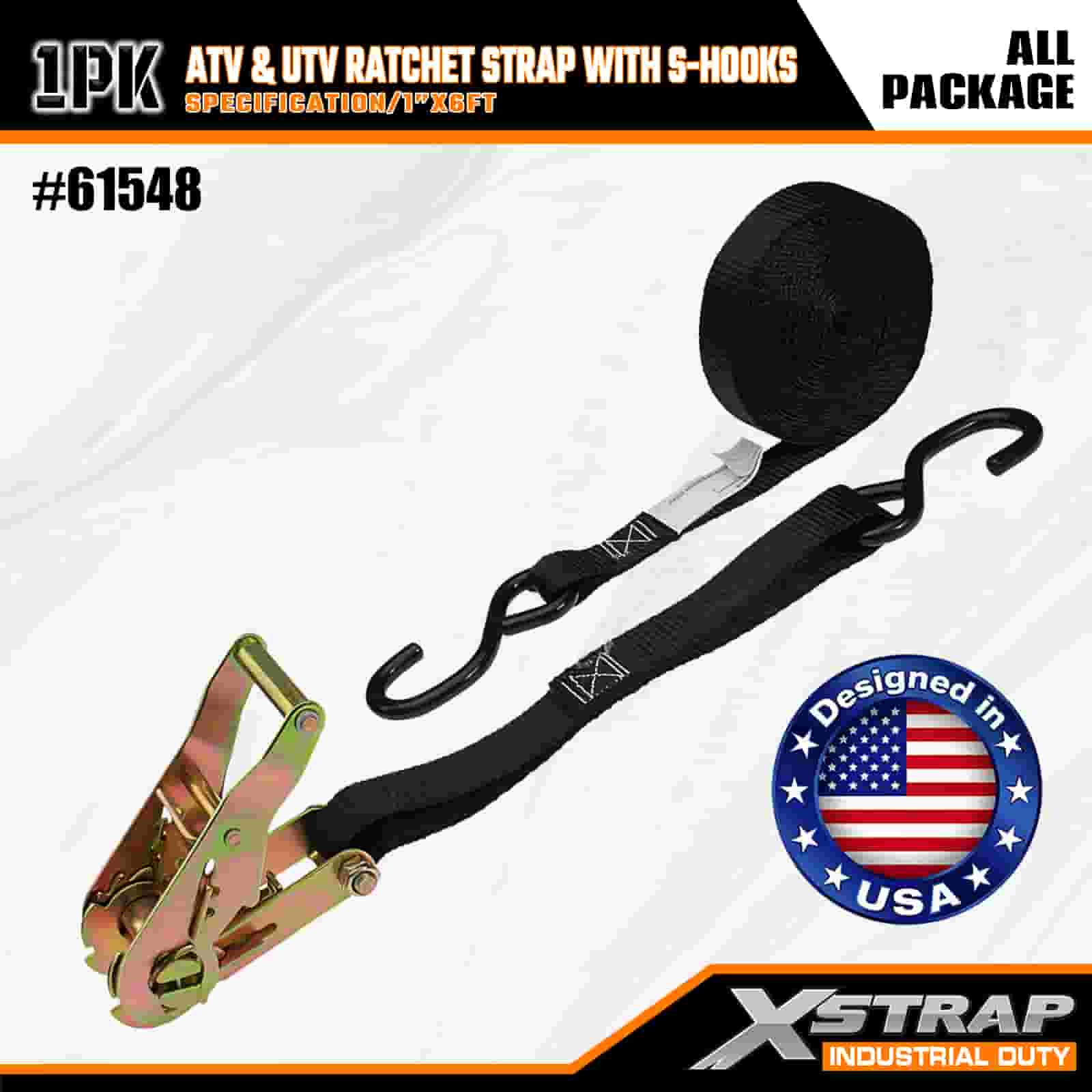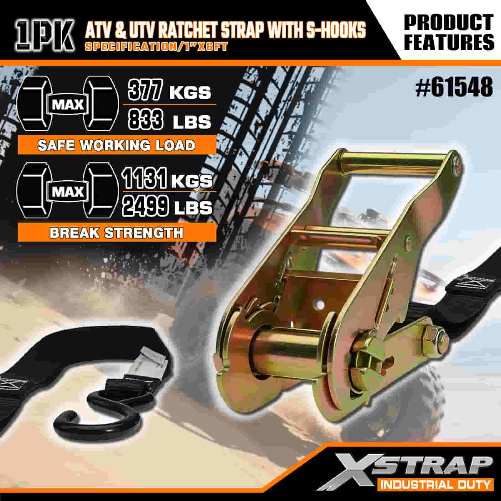 Xstrap ATV & AUV Ratchet Strap with S Hooks, 1” x 6’ Polyester Tie Down Strap Ratchet Strap, 833lbs Capacity Cargo Lashing Securing Straps with S Hooks for Trailer, Flat Bed Trailer Ski Boat, Small Car, Heavy Equipment.