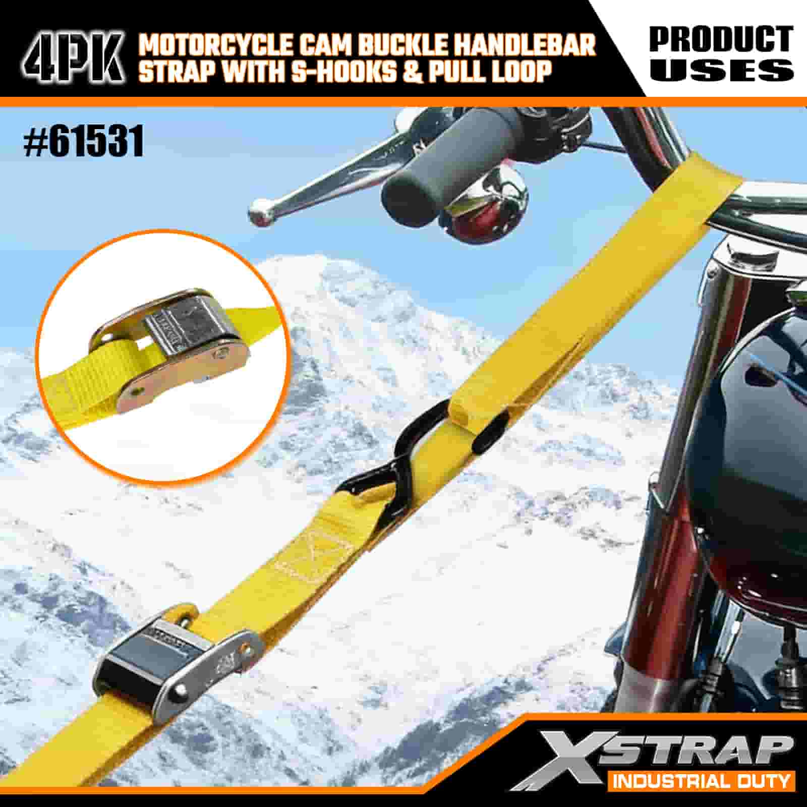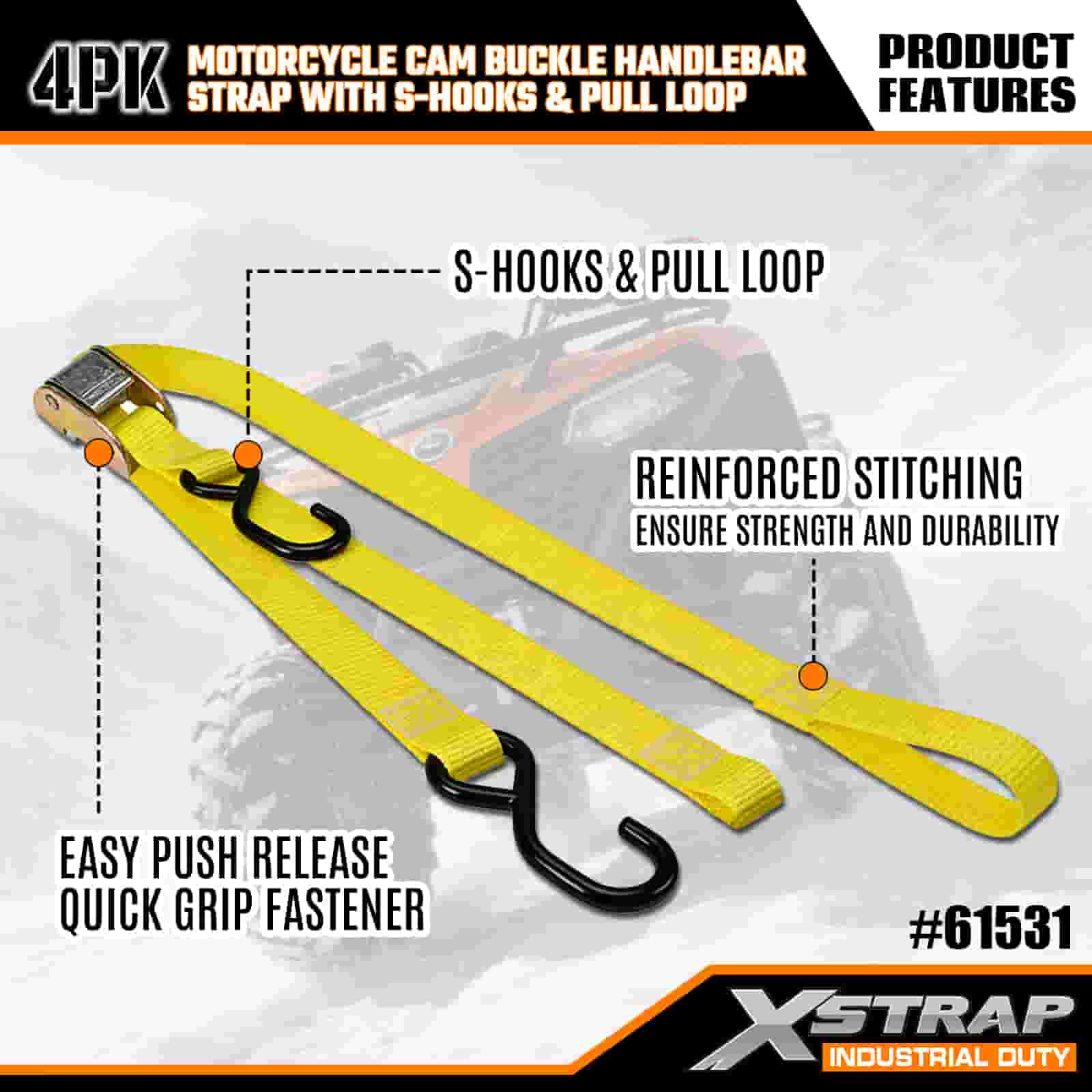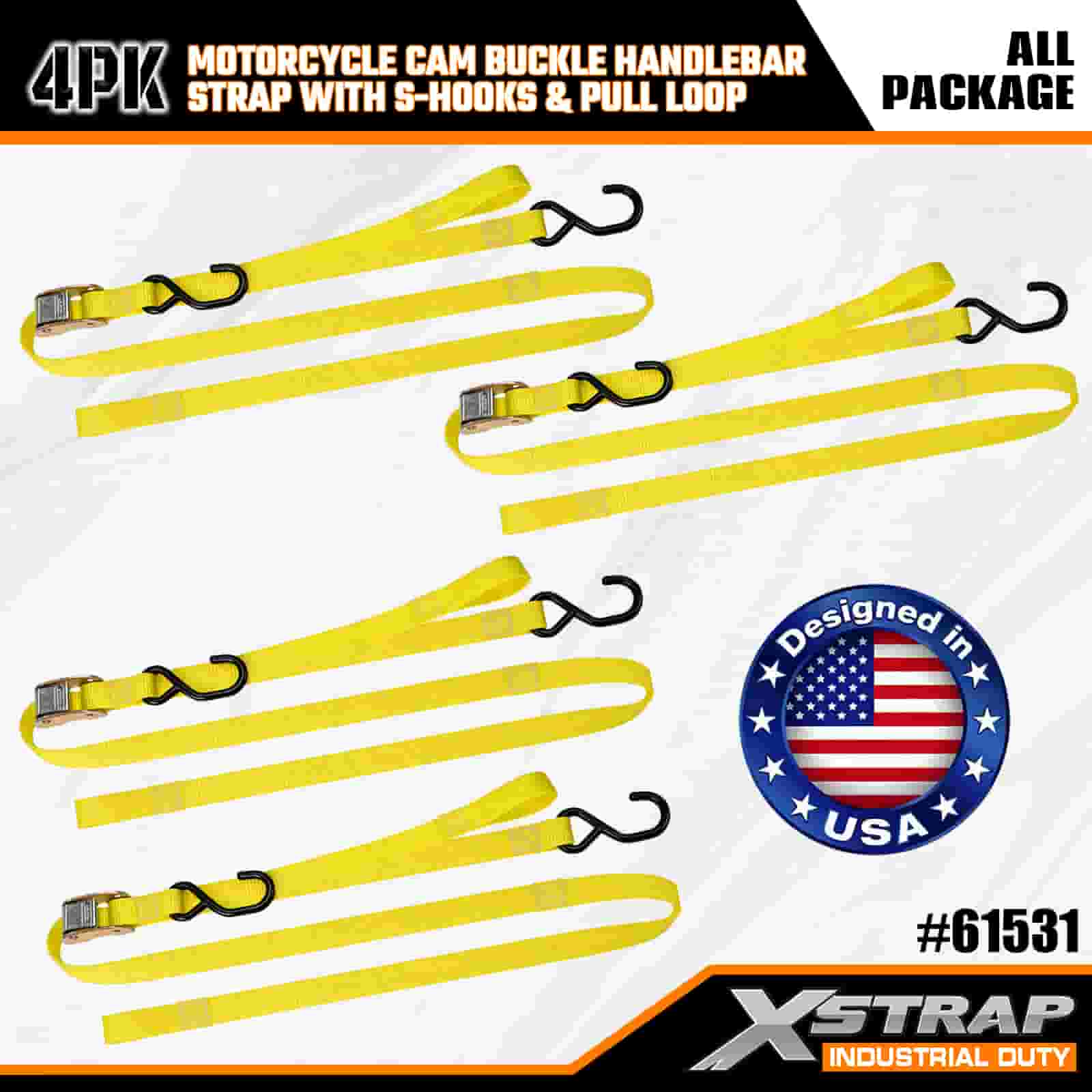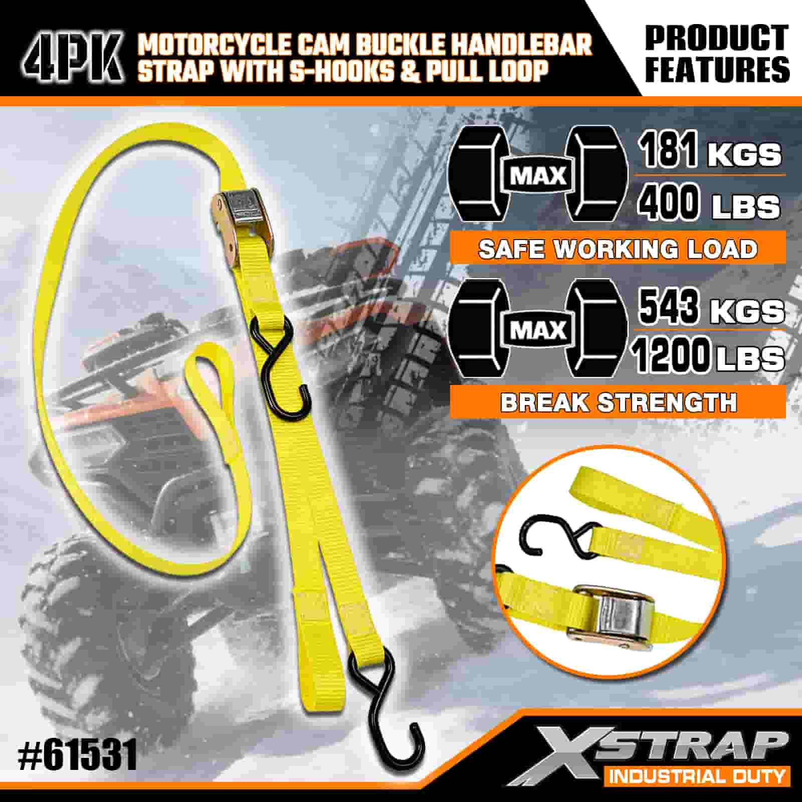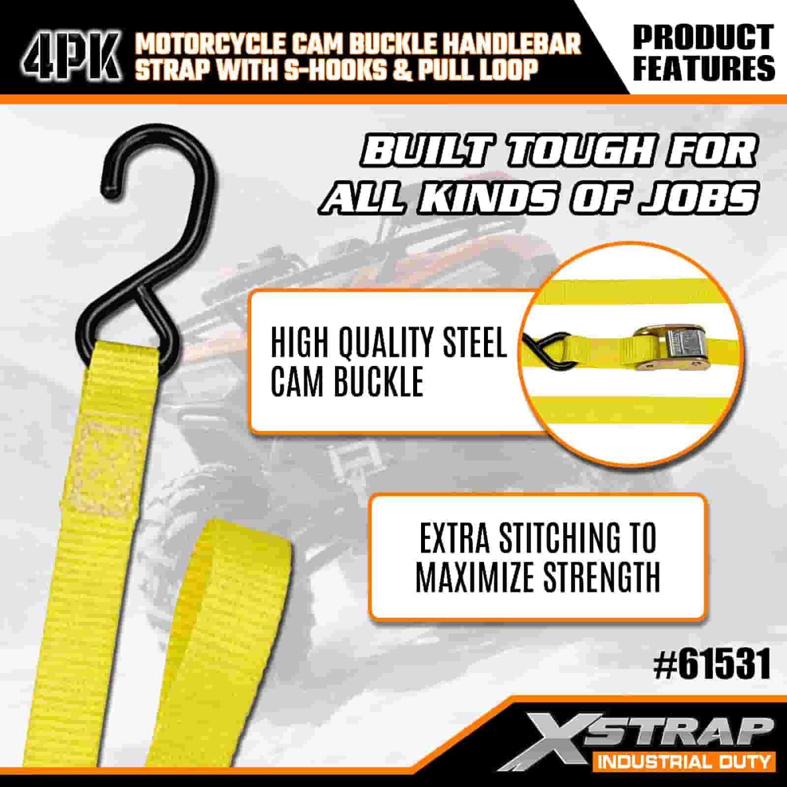 Xstrap 4PK Motorcycle Cam Buckle Handlebar Strap with S Hooks & Pull Loop, 1” x 6’ Polyester Tie Down Strap Pull Cam Buckle Strap, 400lbs Capacity Cargo Lashing Securing Straps with S Hooks for the Serious Professional to Secure Cargo Trailer, Flat Bed Trailer, Ski Boat, Small Car.