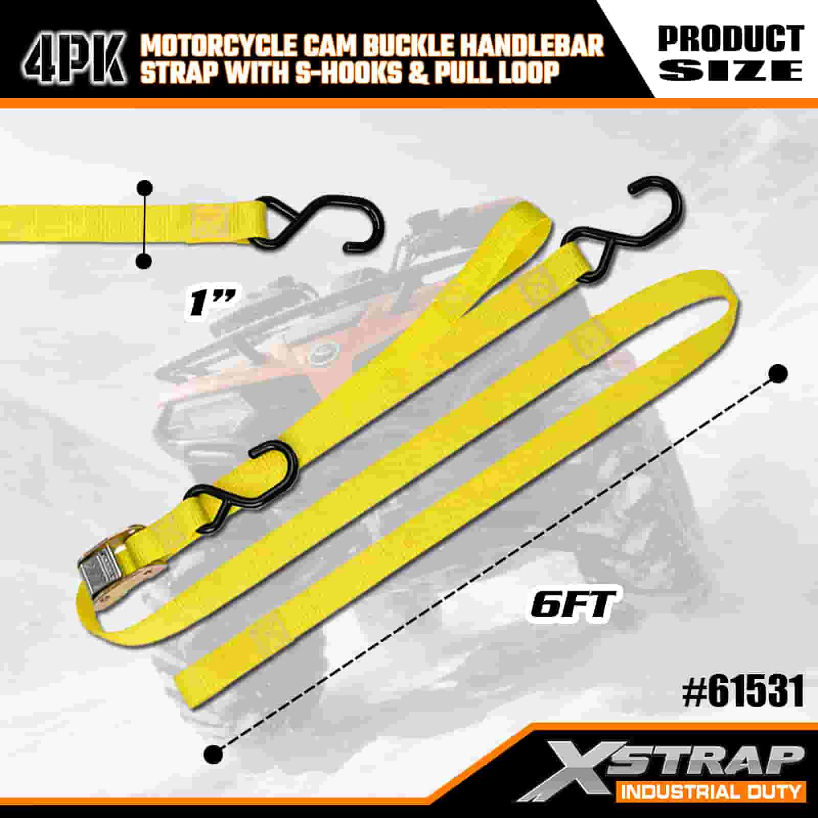 - 4-Pack 6FT Straps for Motorcycle Use: Sold as a 4-strap set (1 inch wide × 6 feet long), ideal for securing motorcycles, handlebars, and small gear in truck beds or during transport.