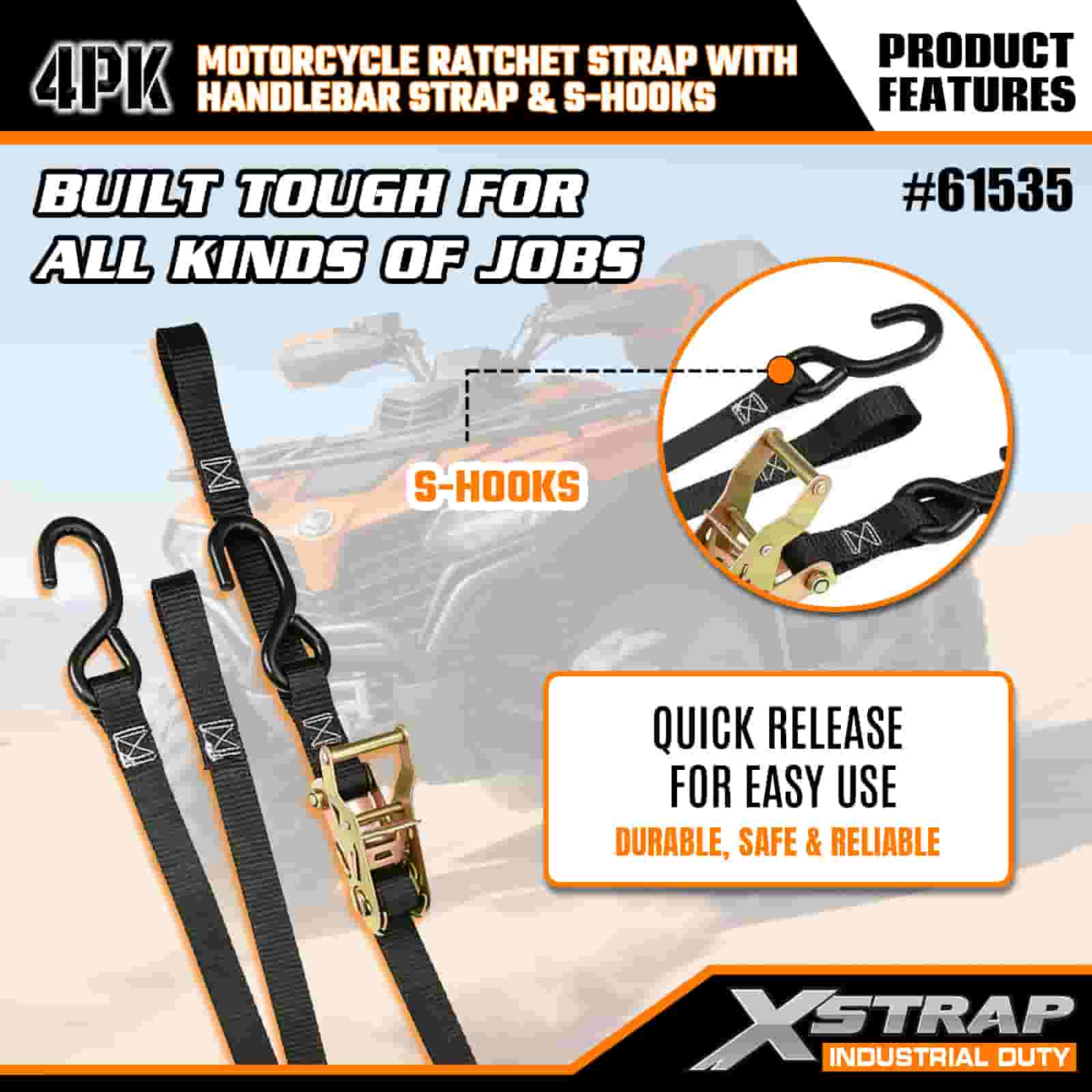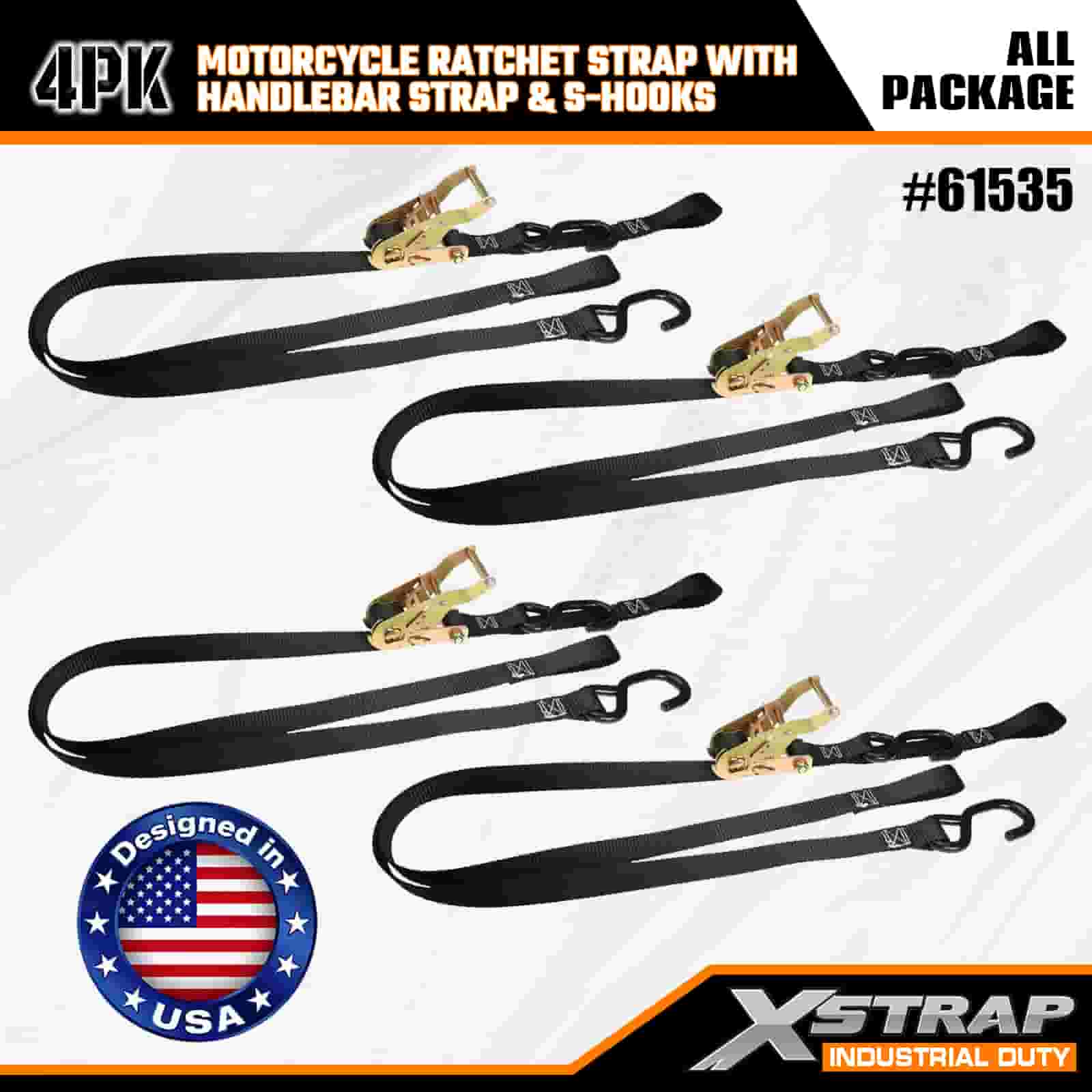 Xstrap 4PK Motorcycle Ratchet Strap with Handlebar Strap & S Hooks, 1” x 7’ Polyester Tie Down Strap Pull Ratchet Strap, 833lbs Capacity Cargo Lashing Securing Straps with S Hook for the Serious Professional to Secure Cargo Trailer, Flat Bed Trailer, Ski Boat, Small Car.