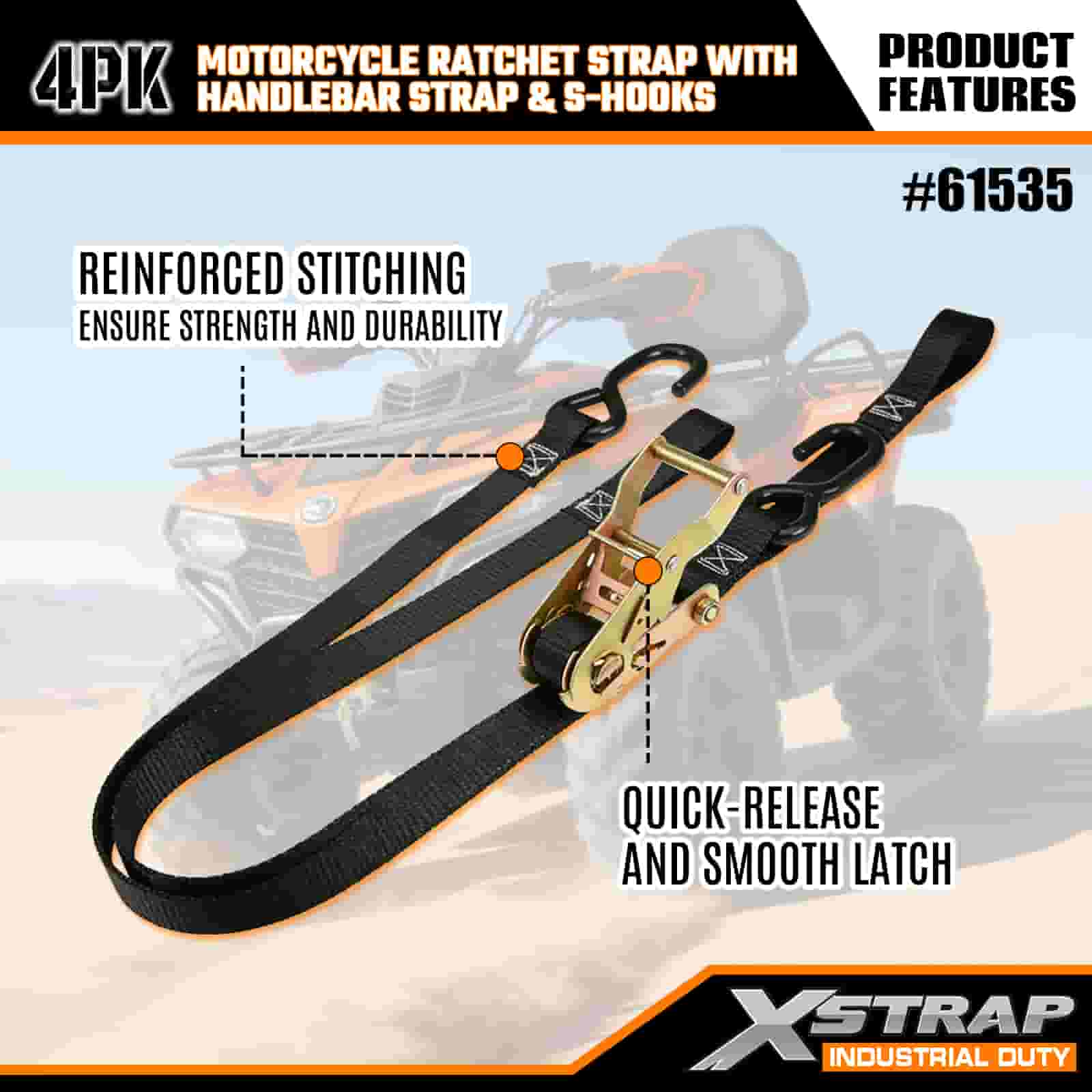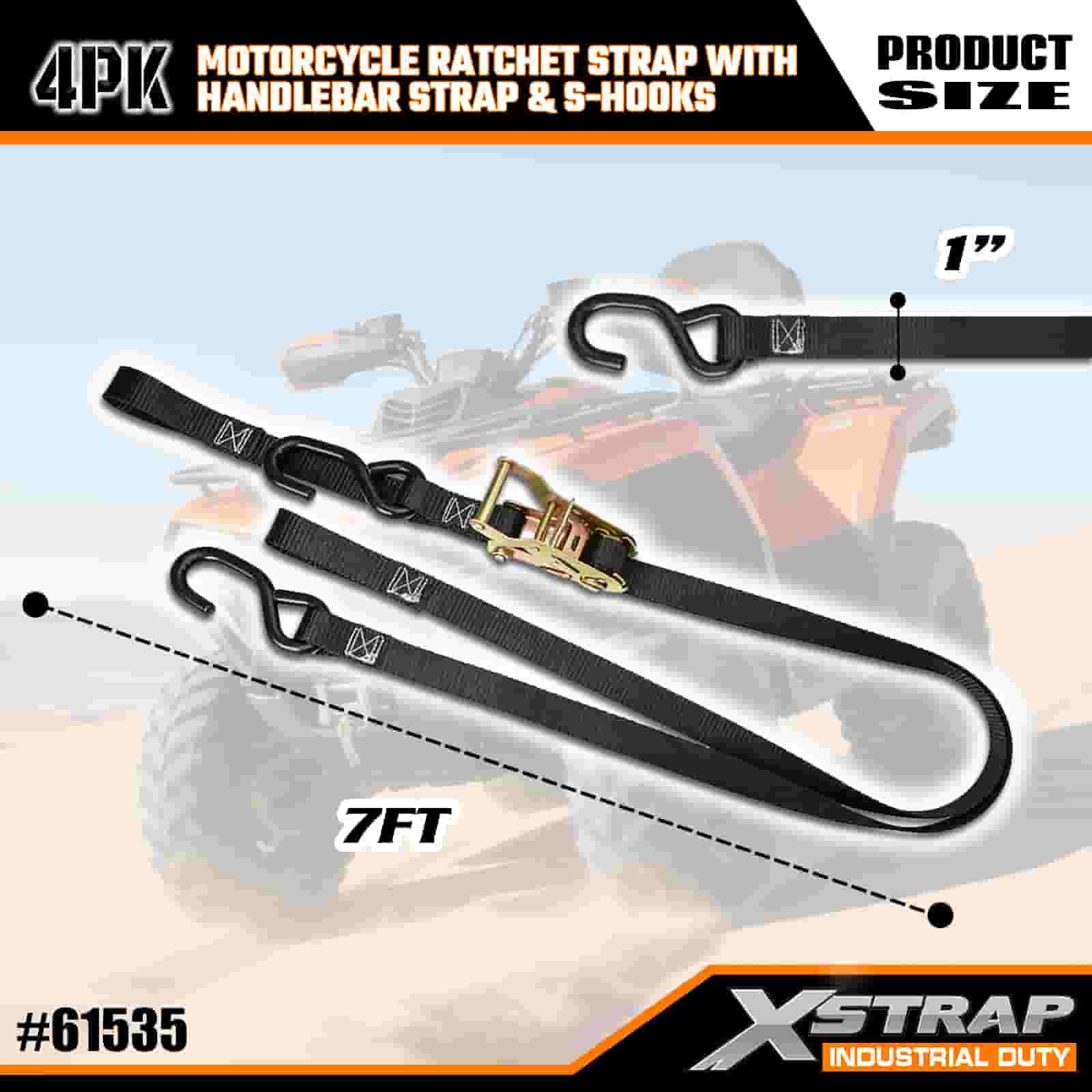 1” x 7’ 4PK Motorcycle Ratchet Strap with Handlebar Strap & S Hooks