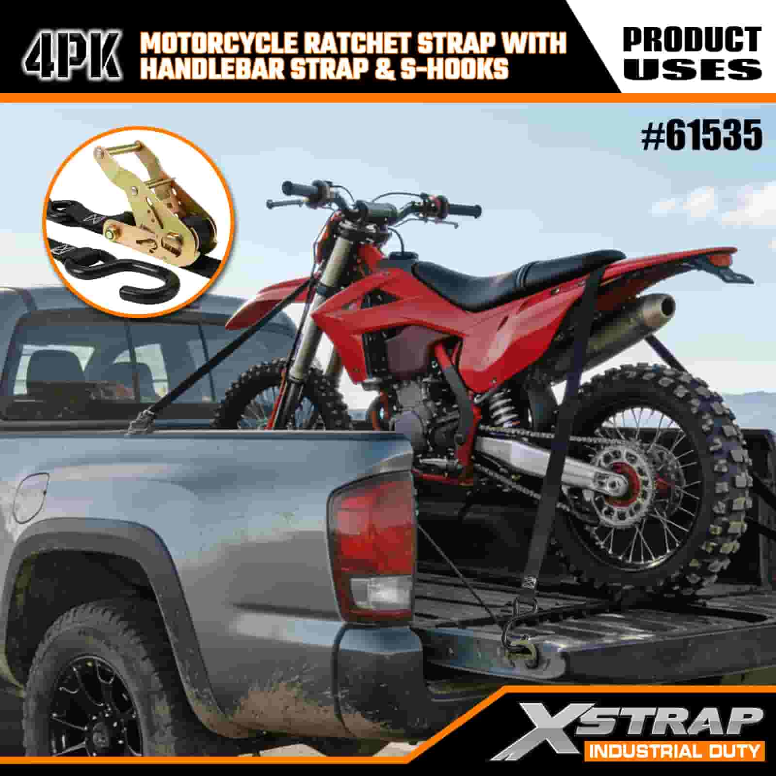 - 4-Pack 7FT Straps for Motorcycle Use: Sold as a 4-strap set (1 inch wide × 7 feet long), ideal for securing motorcycles, handlebars, and small gear in truck beds or during transport.