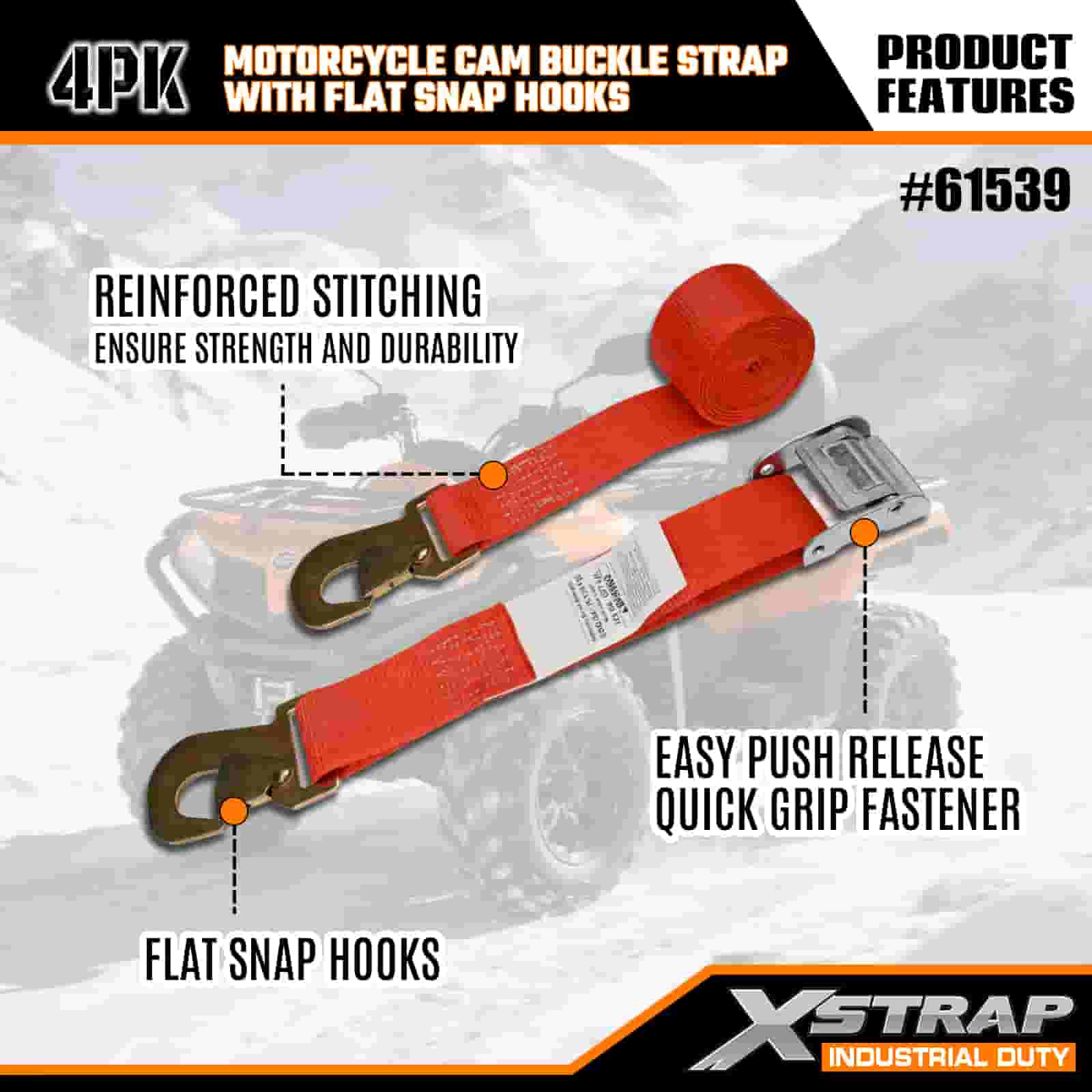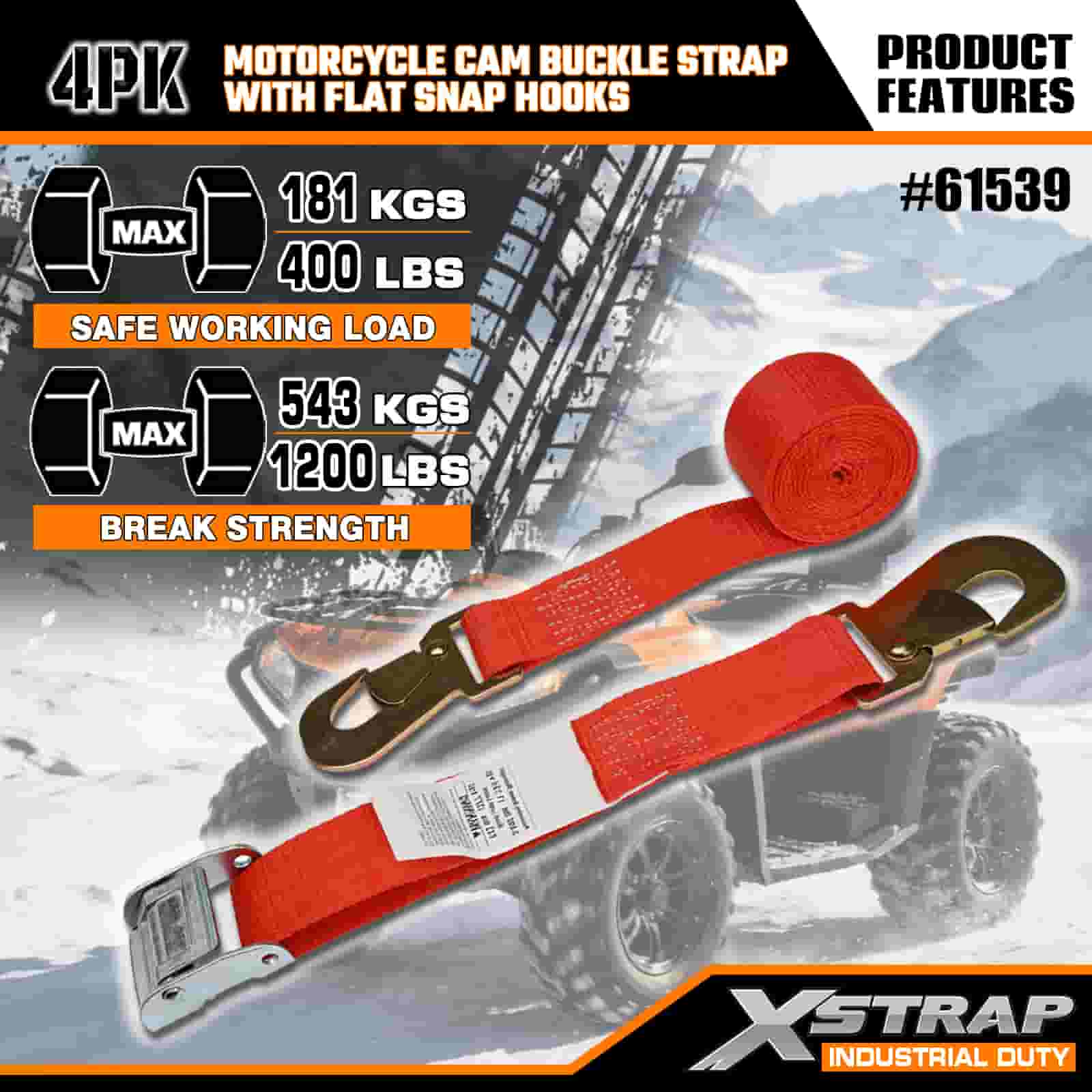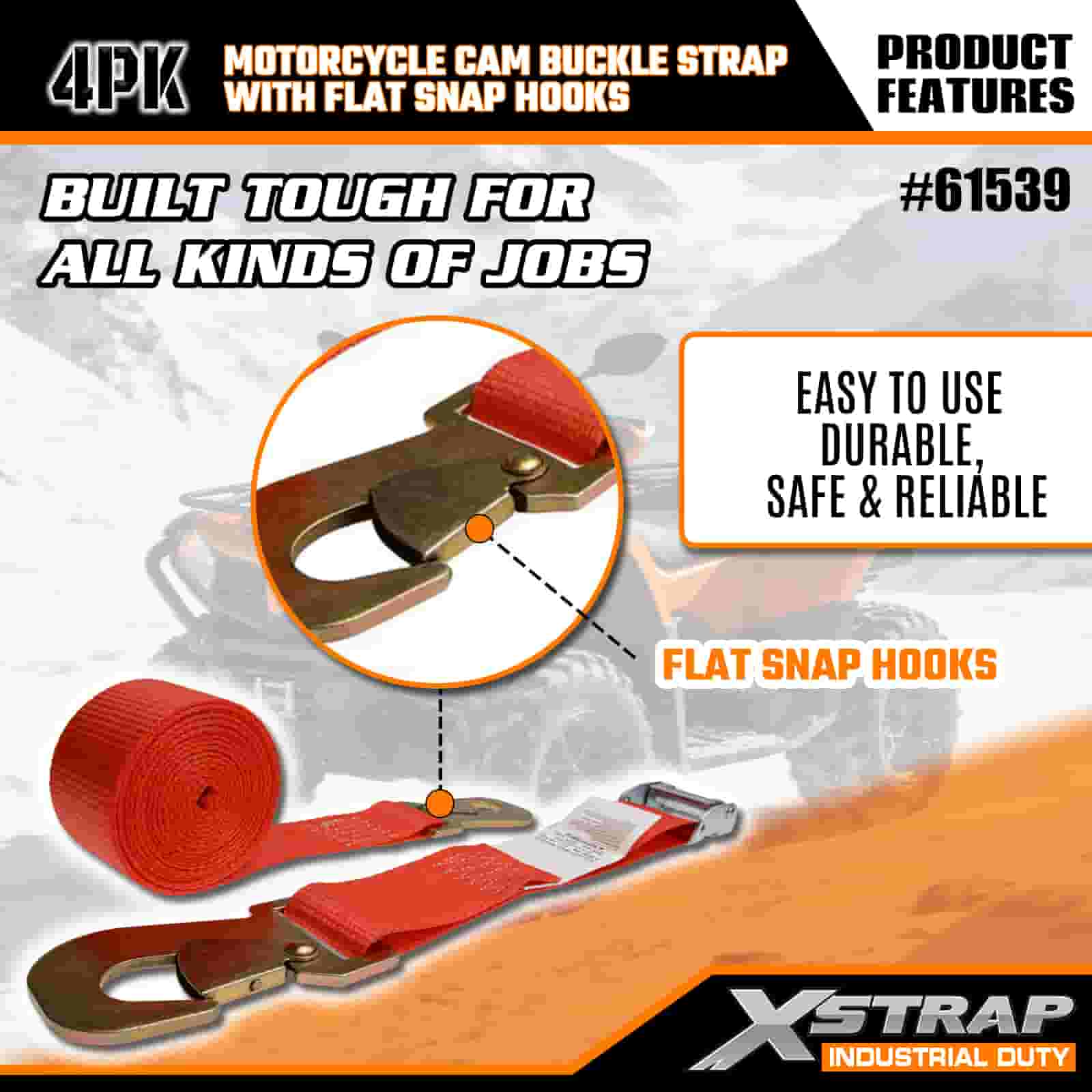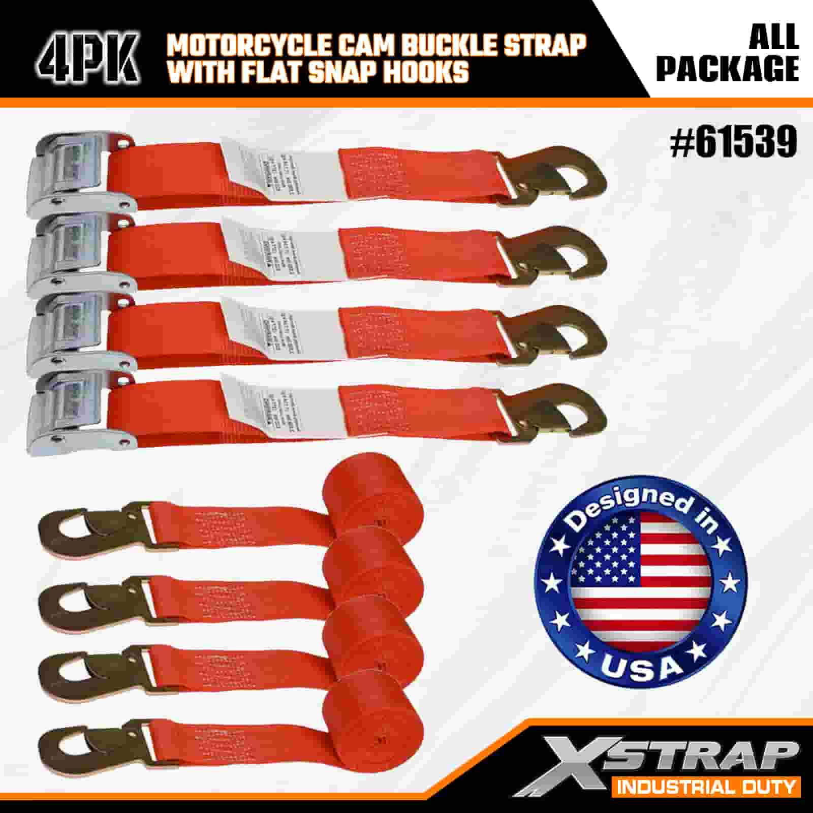 Xstrap 4PK Motorcycle Cam Buckle Strap with Flat Snap Hook, 2” x 8’ Polyester Tie Down Strap Pull Ratchet Buckle Strap, 400lbs Capacity Cargo Lashing Securing Straps with Flat Snap Hook for the Serious Professional to Secure Cargo Trailer, Flat Bed Trailer, Ski Boat, Small Car.