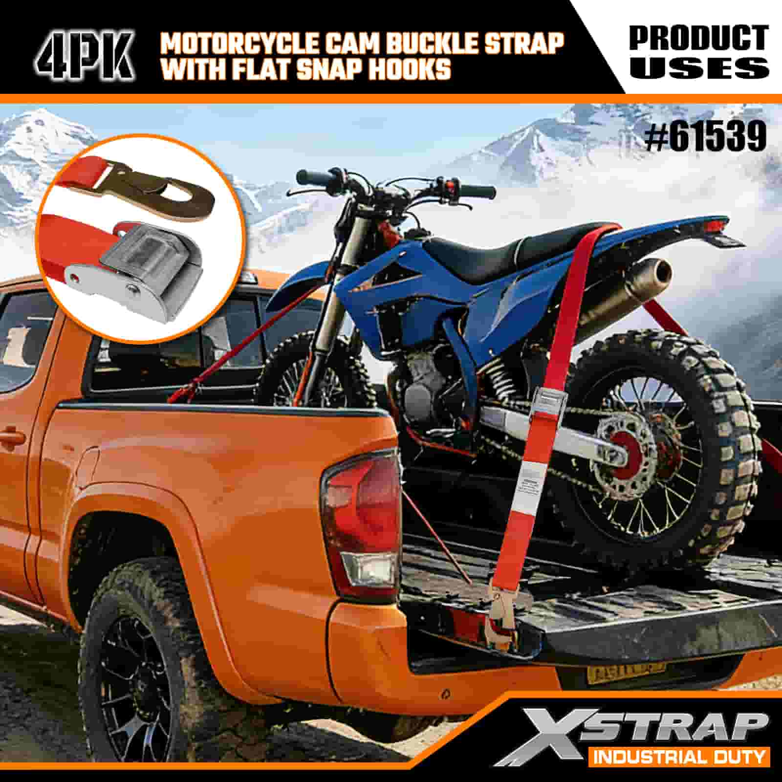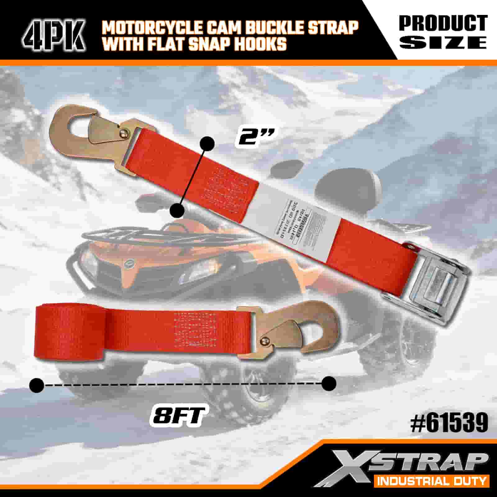 2” x 8’ 4PK Motorcycle Cam Buckle Strap with Flat Snap Hook