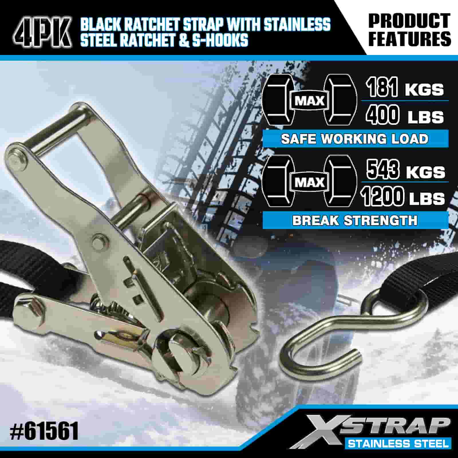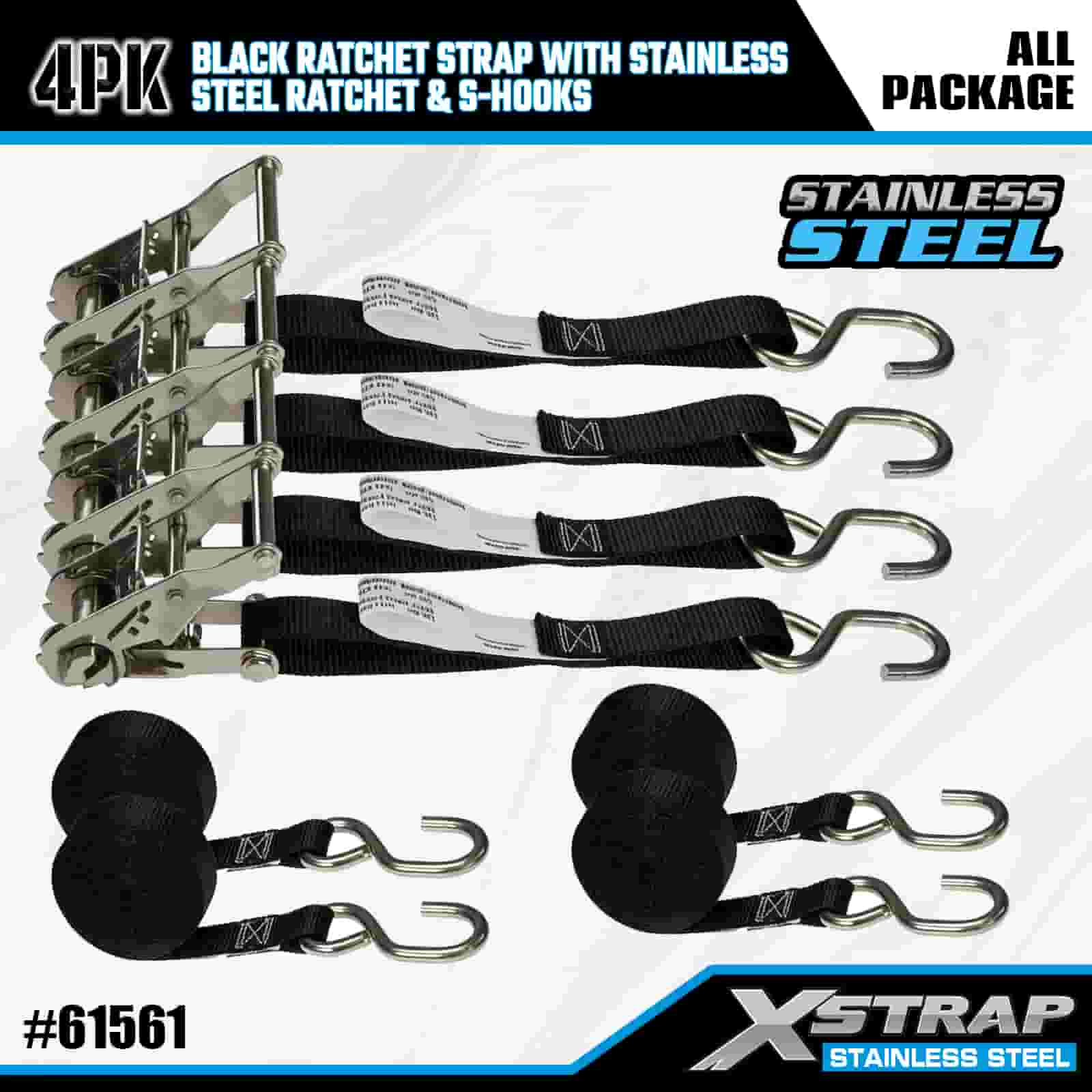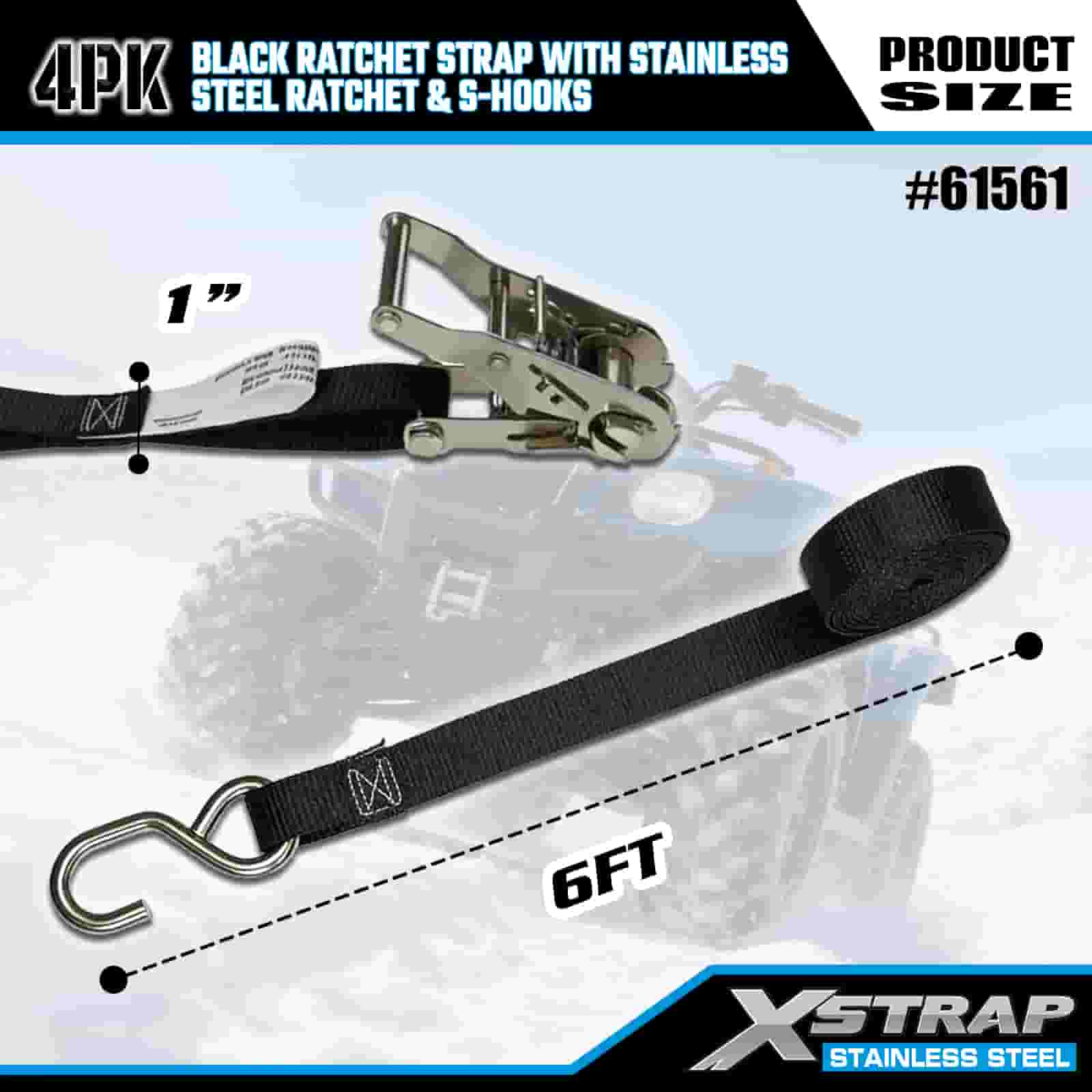 Xstrap 4PK Black Ratchet Strap with Stainless Steel Ratchet and S Hooks, 1” x 6’ Polyester Tie Down Strap Ratchet Strap, 400lbs Capacity Cargo Lashing Securing Straps with S Hooks for Trailer, Flat Bed Trailer Ski Boat, Small Car, Heavy Equipment.