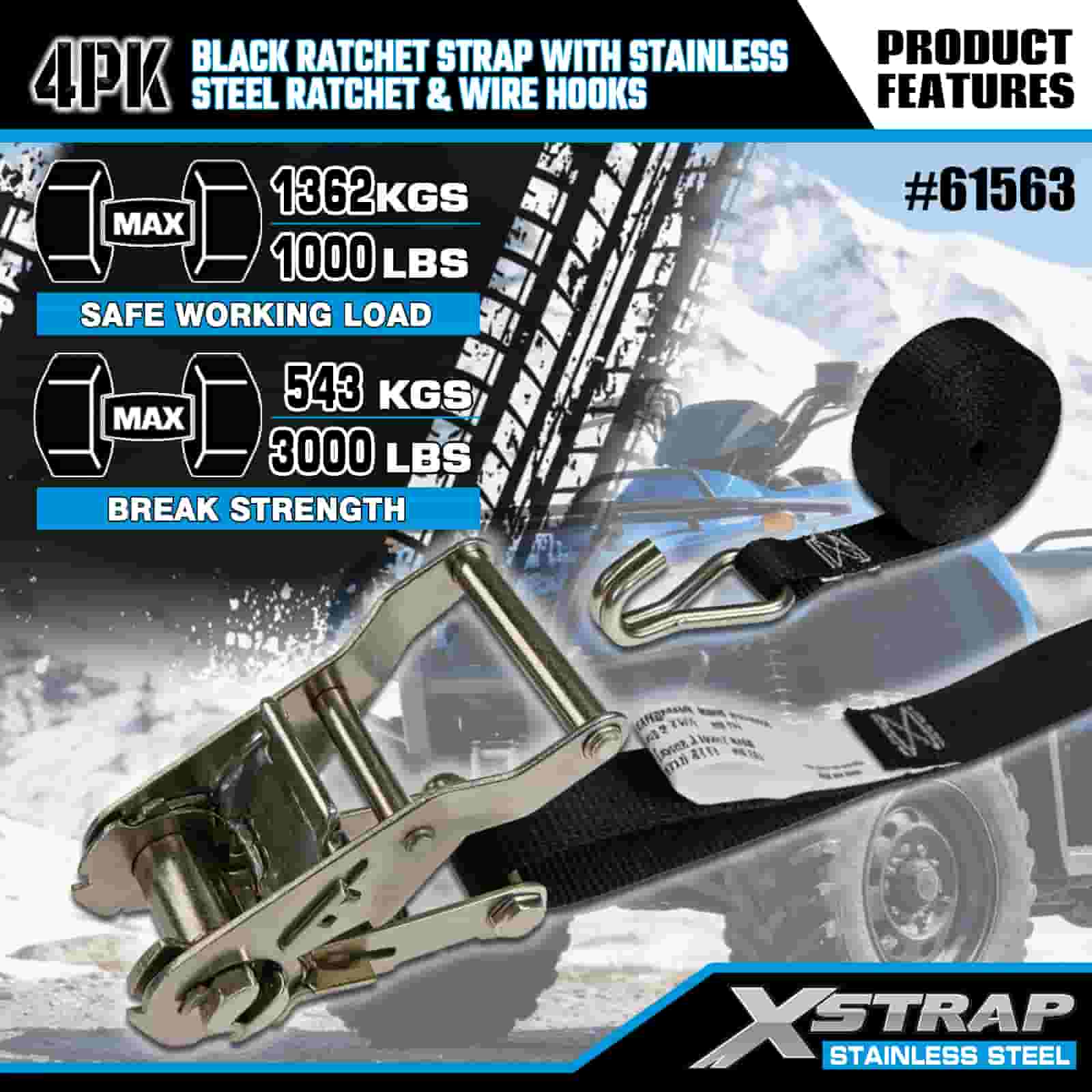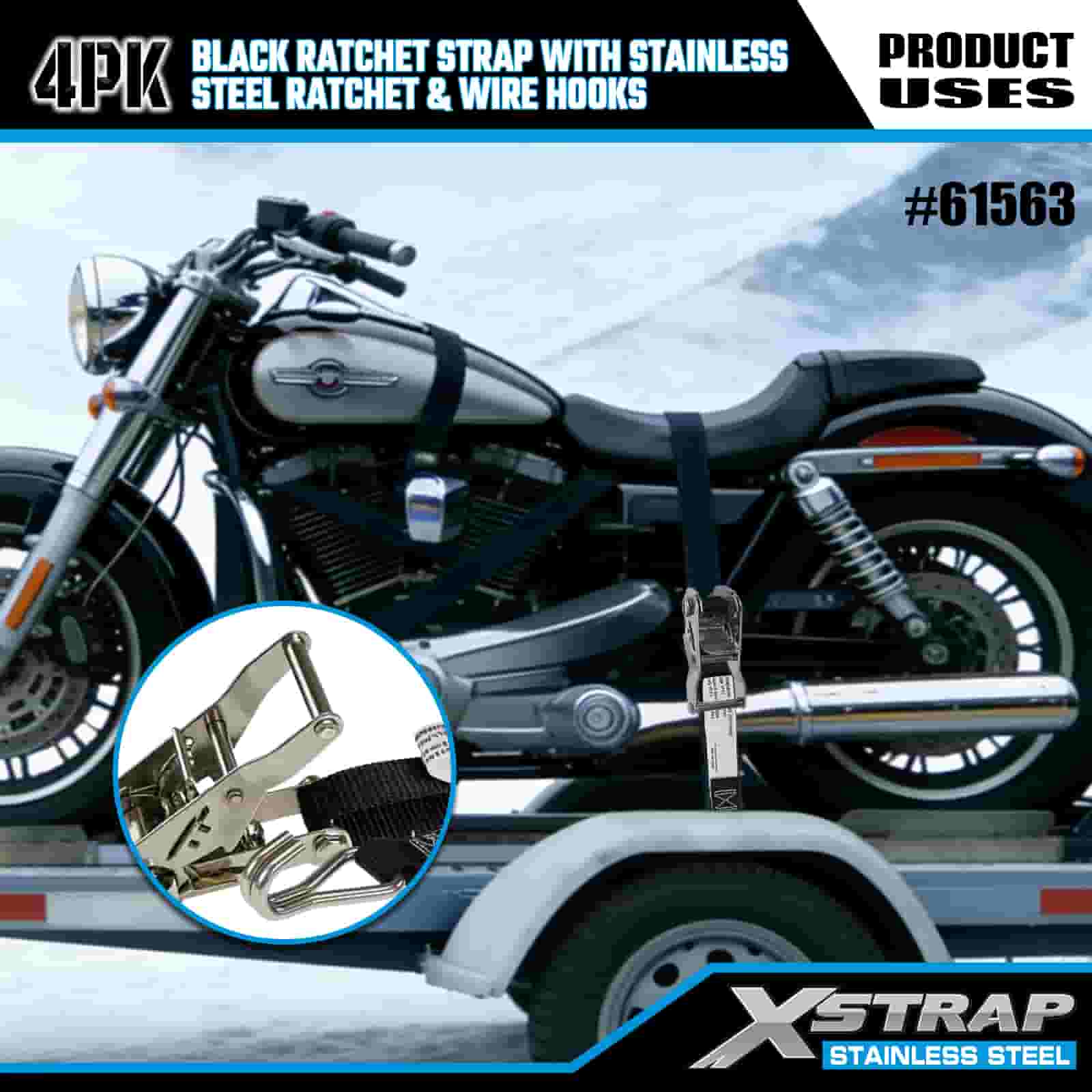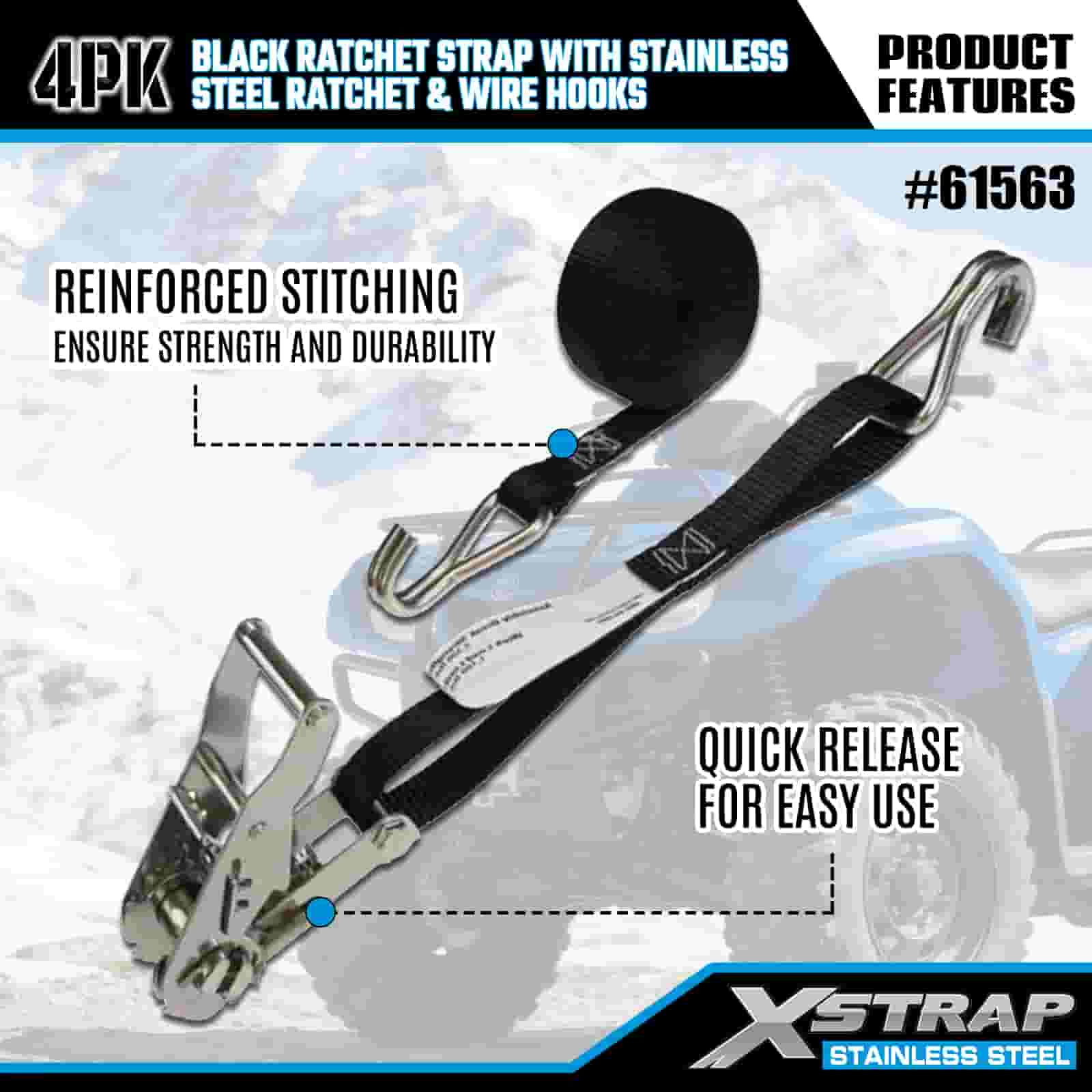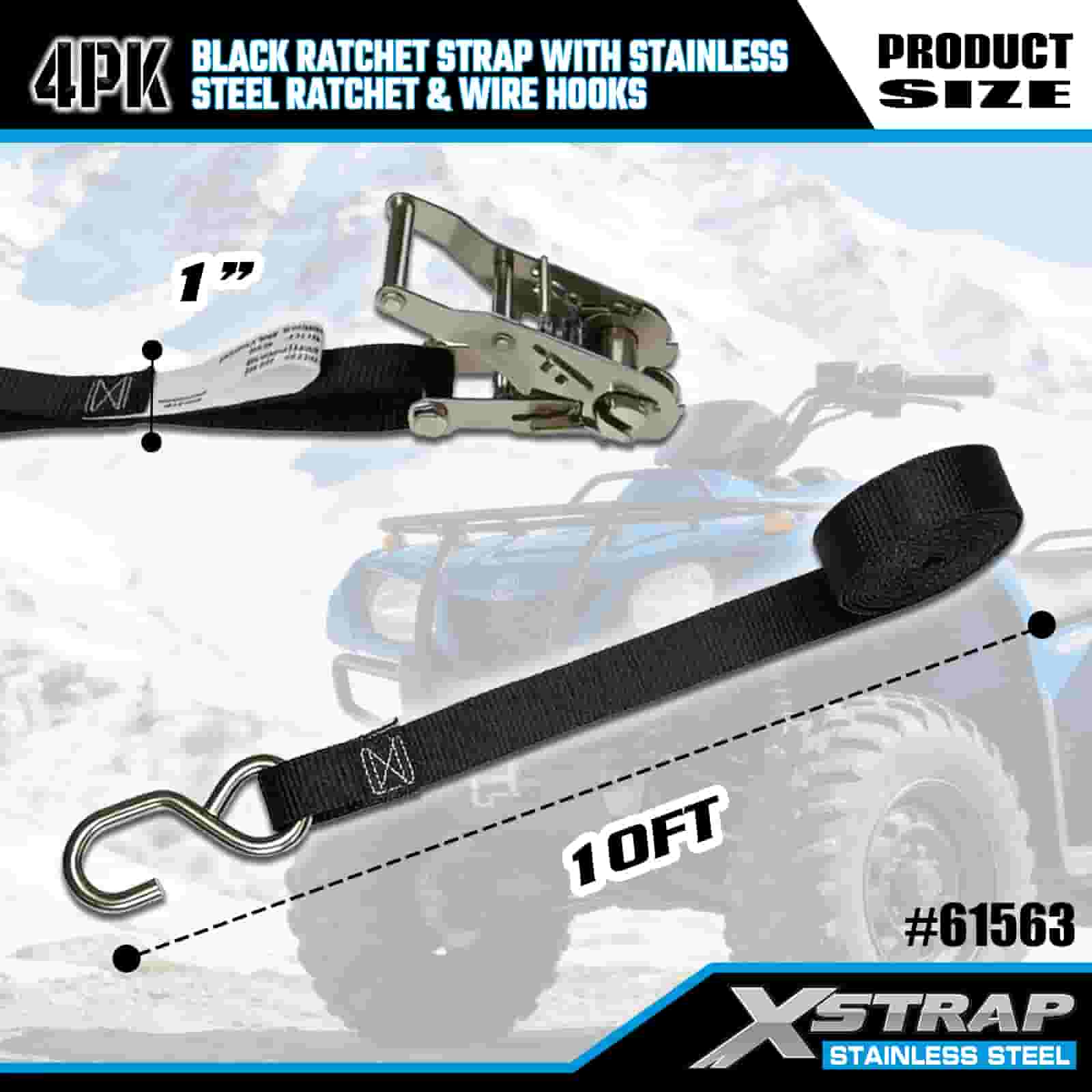 - Heavy-Duty Hauling Essential, Built for Off-Road & Urban UseDesigned for securing motorcycles, ATVs, and cargo in both rugged off-road and busy urban environments, this 4-pack of ratchet straps delivers uncompromising strength. Backed by XStrap’s 20+ years of cargo control expertise, you can trust your load stays locked, no matter the terrain.
