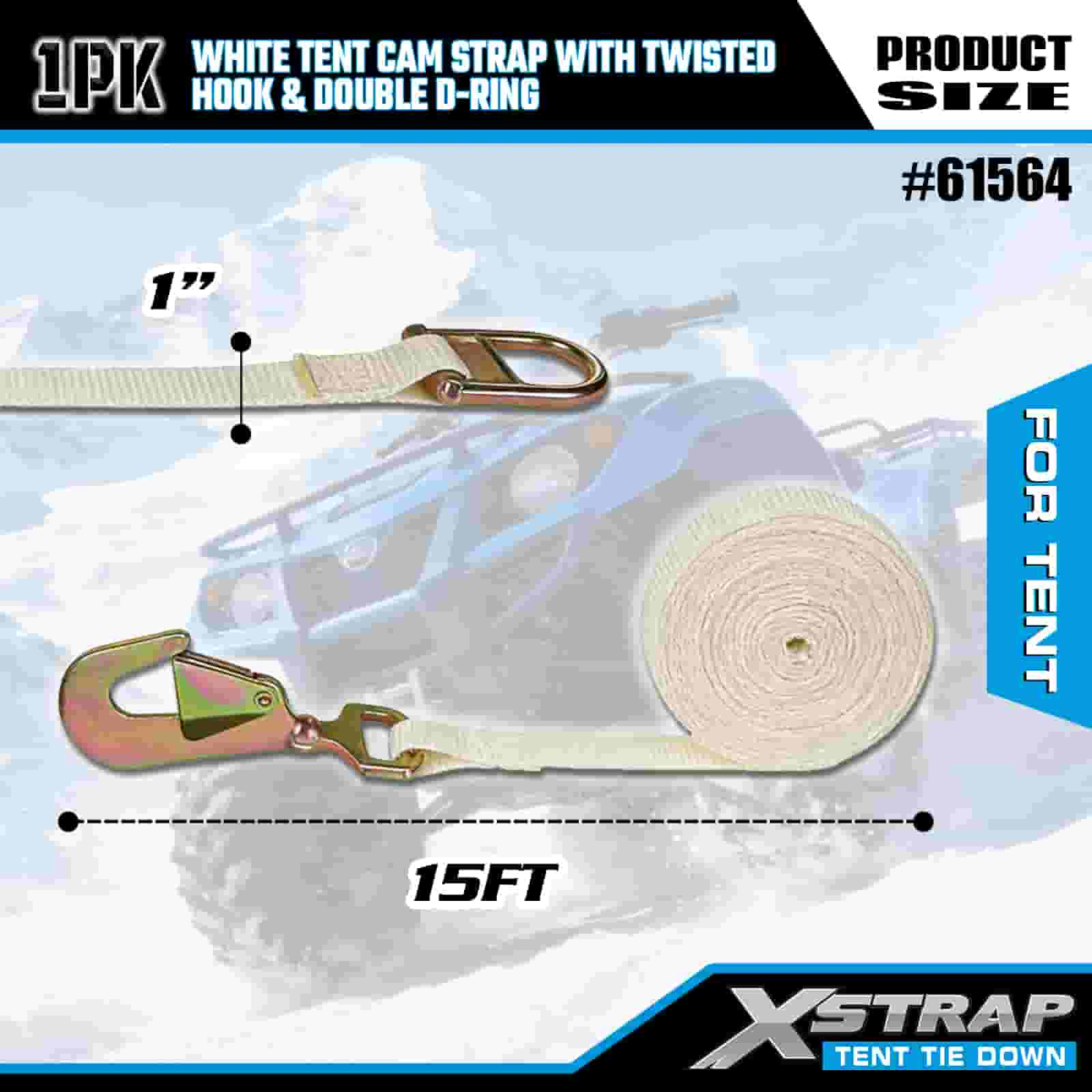 Xstrap White Tent Cam Strap with Twisted Hook and Double D Ring, 1” x 15’ Polyester Tie Down Strap Ratchet Strap, 440lbs Capacity Cargo Lashing Securing Straps with Twisted Hook and Double D Ring for Cargo Control, Tent fixation.