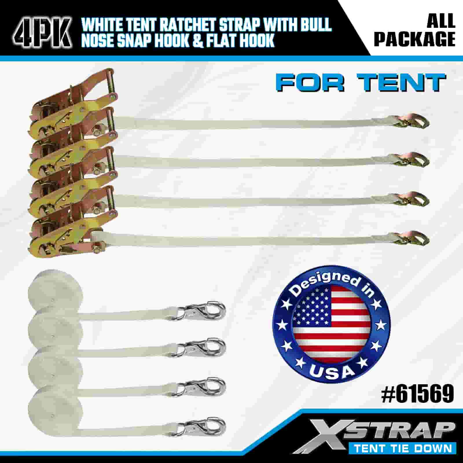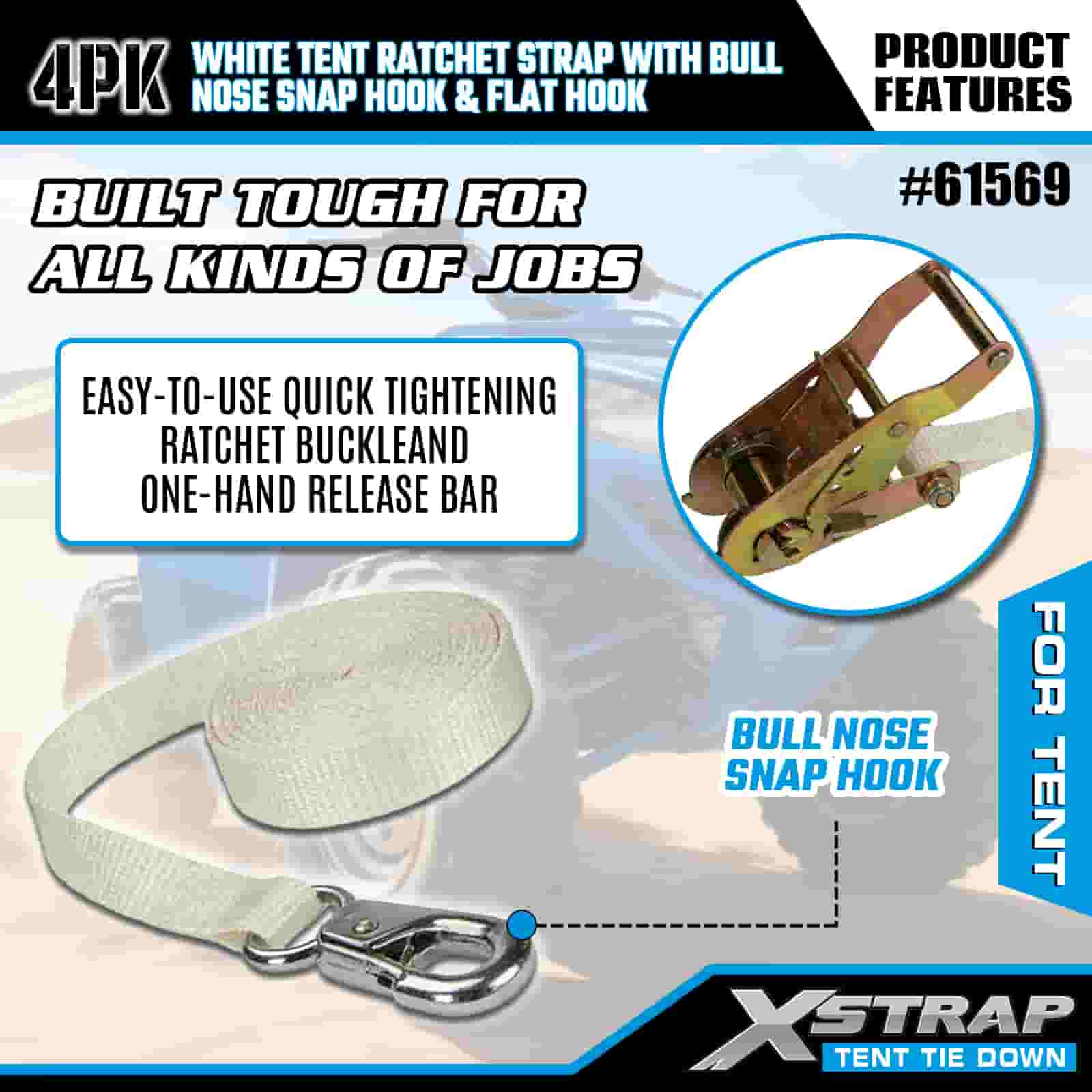 Xstrap 4PK White Tent Ratchet Strap with Bull Nose Snap Hook and Flat Hook, 1” x 12’ Polyester Tie Down Strap Ratchet Strap, 1100lbs Capacity Cargo Lashing Securing Straps with Nose Snap Hook and Flat Hook for Cargo Control, Tent fixation.