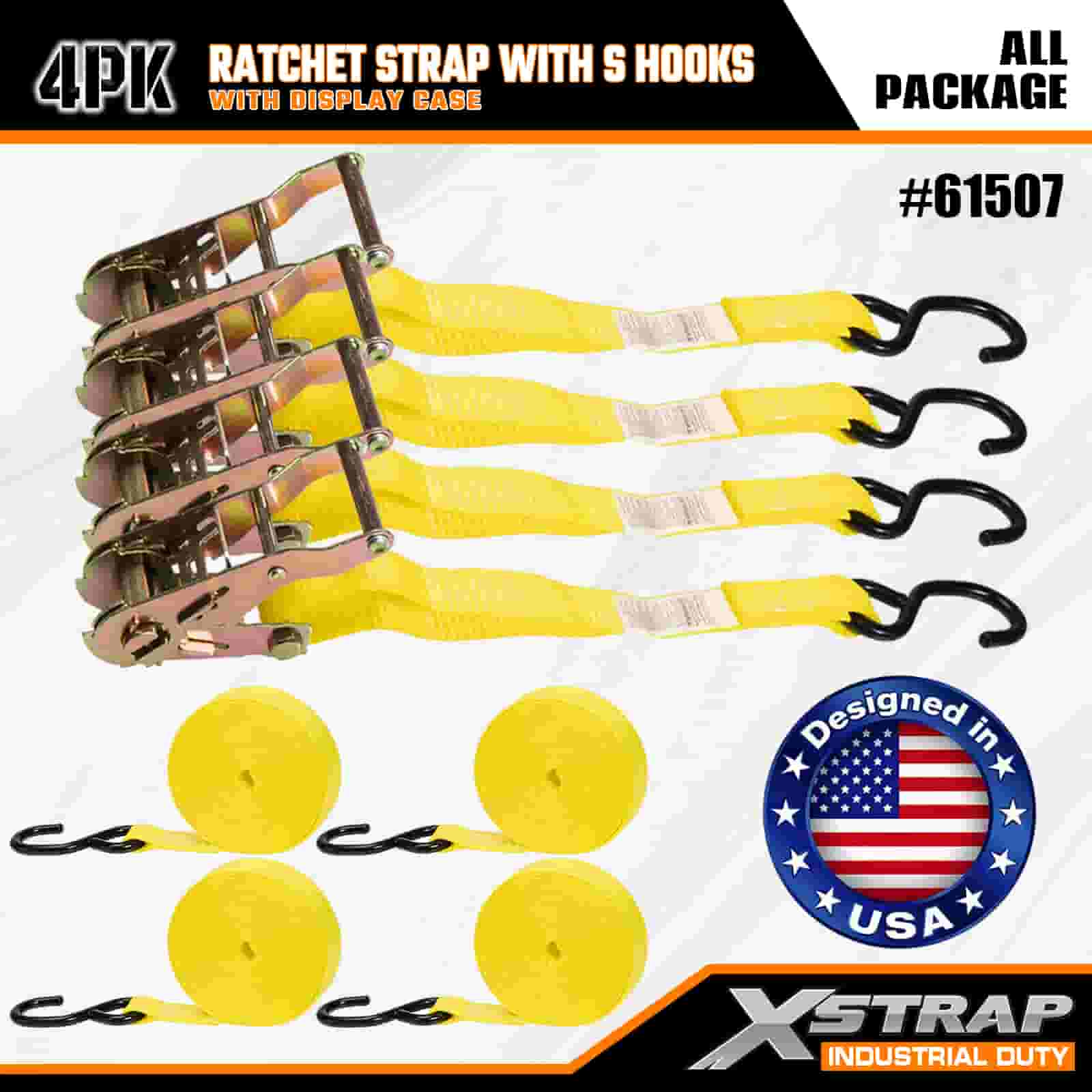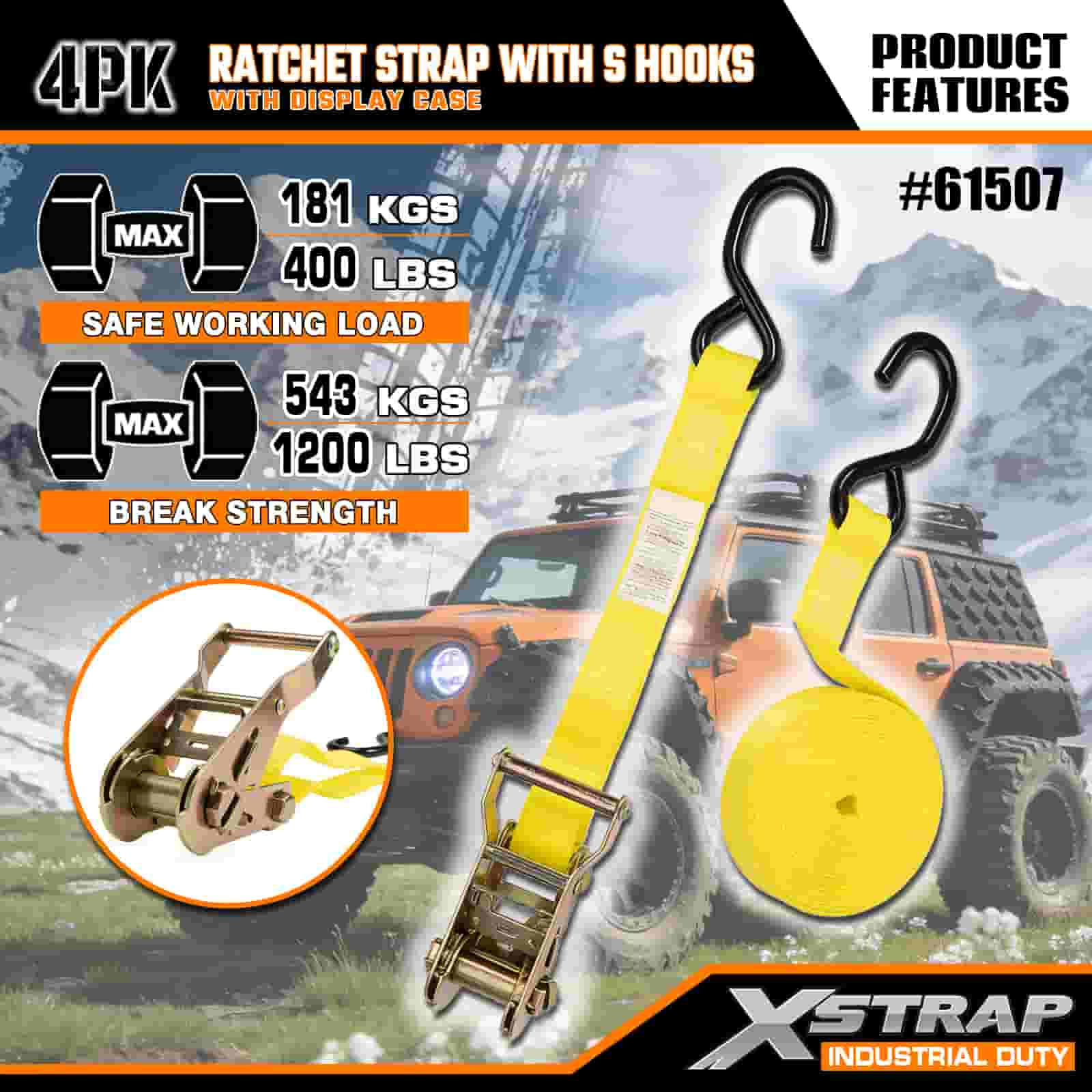 Xstrap 4 Pack Ratchet Strap with S Hooks, 1” x 15’ Polyester Tie Down Strap Pull Ratchet Strap, 400lbs Capacity Cargo Lashing Securing Straps with S Hooks for the Serious Professional to Secure Cargo Trailer, Flat Bed Trailer, Ski Boat, Small Car.
