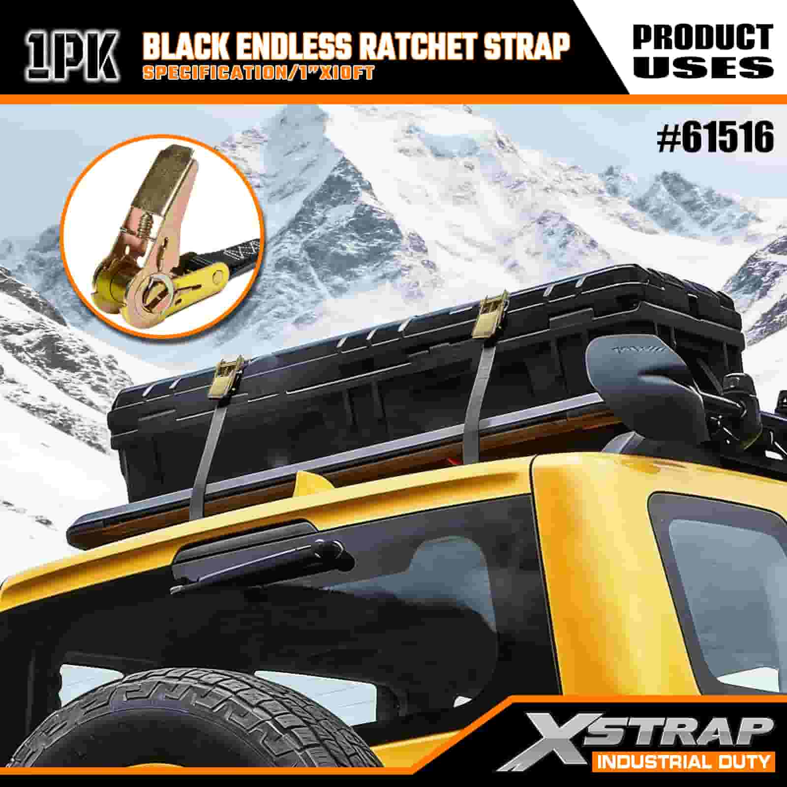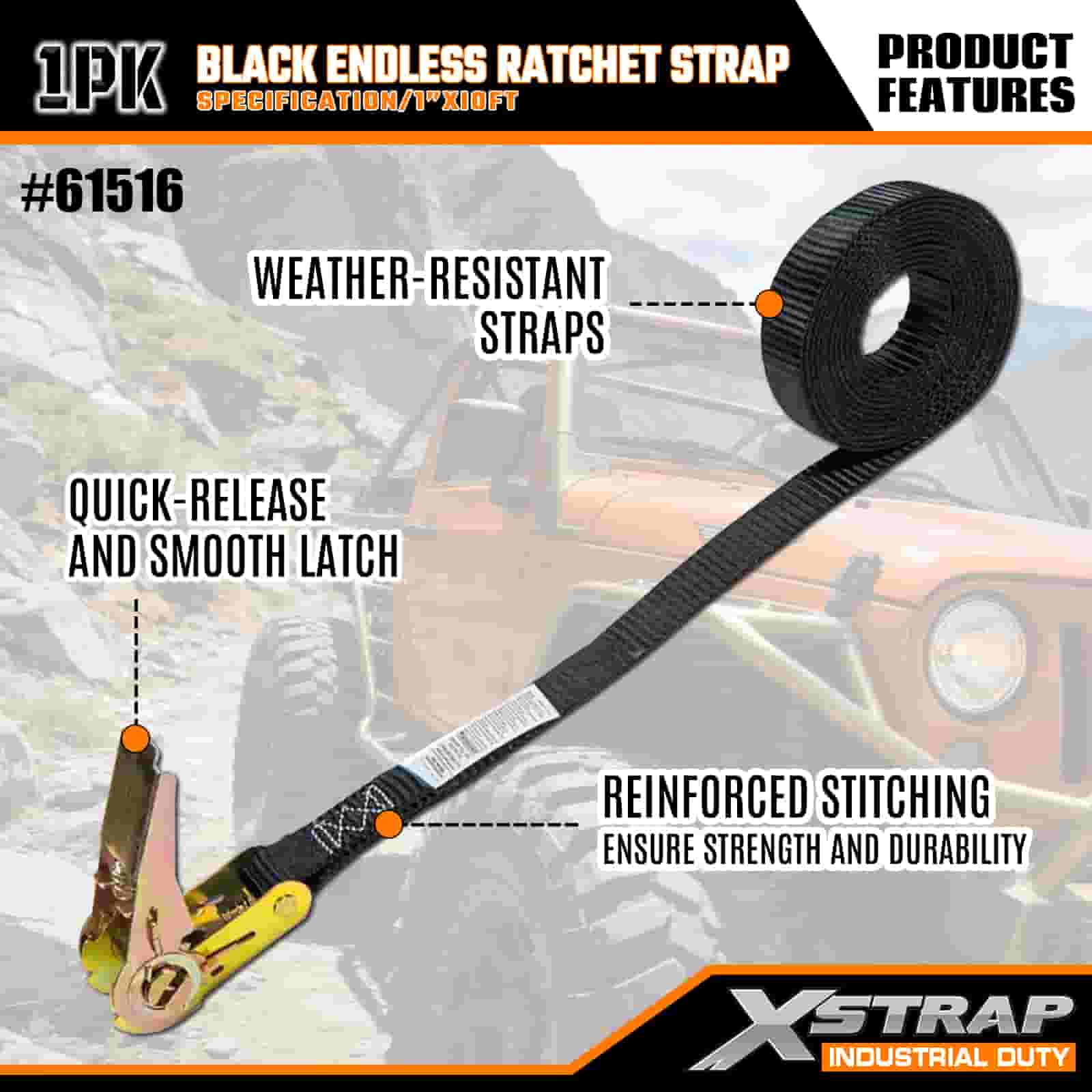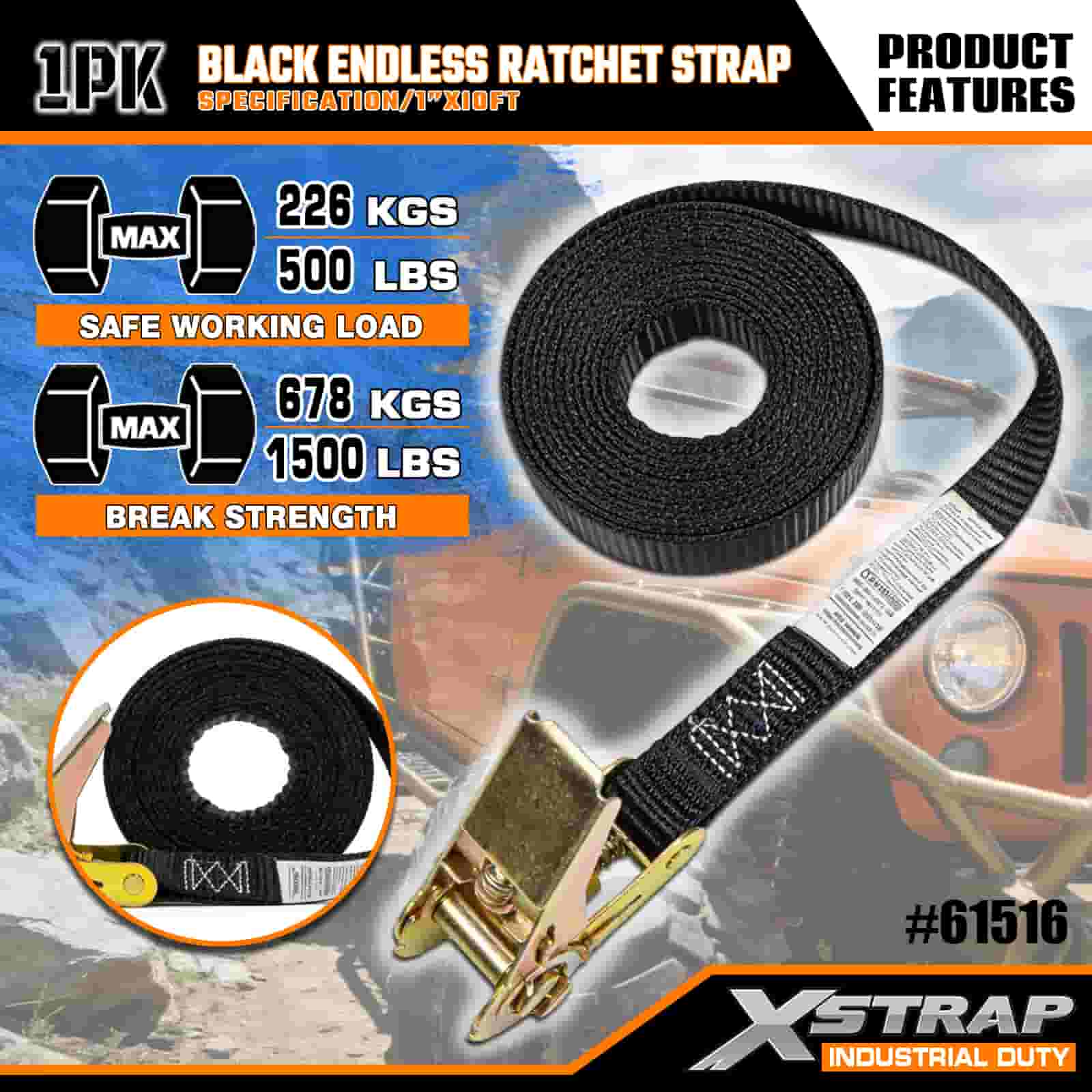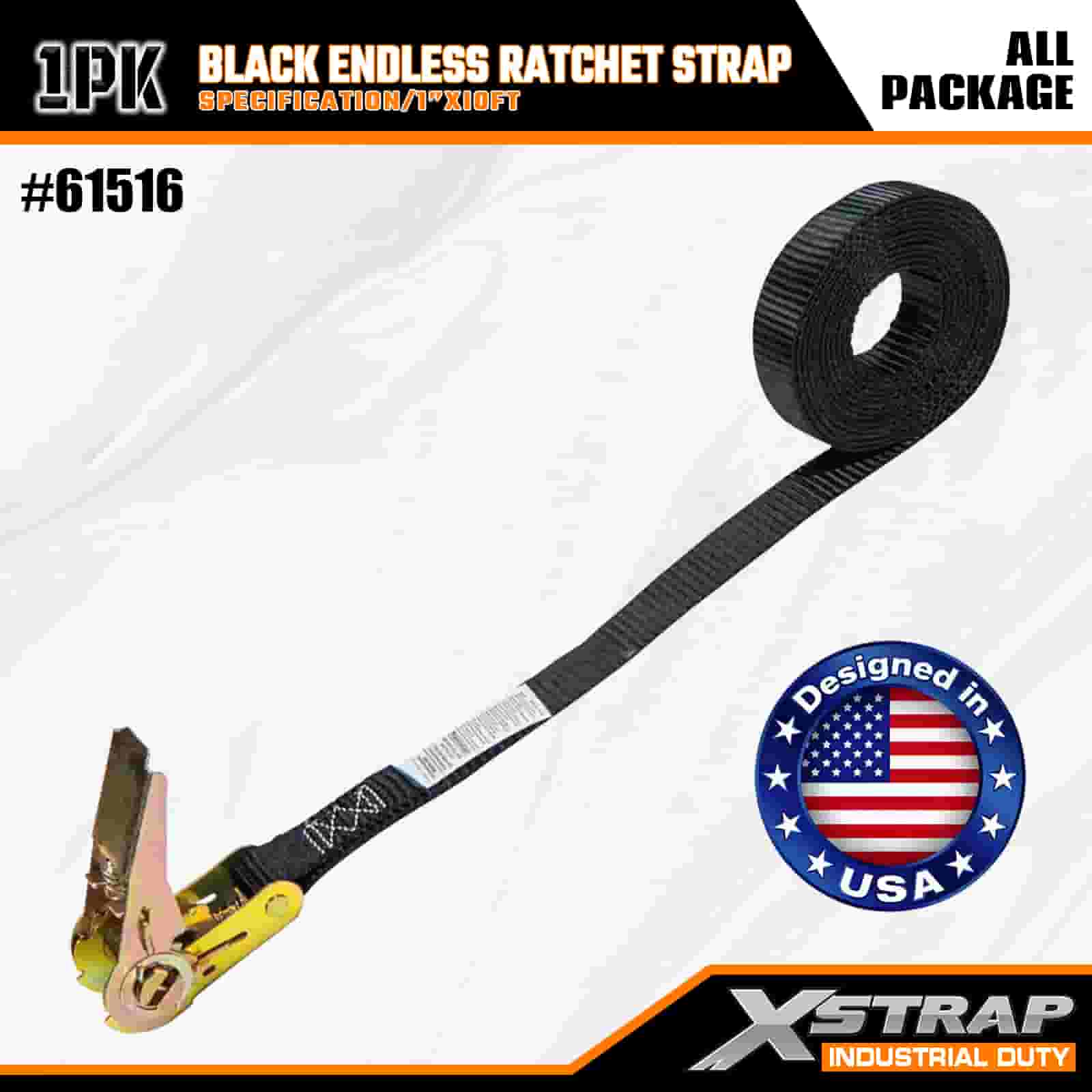 Xstrap Black Endless Ratchet Strap, 1” x 10’ Polyester Tie Down Strap Pull Ratchet Strap, 500lbs Capacity Cargo Lashing Securing Straps for the Serious Professional to Secure Cargo Trailer, Flat Bed Trailer, Ski Boat, Small Car.