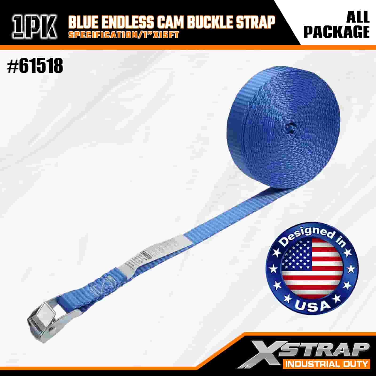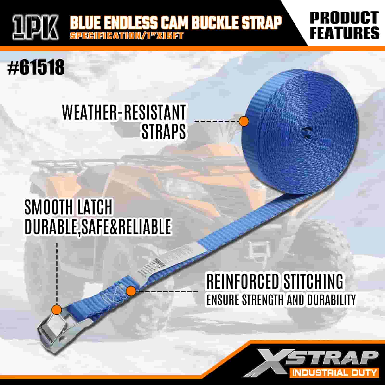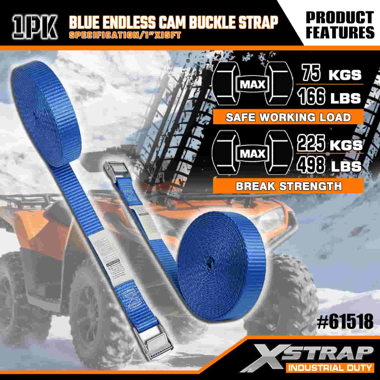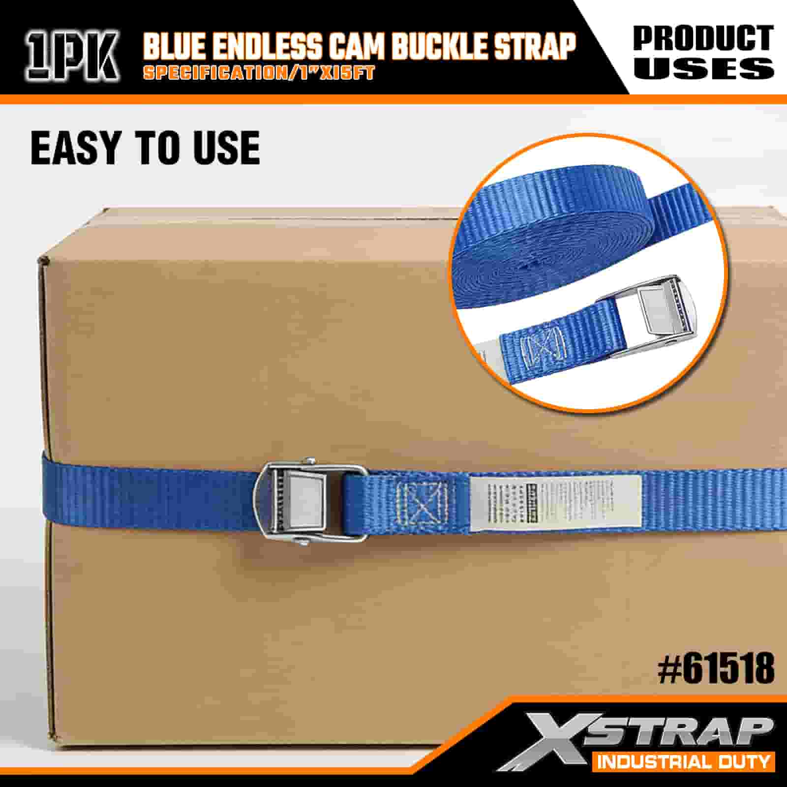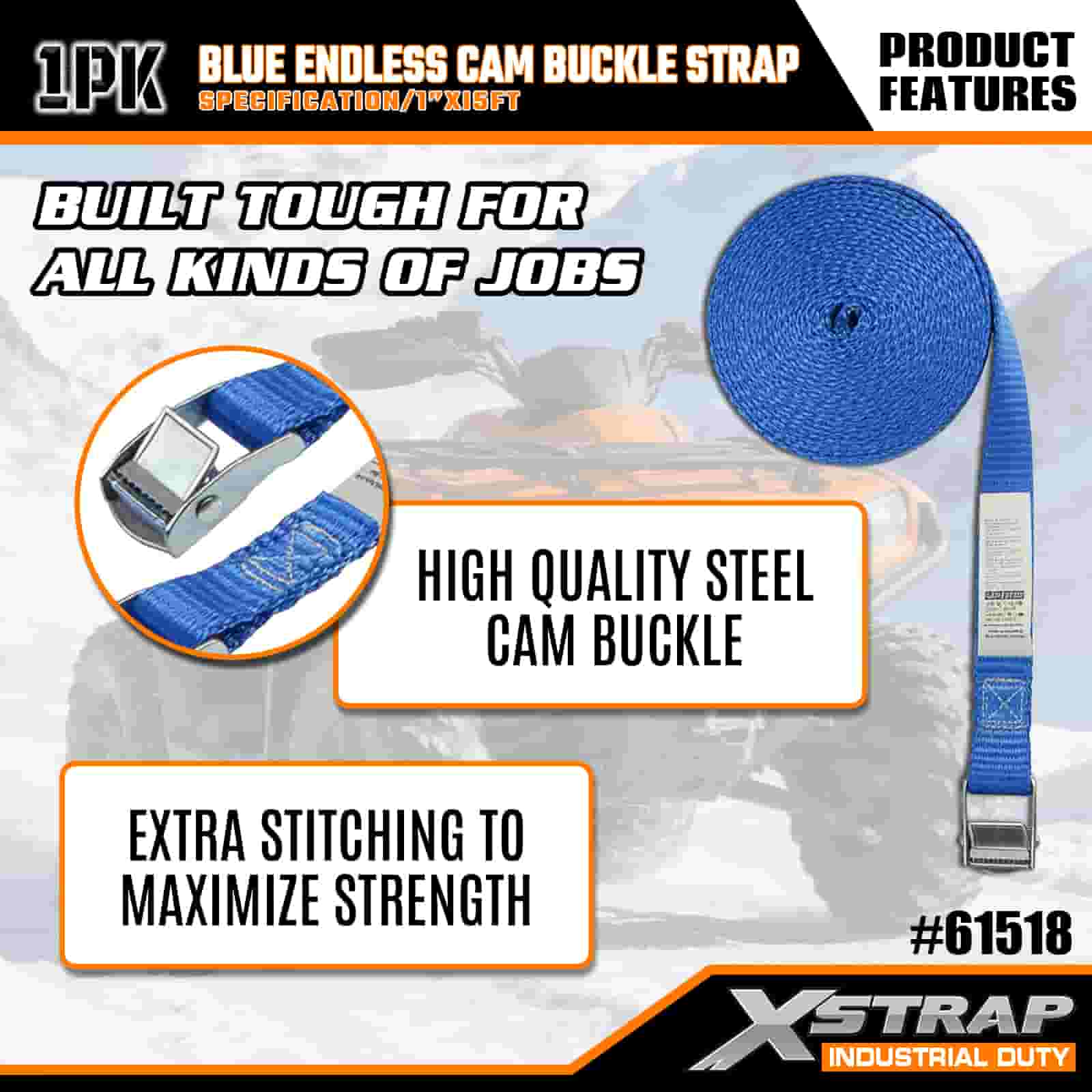 Xstrap Blue Endless Cam Buckle Strap, 1” x 15’ Polyester Tie Down Strap Pull Ratchet Strap, 166lbs Capacity Cargo Lashing Securing Straps for the Serious Professional to Secure Cargo Trailer, Flat Bed Trailer, Ski Boat, Small Car.