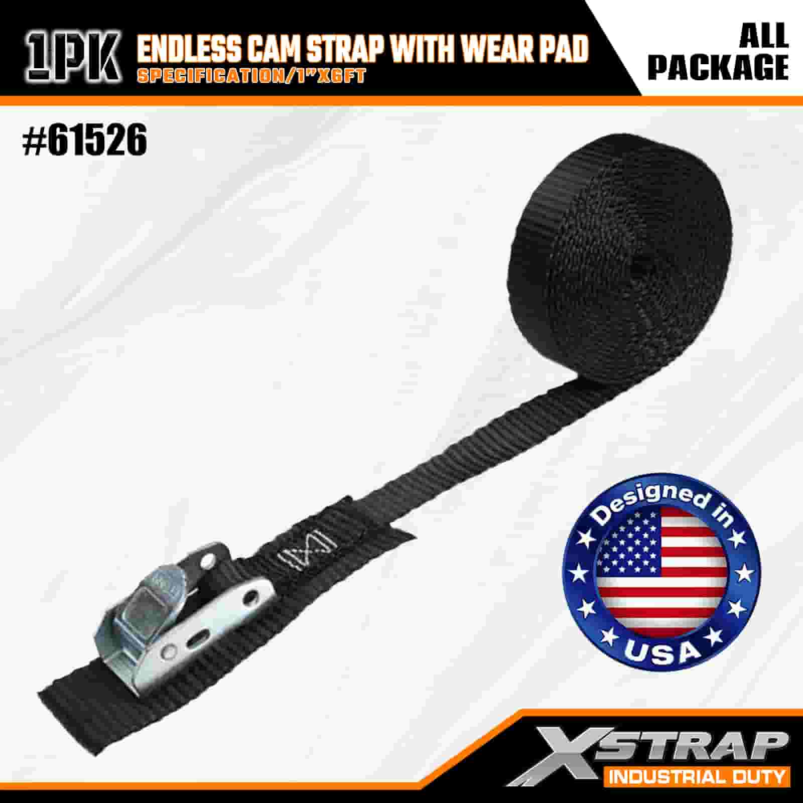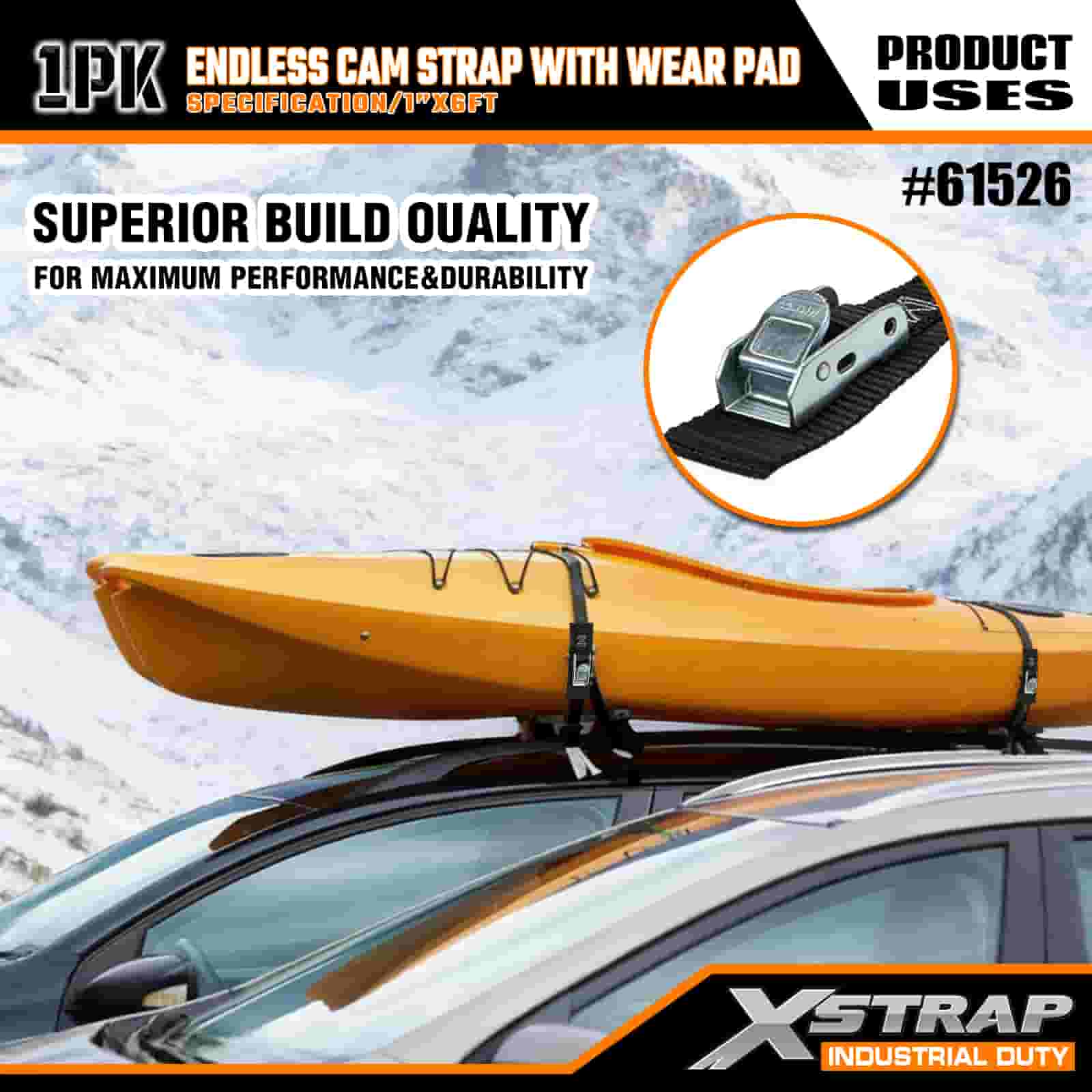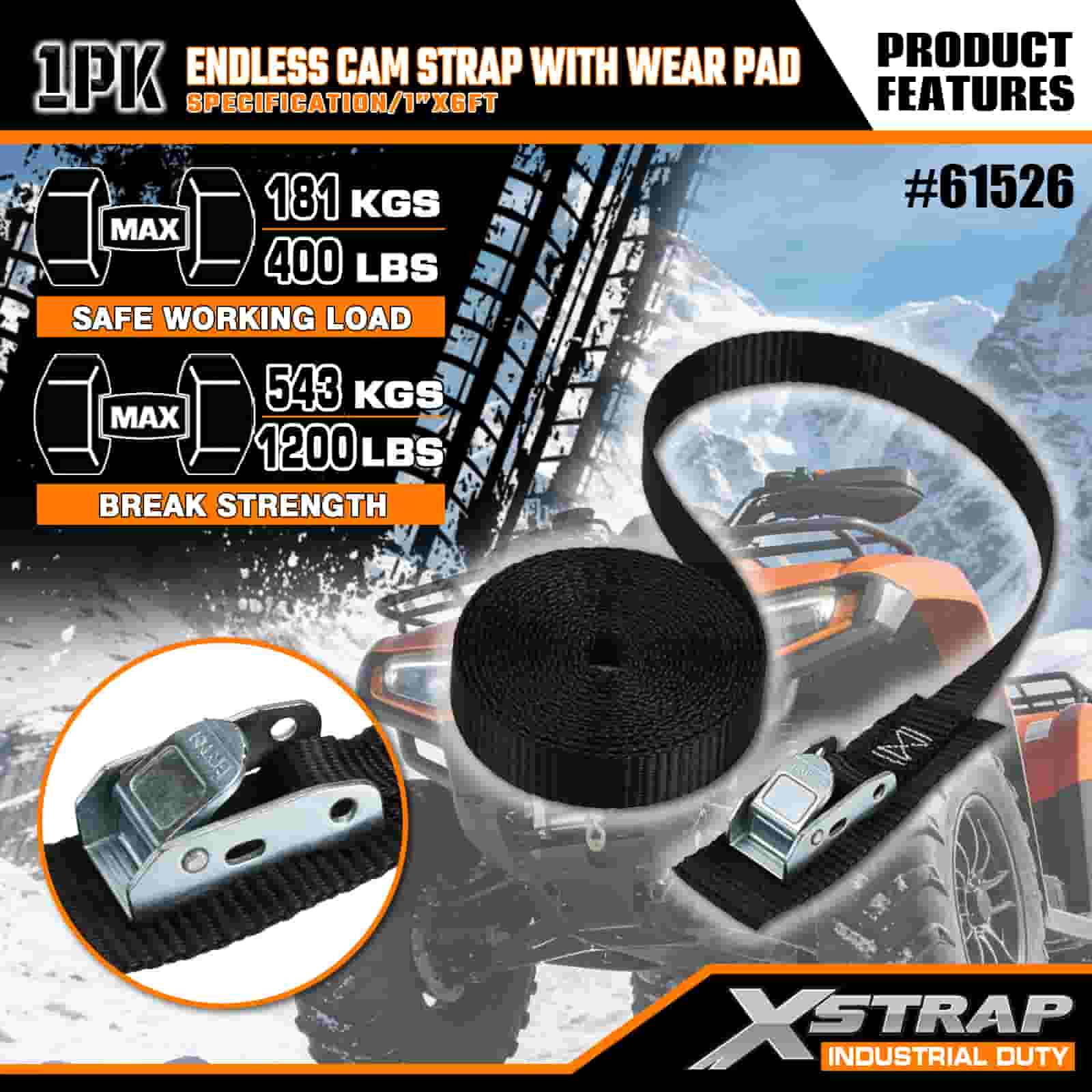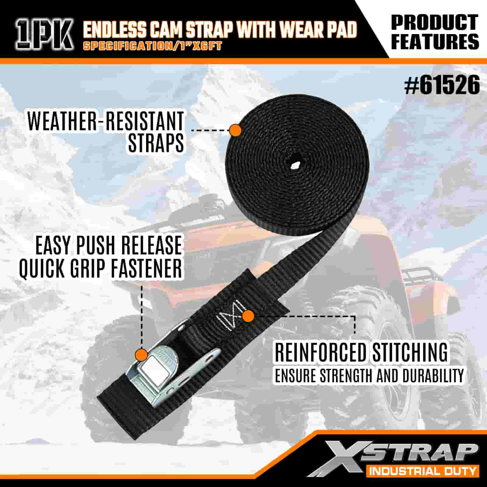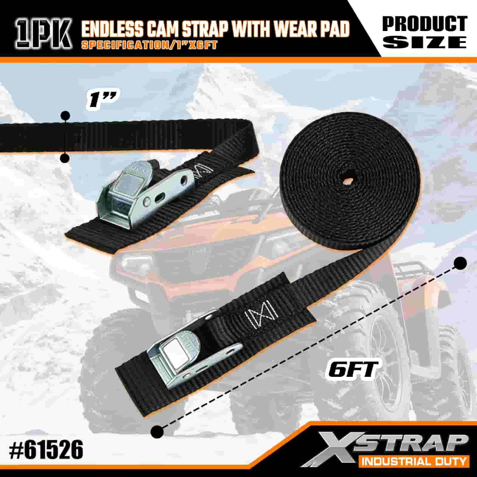 Xstrap Endless Cam Strap with Wear Pad, 1” x 6’ Polyester Tie Down Strap Pull Cam Buckle Strap, 400lbs Capacity Cargo Lashing Securing Straps for the Serious Professional to Secure Cargo Trailer, Flat Bed Trailer, Ski Boat, Small Car.