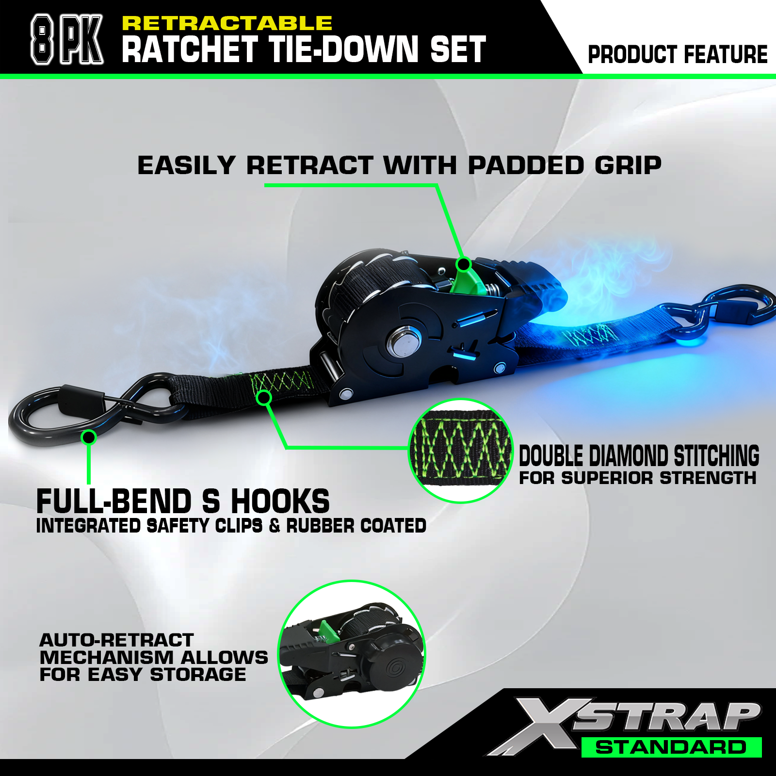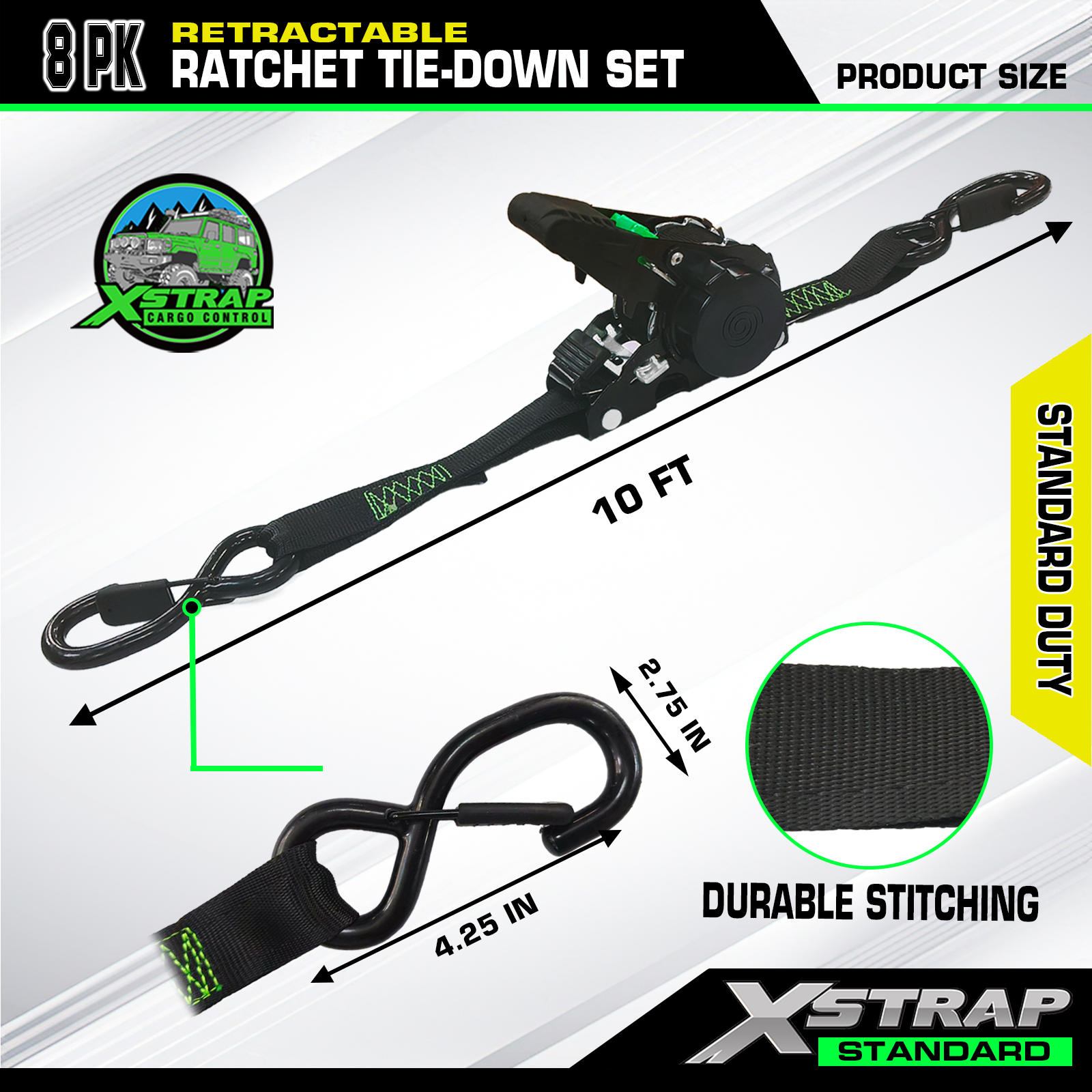 - High quality retractable ratchet tie down straps- the working load is 500lbs and the limited load is 1500lbs. The straps will be tested before they are shipped out. So we can ensure your cargo is secure during transportation.