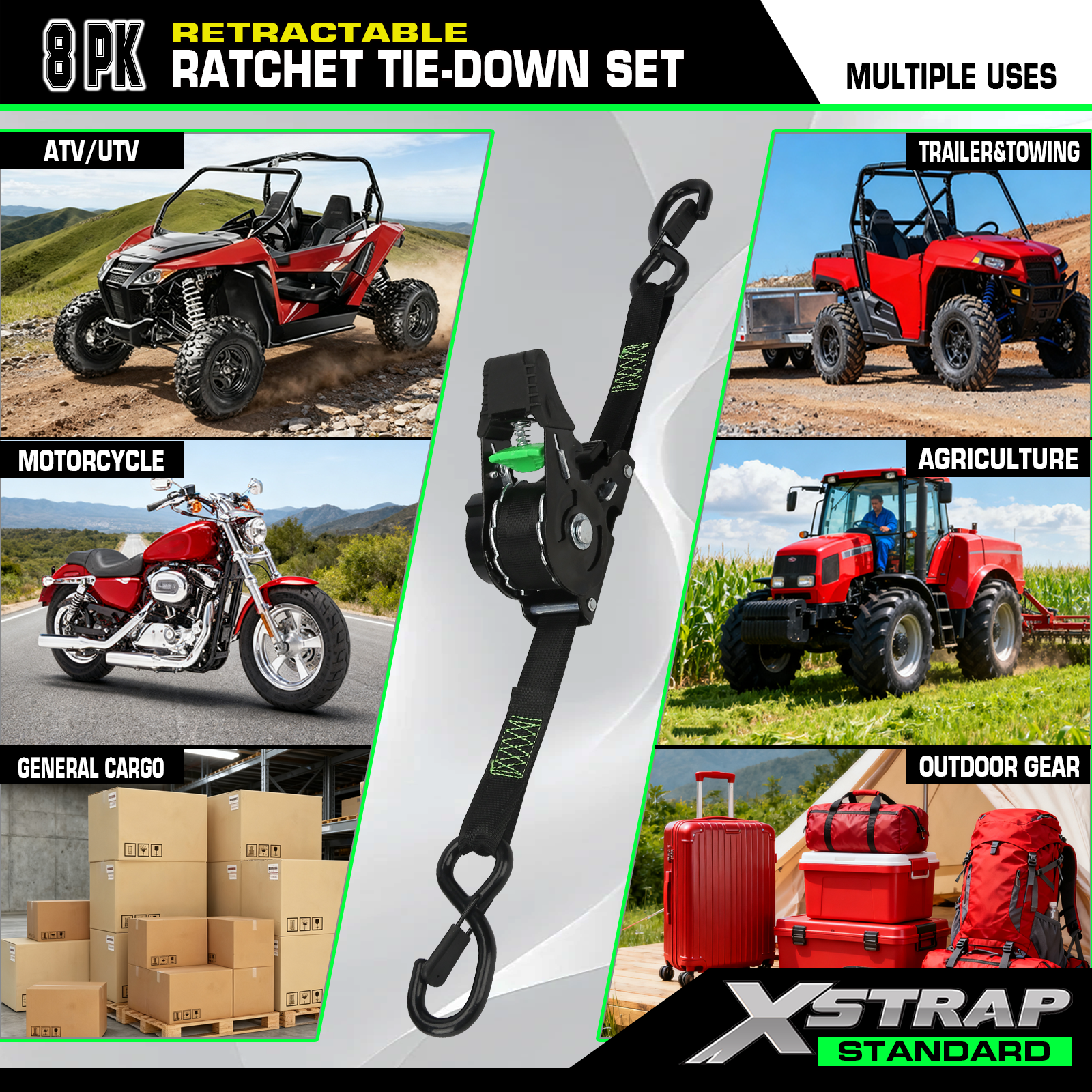 The retractable ratchet strap features a built-in automatic retraction mechanism, allowing the strap to retract smoothly back into its housing after use. This not only keeps the strap neat and protected, but also significantly reduces preparation and cleanup time. The 10ft polyester webbing provides strong tension and dependable strength for motorcycles, ATVs, bicycles, UTVs. The ergonomic ratchet handle is comfortable to operate, offering better grip and less effort when tightening the load.
