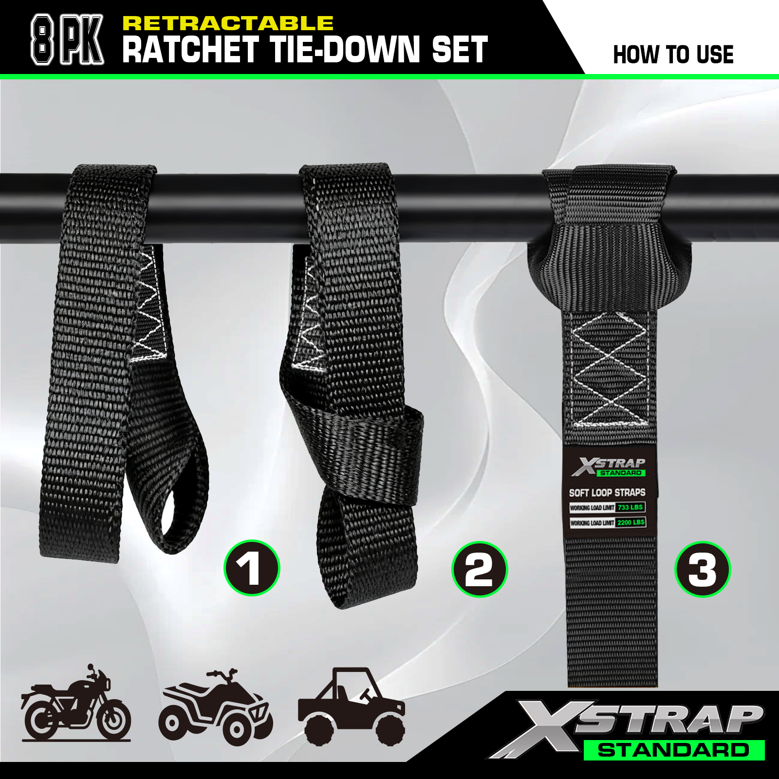 - Includes 4 soft loop tie downs-- the soft loops can help to create anchor points on roof racks, truck beds, handlebars. So you can use our retractable ratchet straps in many scenarios.