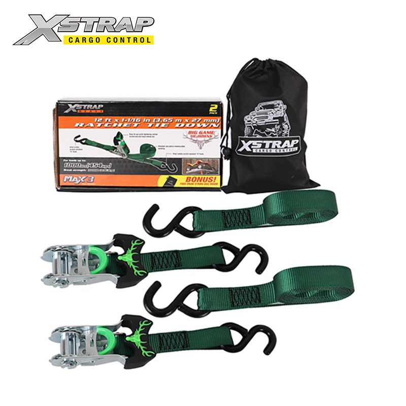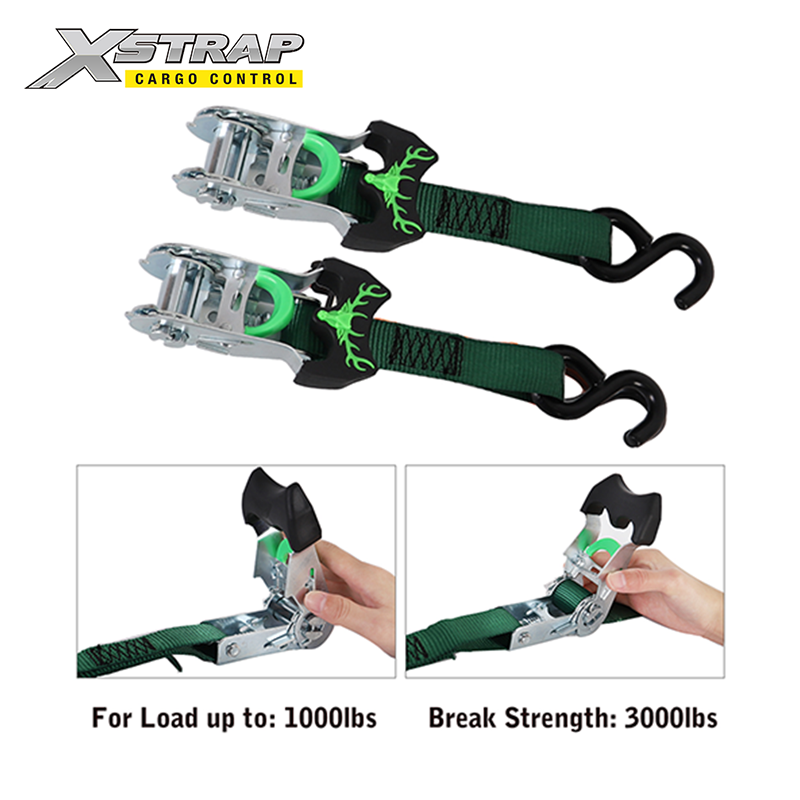 - 1 1/16 inch ratchet straps with S hooks: The safe work load of our 27mm ratchet straps with S hooks is 1000lbs(453kgs), the break strength is 3000lbs(1360kgs). So you can use them to secure the furniture, the machinery, and any other heavy-duty cargo.