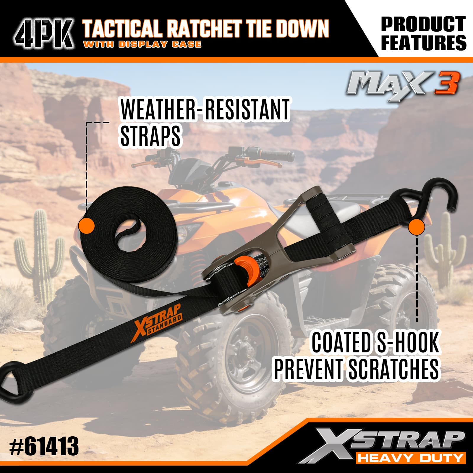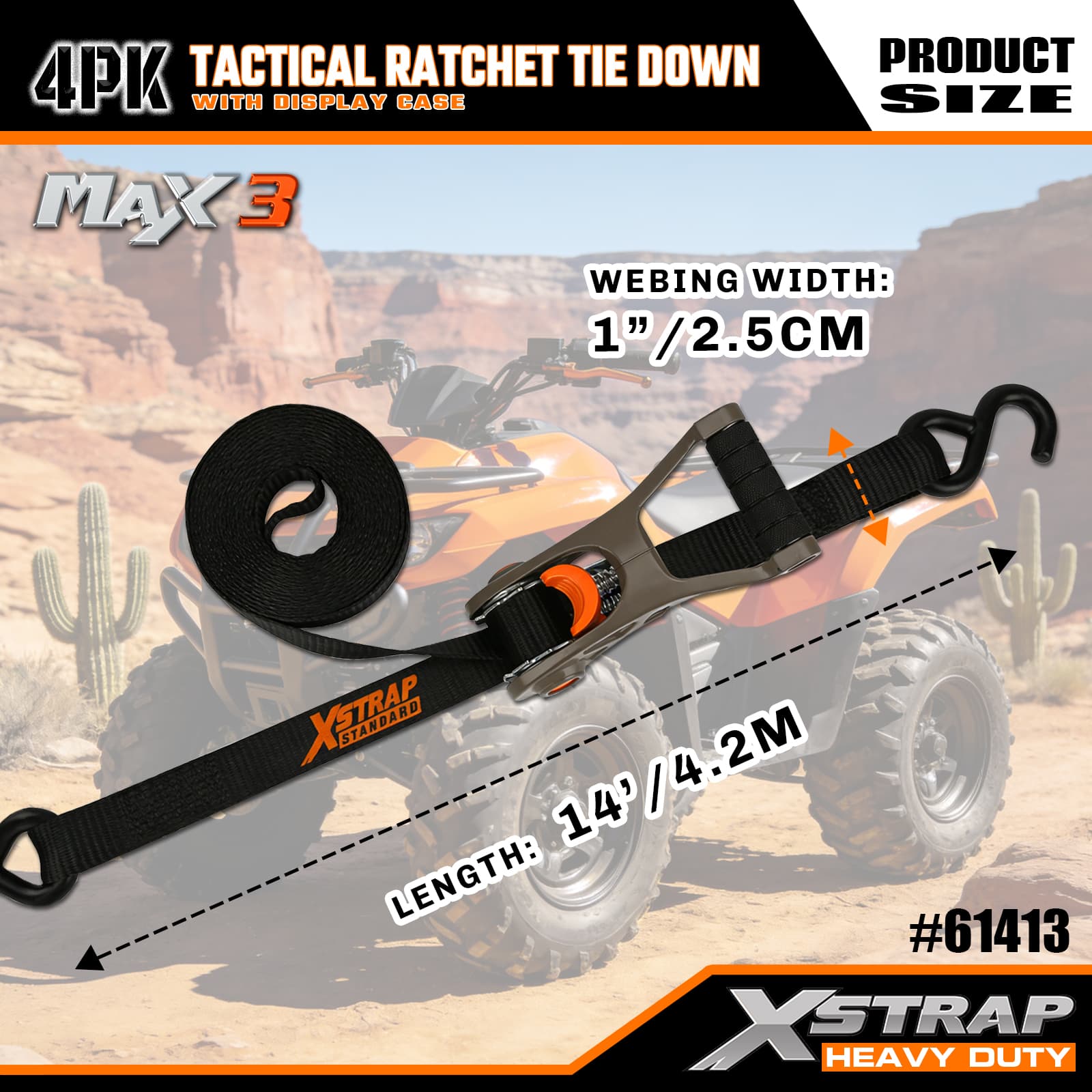 1” x 14’ 4PK Tactical Ratchet Tie Down Straps with Soft Loops