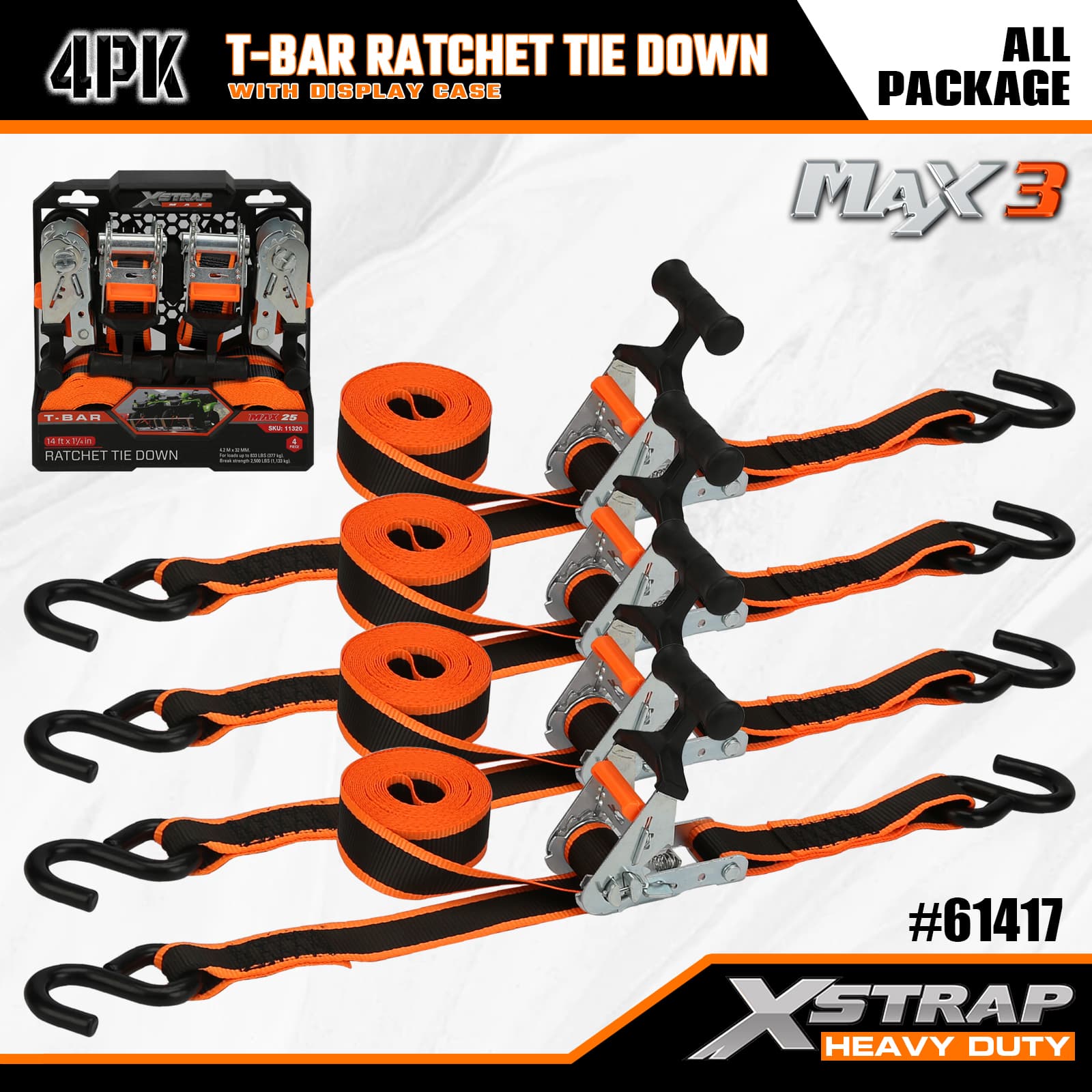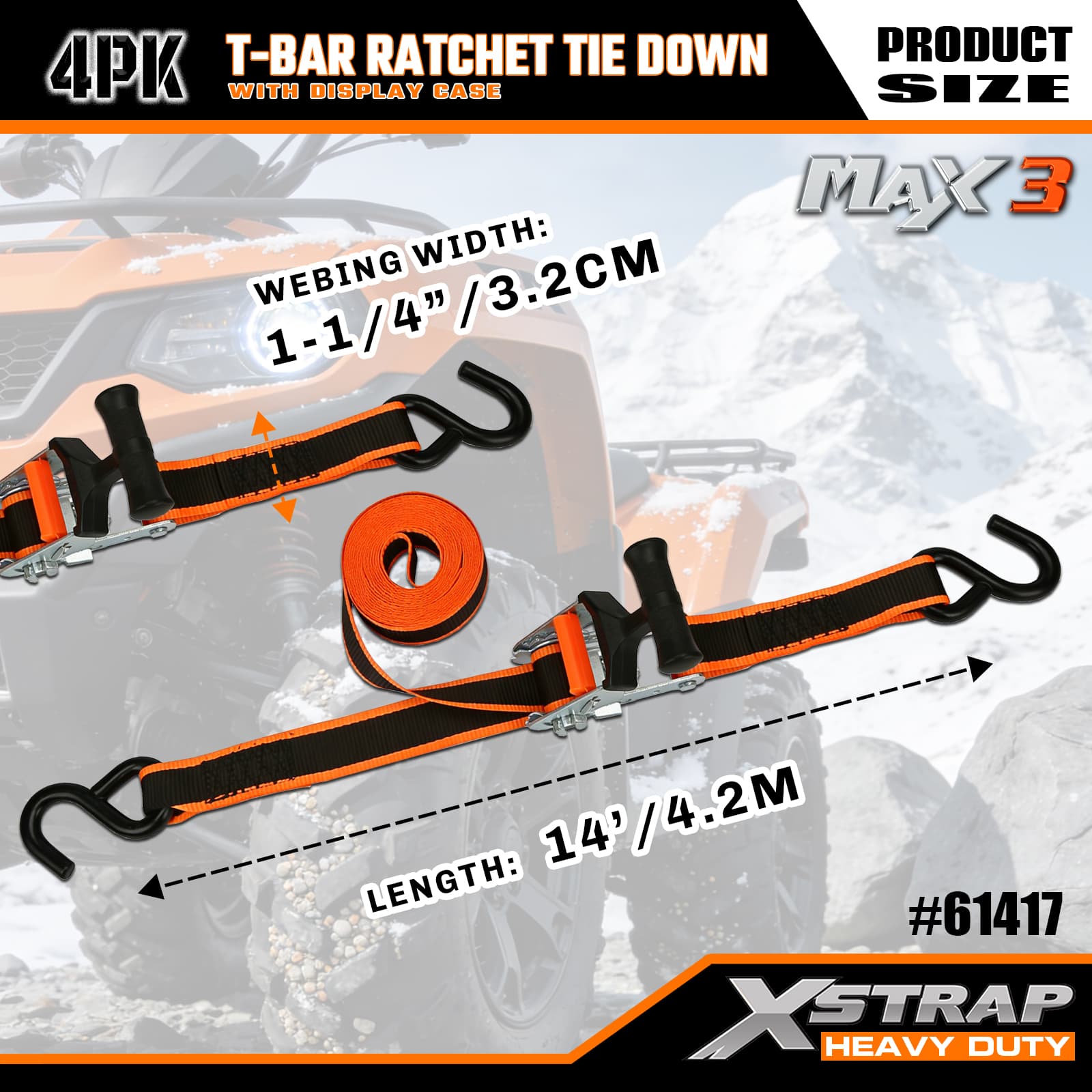 Xstrap 4 Pack T-Max Grip Ratchet Tie Down, 1-1/4 ” x 14’ Polyester Tie Down Strap Pull Ratchet Strap, 1000lbs Capacity Cargo Lashing Securing Straps with S Hooks for Pickup Truck, SUV, Car Top Racks Motorcycle, Light Fishing Boat, Jet Ski, Snowmobile, Lawn Tractor.