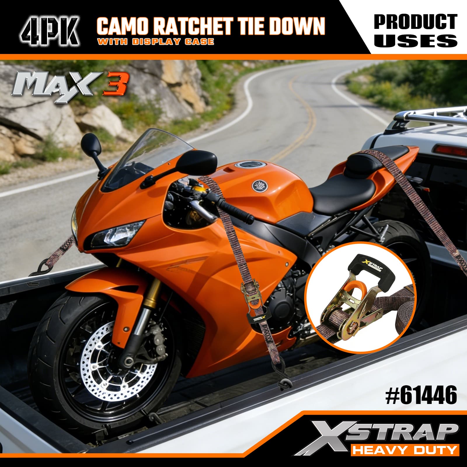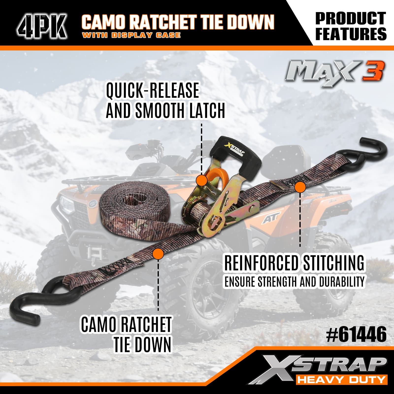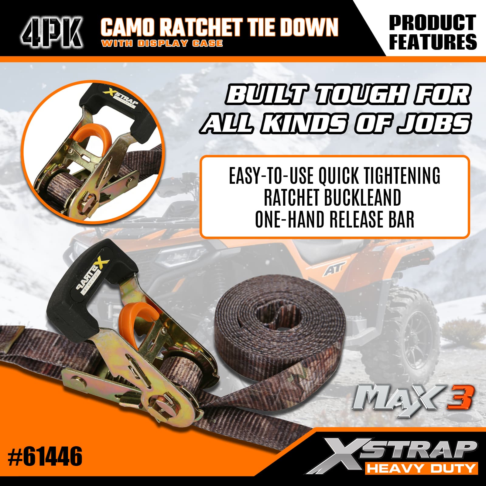 - Camo-Pattern Ratchet with One-Hand Release: Features a user-friendly ratchet buckle paired with a one-hand release bar, enabling quick tensioning and effortless cargo release—no specialized skills needed, suitable for all users.