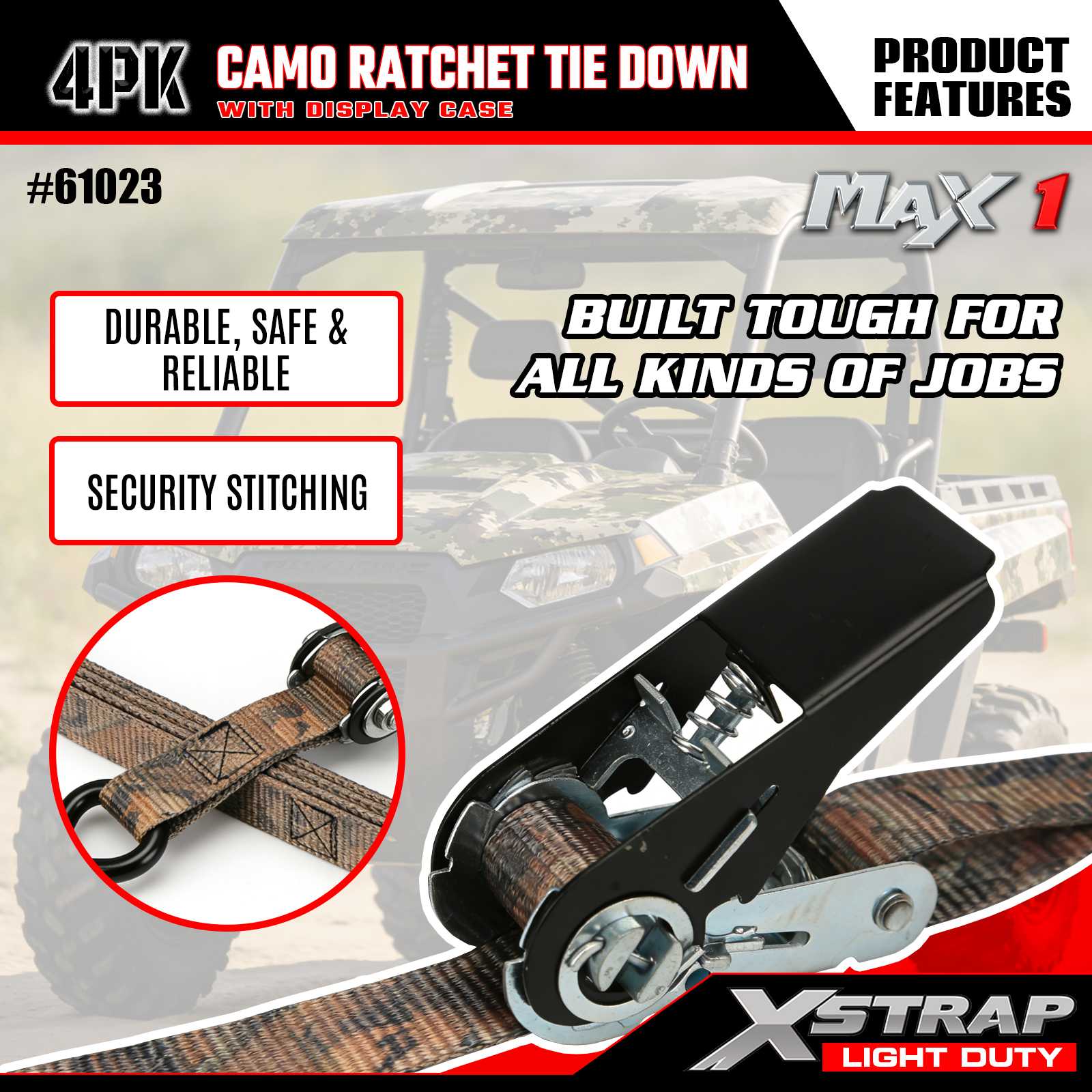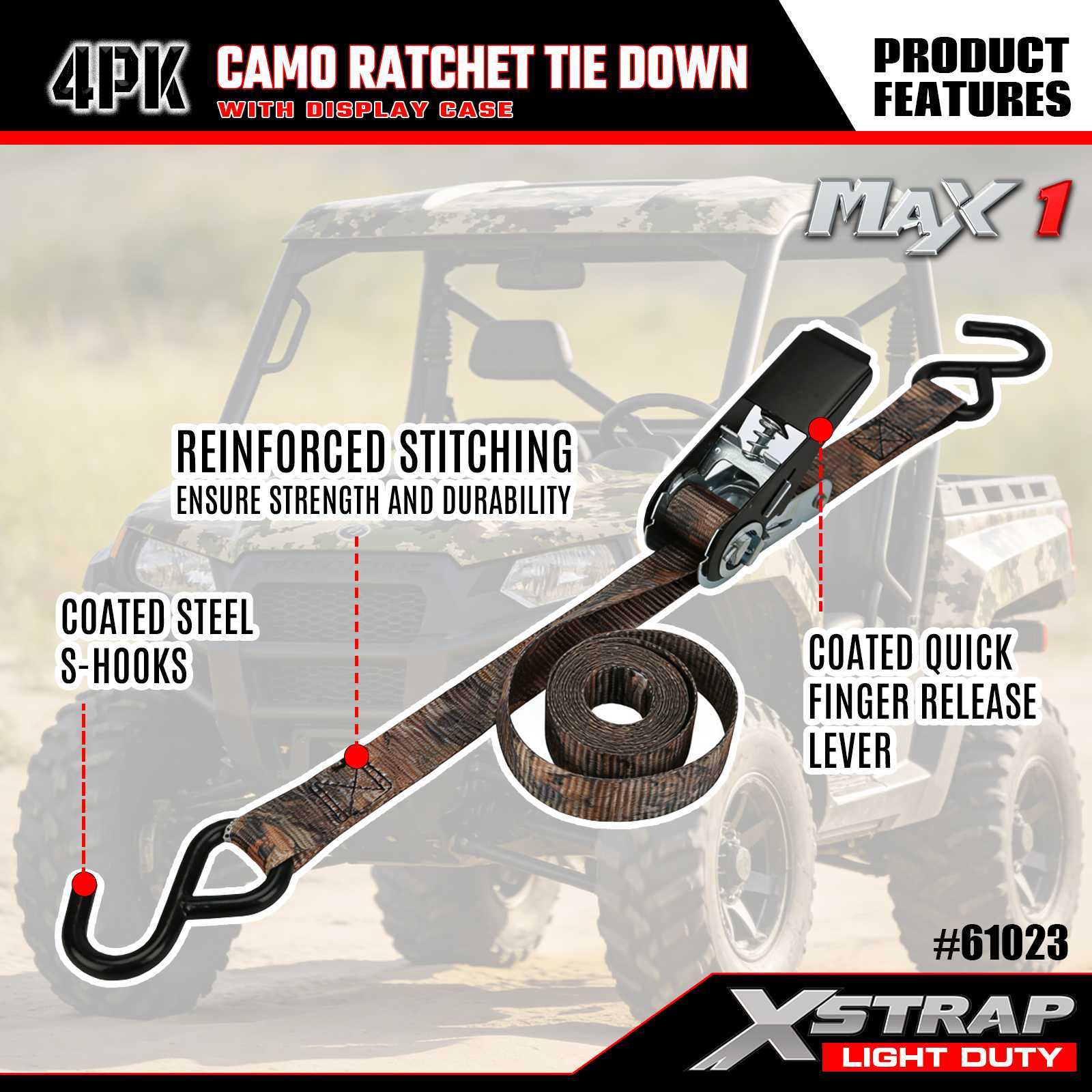 The Xstrap 4PK CAMO Ratchet Tie Down Straps is 1 in x 10 ft, the safe work load is 300lbs and the breaking strength is 900lbs.