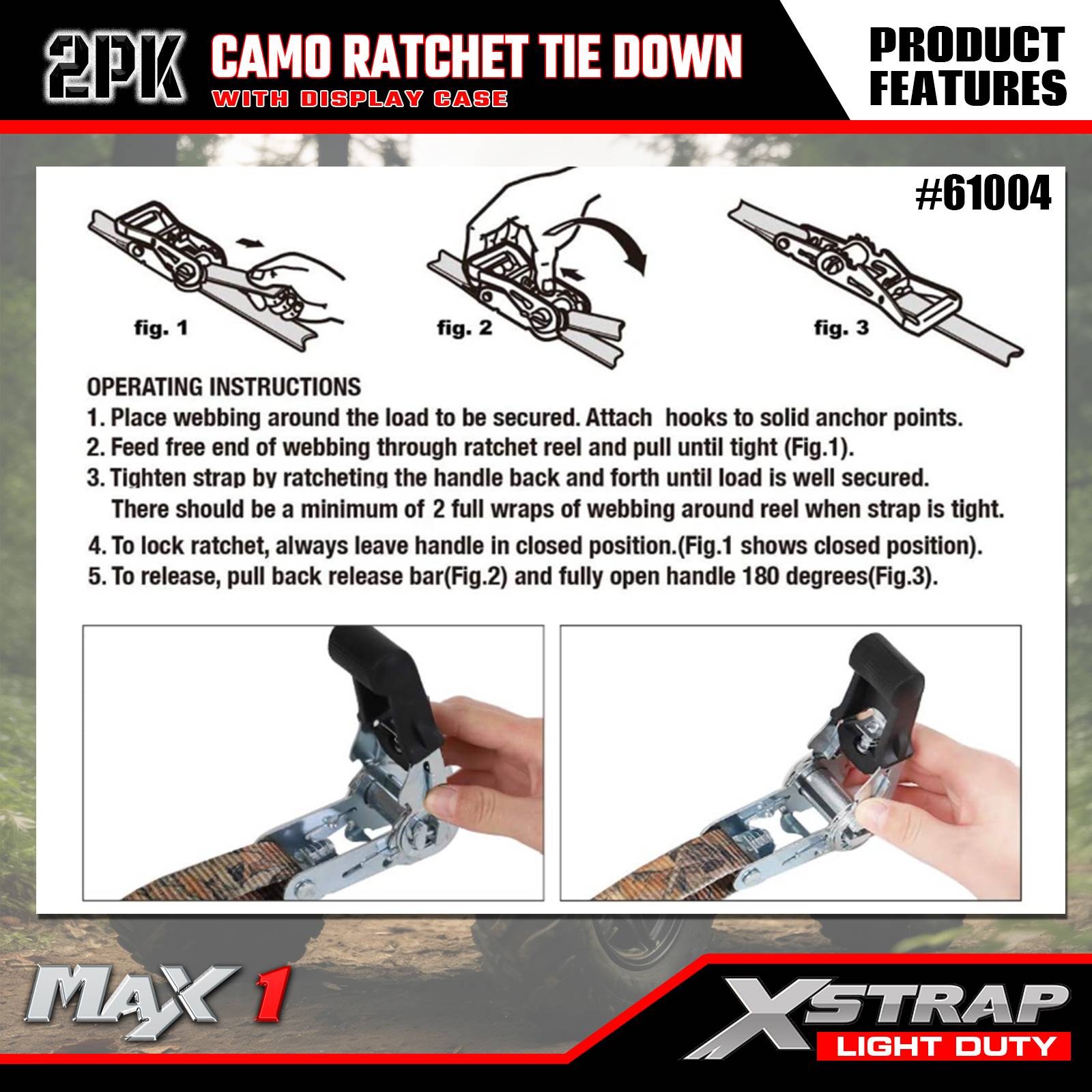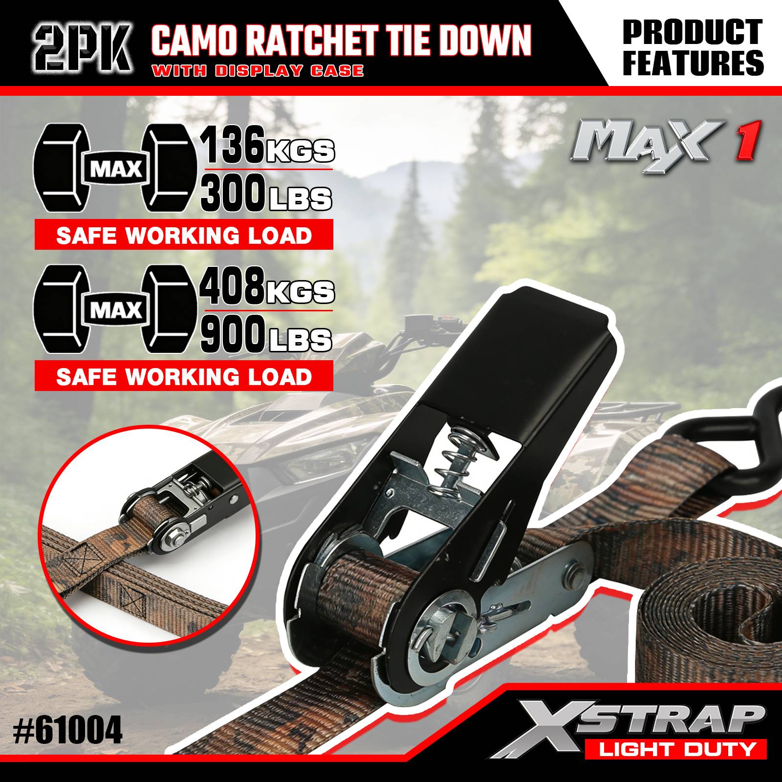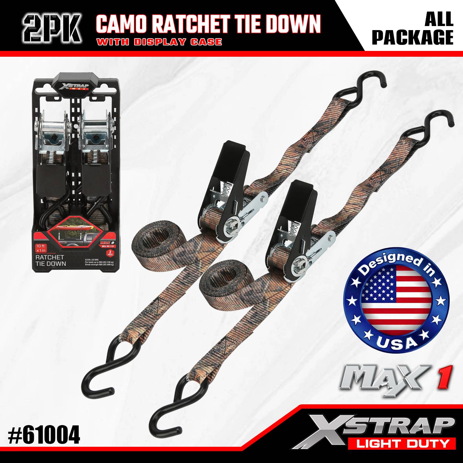 Xstrap 2 Pack Ratchet Tie-Down Straps, 1"x10' - 300 Lbs Load Cap- 900 Lbs Break Strength-Cargo Straps for Moving Appliances, Lawn Equipment, Motorcycle, Camouflage