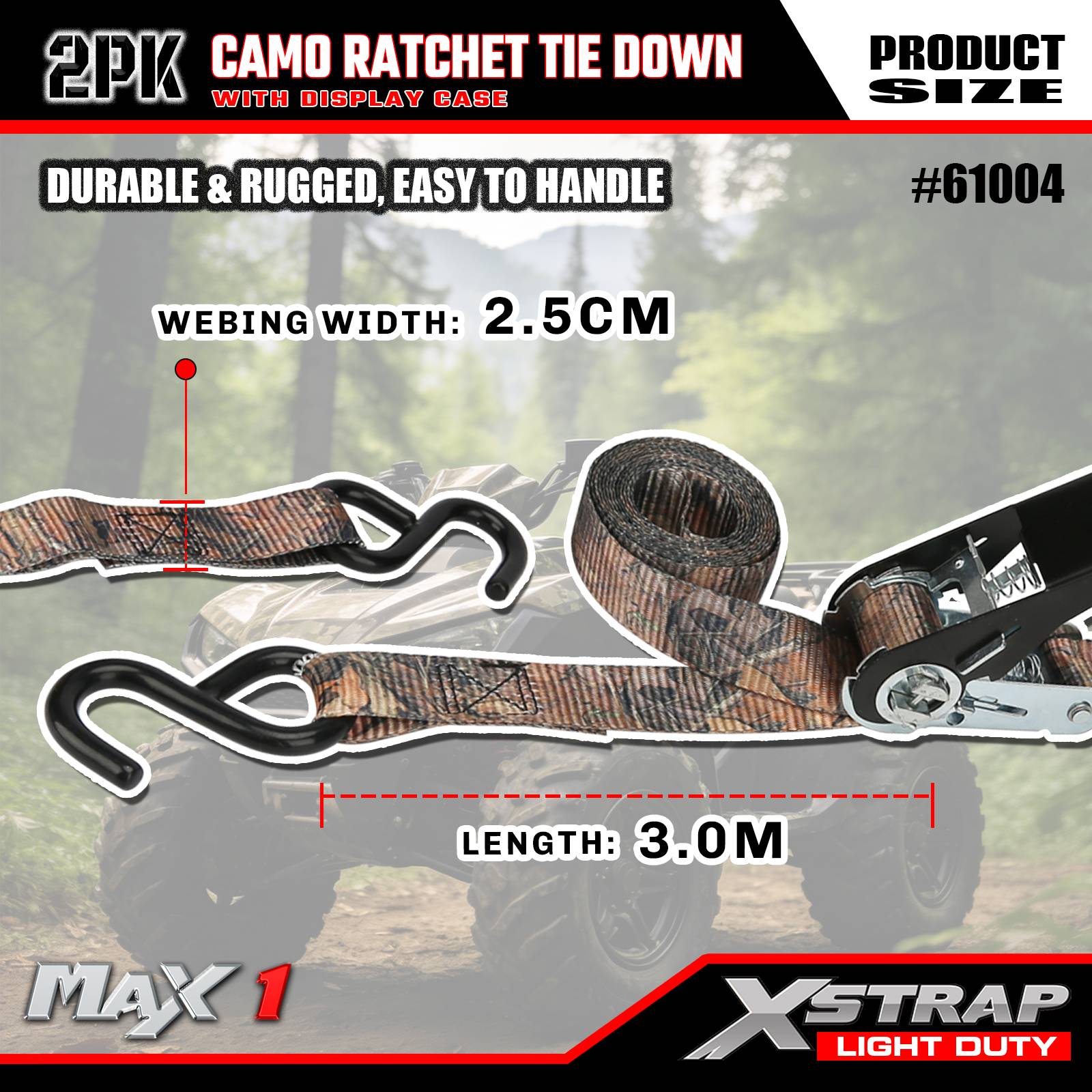 SMK is China Xstrap 61004 1" x 10' 2PK Camouflage Ratchet Tie Down Straps 300lb SWL Factory and Custom Xstrap 61004 1" x 10' 2PK Camouflage Ratchet Tie Down Straps 300lb SWL Suppliers.The product range includes tie-down straps, bungee cords, tow straps, lifting slings, hoists, and 4x4 accessories, widely used in transportation, logistics, outdoor, and industrial sectors. Its in-house brand XSTRAP enjoys strong recognition in global markets, alongside flexible OEM/ODM services for customized needs.