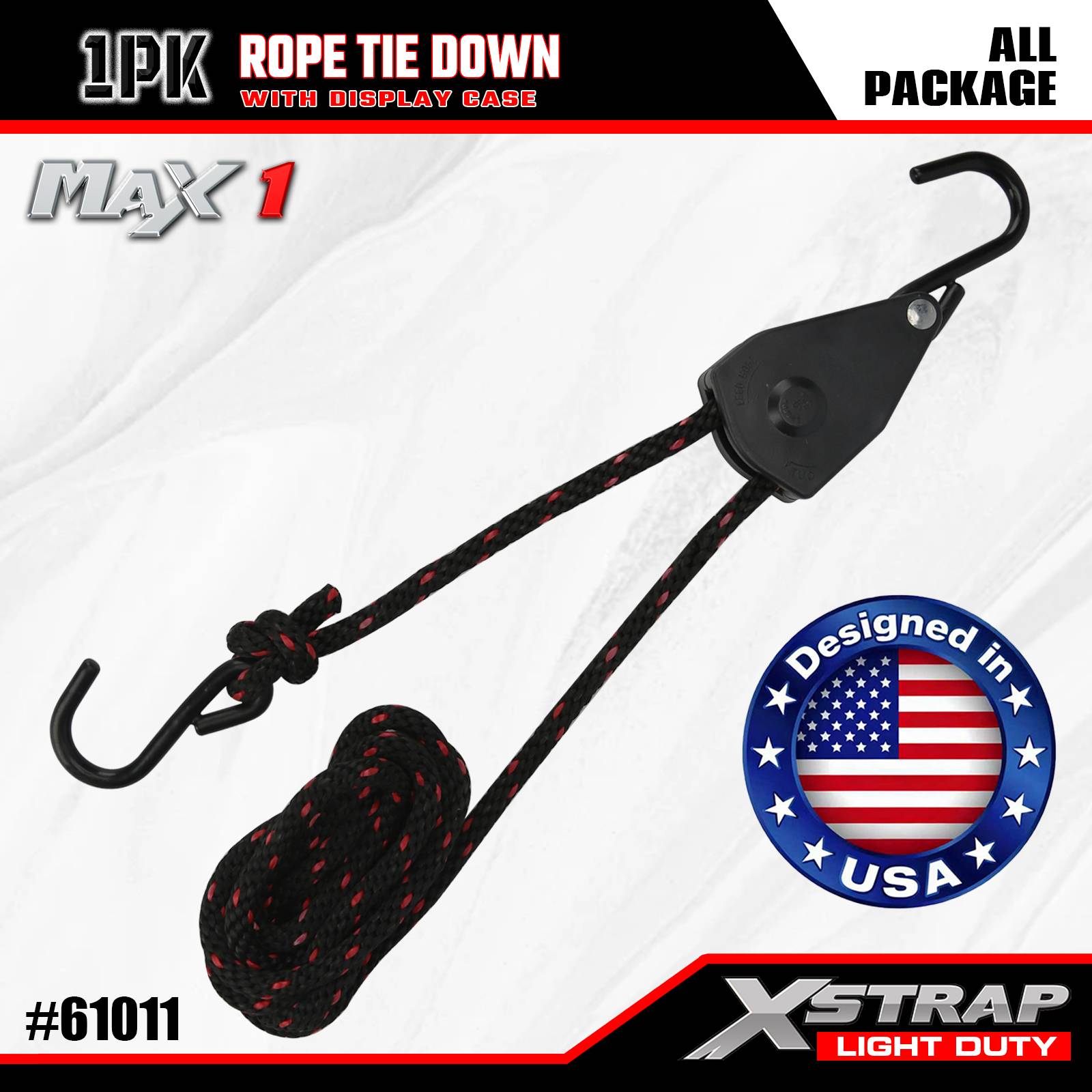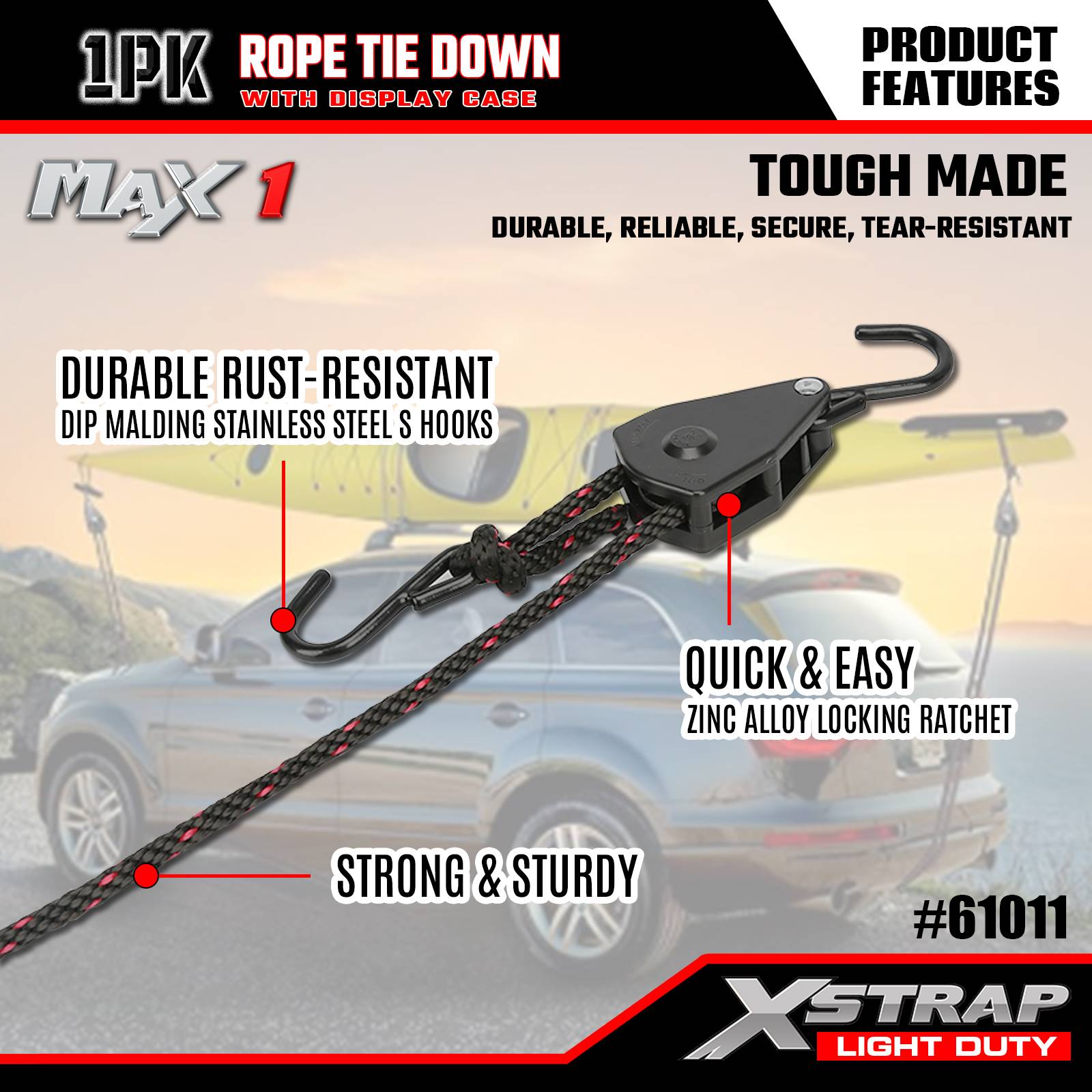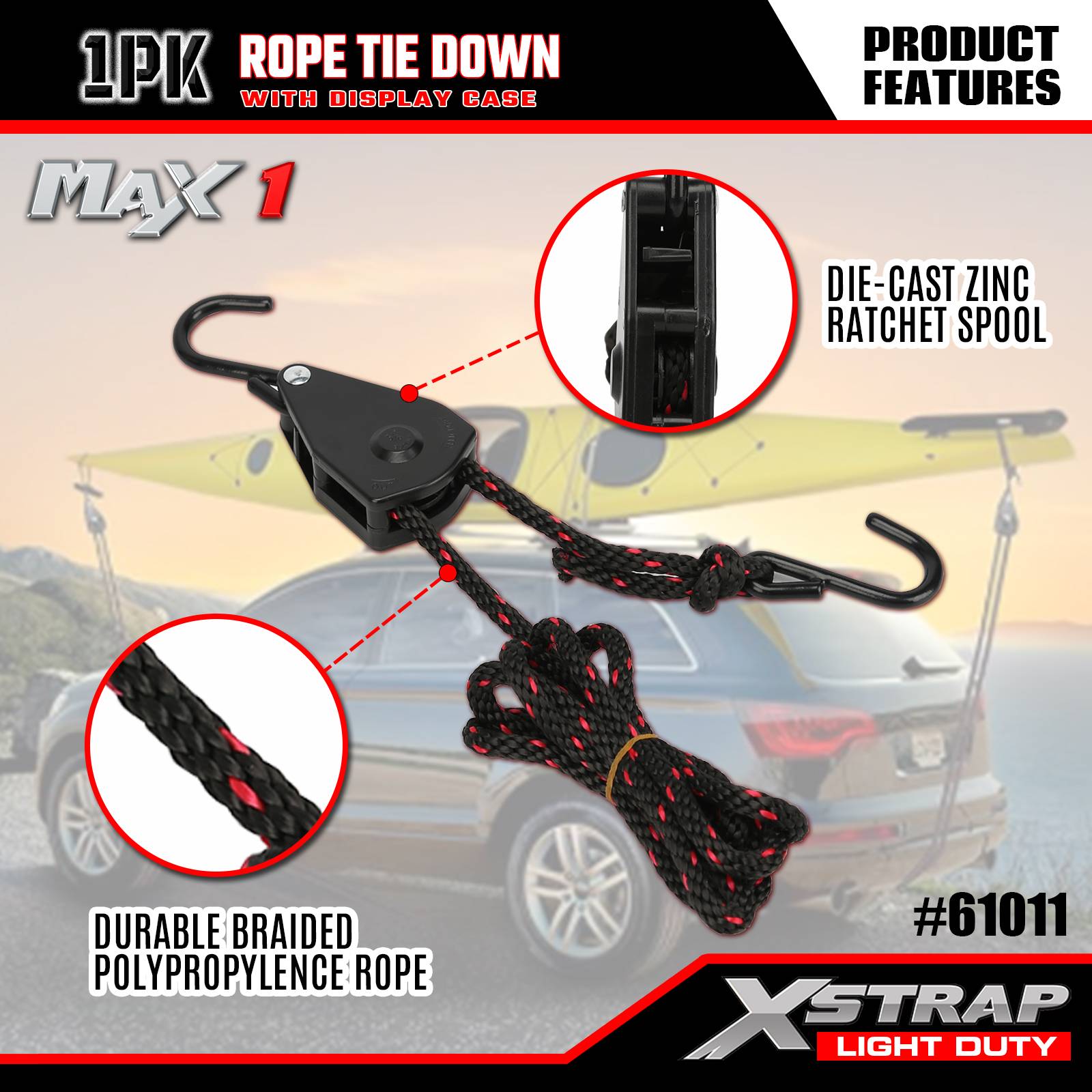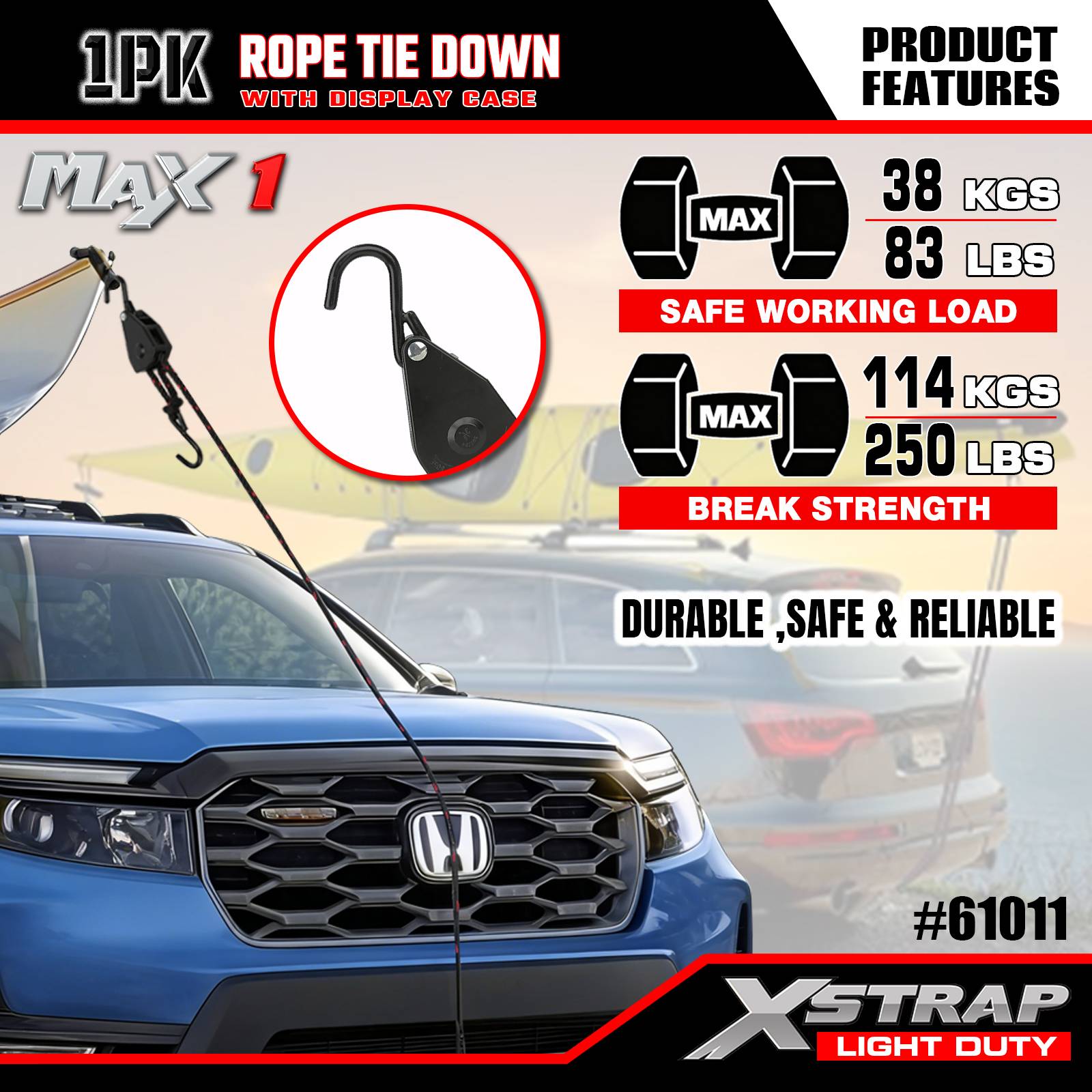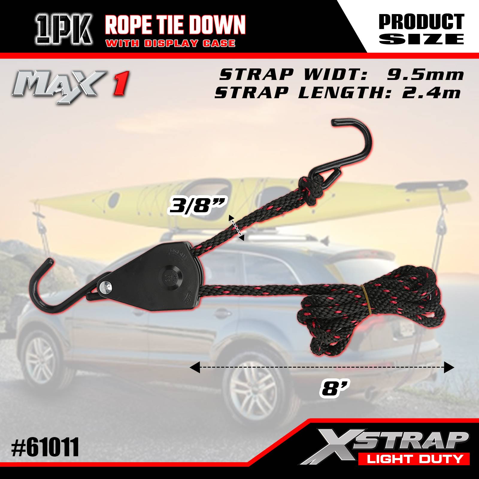 Xstrap 1 Pack Rope Tie-Down Straps, 3/8” x 8’ - 83 Lbs Load Cap- 250 Lbs Break Strength-Cargo Straps for Securing Light Loads (Kayaks, Gear, Small Equipment) to Vehicles/Racks
