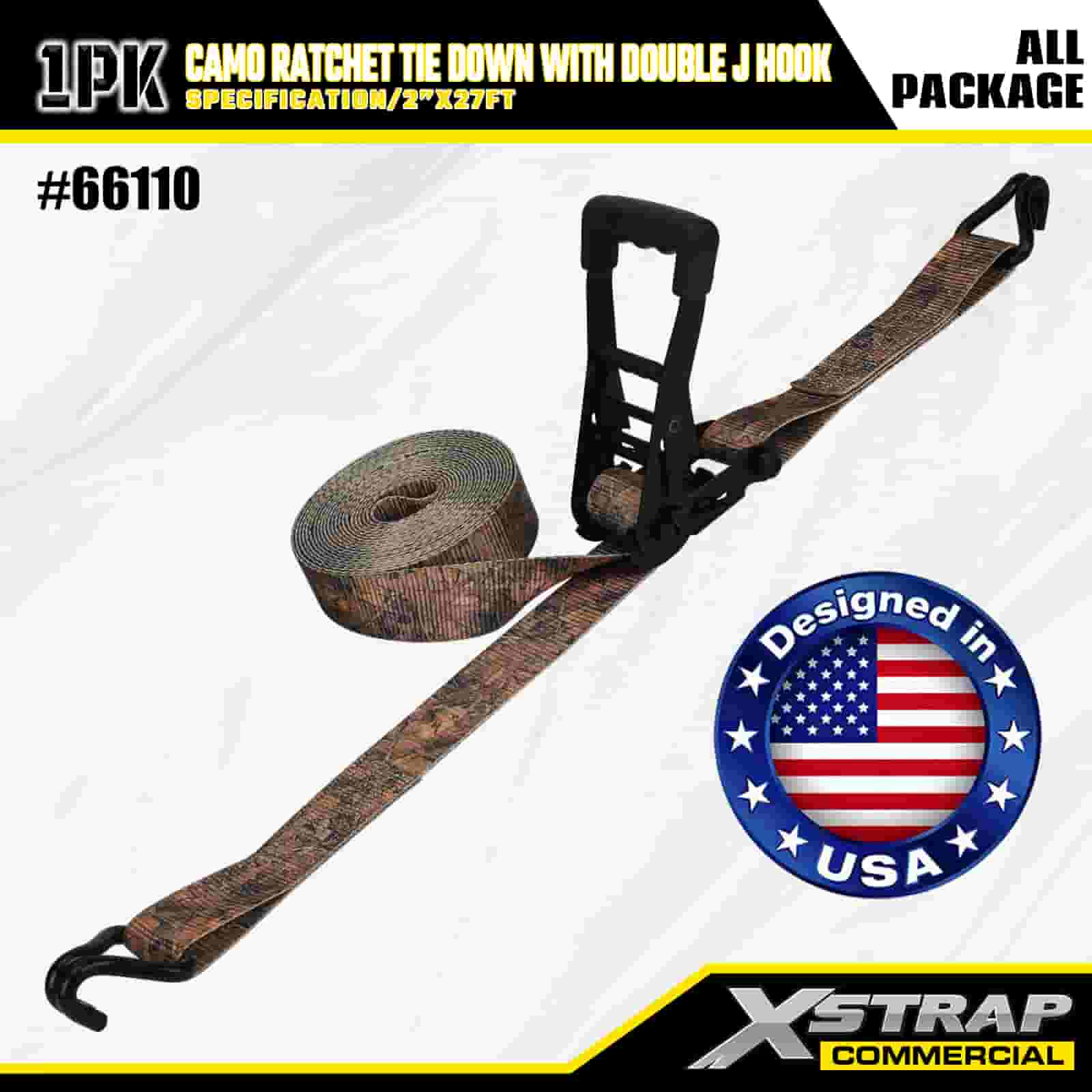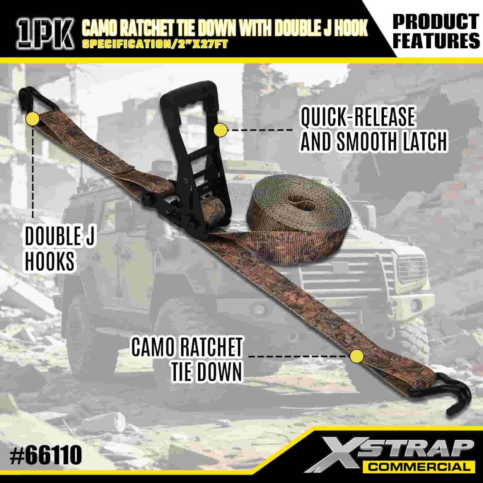 Xstrap CAMO Ratchet Tie Down with Double J Hooks, 2” x 27’ Polyester Tie Down Strap Pull Ratchet Strap, 3333lbs Capacity Cargo Lashing Securing Straps with Double J Hooks for Cargo control Pickup Truck, SUV, Car Top Racks Motorcycle,.