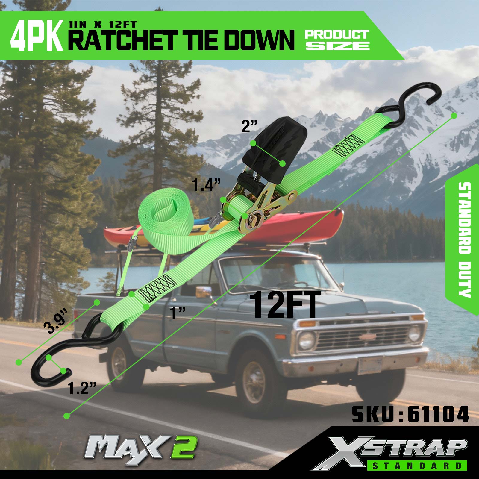 1” x 12’ 4PK Ratchet Tie Down Straps