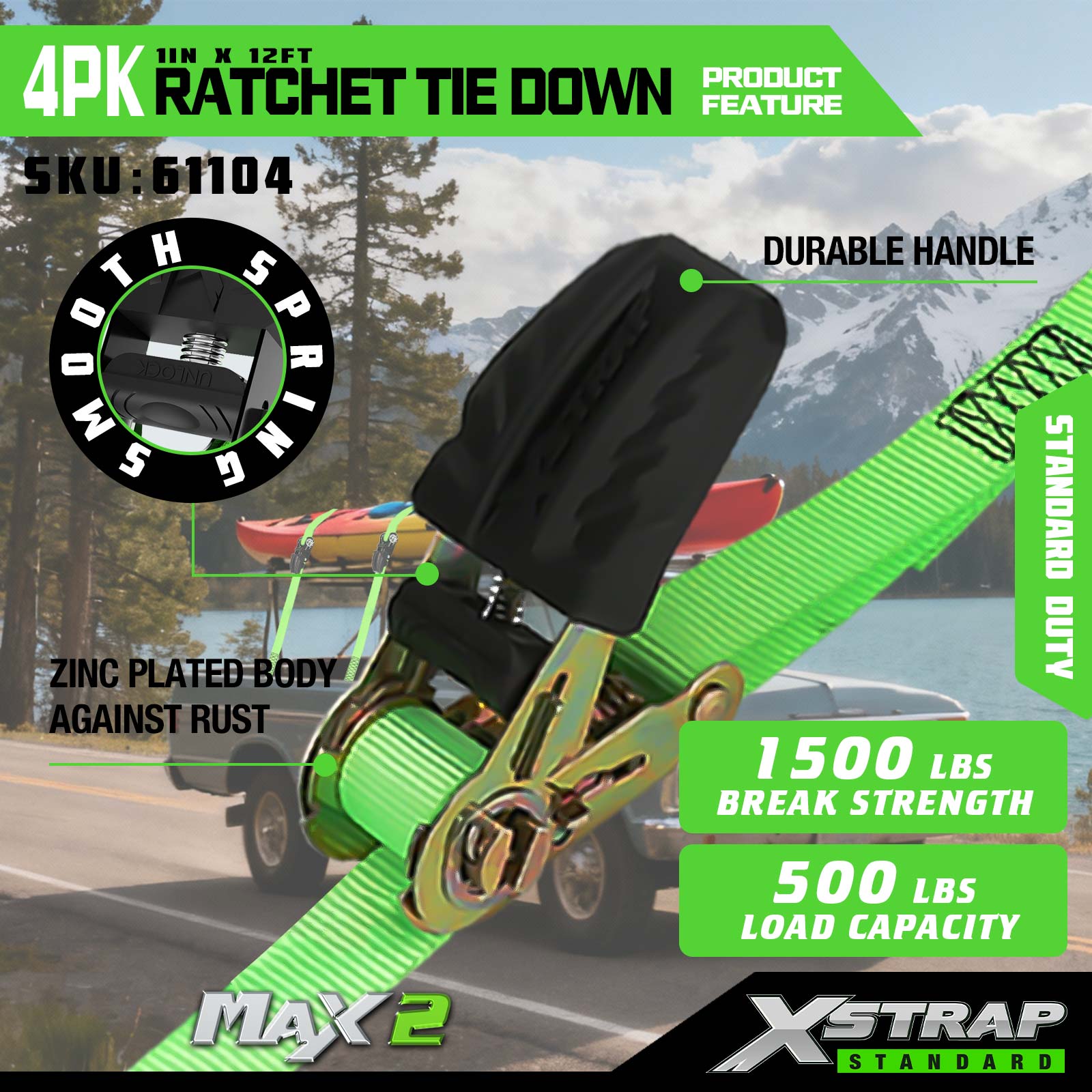 - Smooth-Spring Fat Handle Ratchet: Features a wide, durable fat handle paired with a built-in smooth spring system, enabling comfortable, consistent tensioning—intuitive enough for all user skill levels to secure cargo quickly.