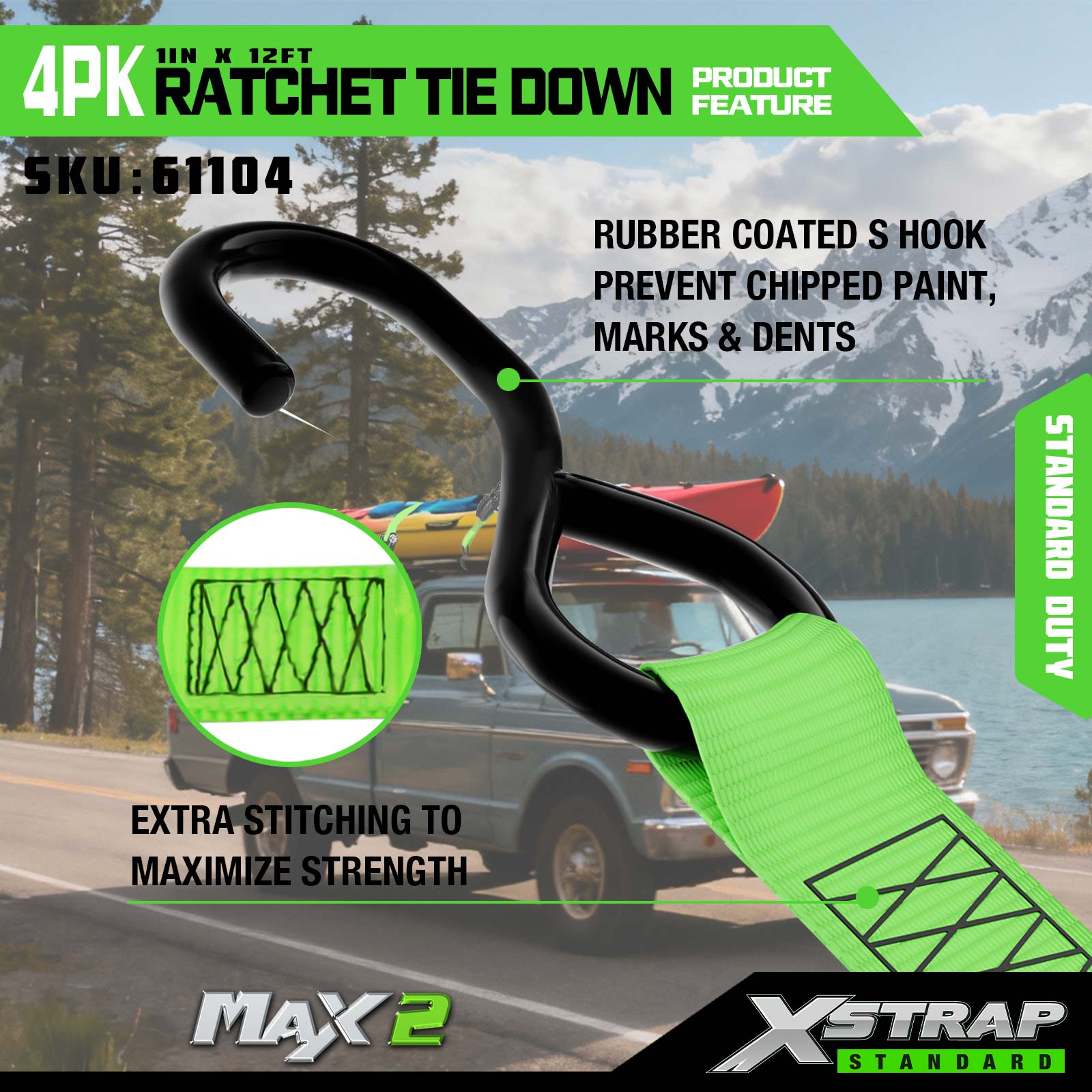 - Rubber-Coated S-Hooks for Protection: Equipped with rubber-coated S-hooks that shield vehicles and cargo from paint chips, marks, and dents, balancing firm restraint with surface care.