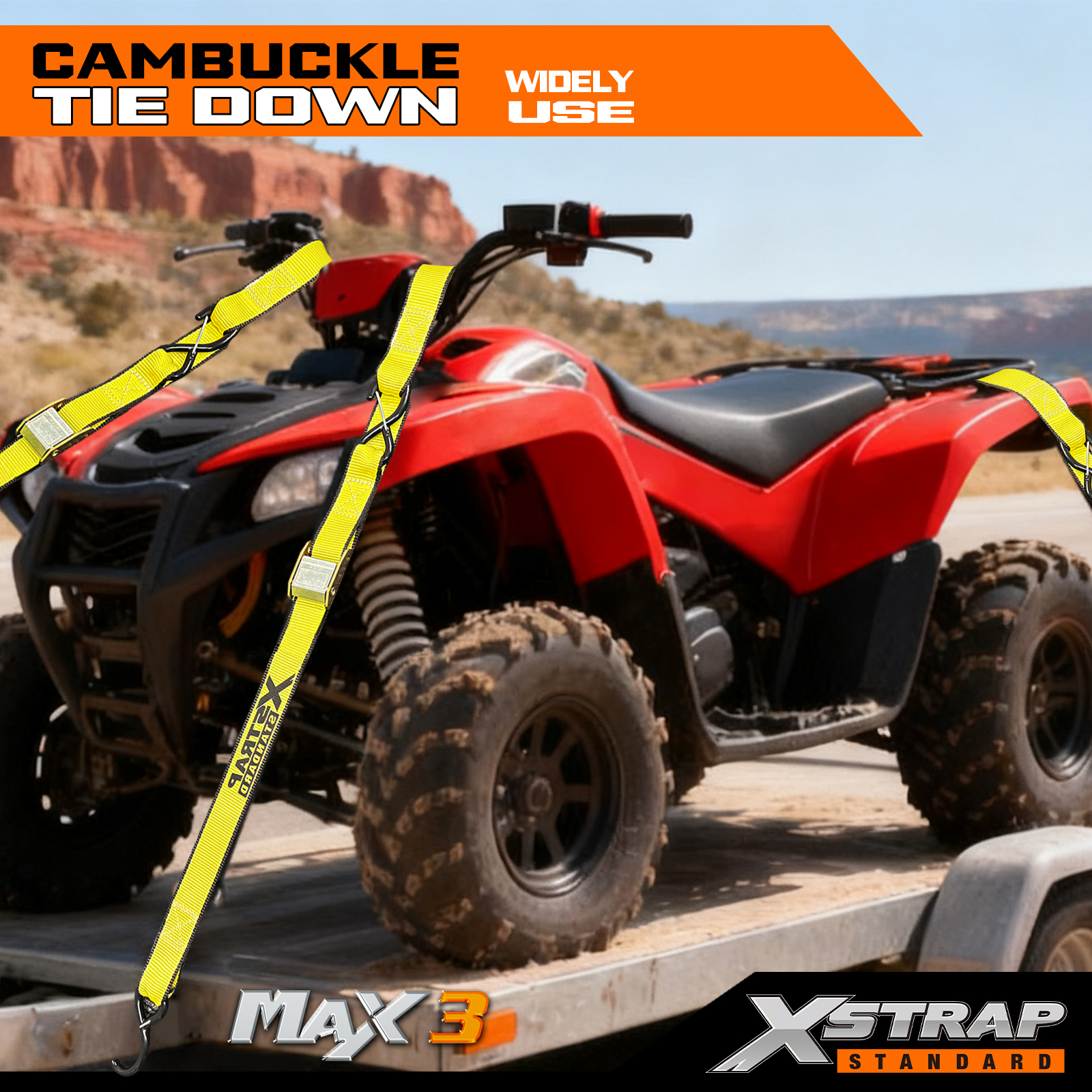 This is Xstrap 1.5 inch 8ft cam buckle tie down straps with safey s hooks and soft loops set. This cam buckle straps are usually used in motorcycles, ATV, UTV and pickup trucks.