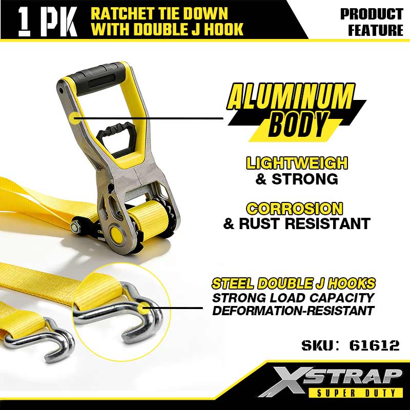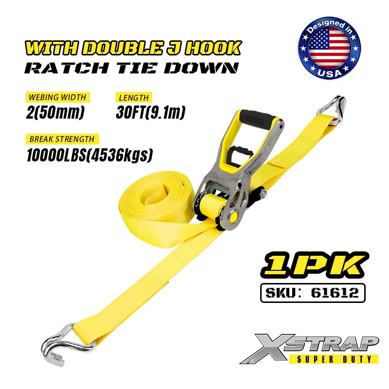 Xstrap Ratchet Tie Down with Double J Hooks, 2” x 30’ Polyester Tie Down Strap Ratchet Strap, 3333lbs Capacity Cargo Lashing Securing Straps with Double J Hooks for Heavy Duty Trailer, Flat Bed Trailer Ski Boat, Small Car, Heavy Equipment.