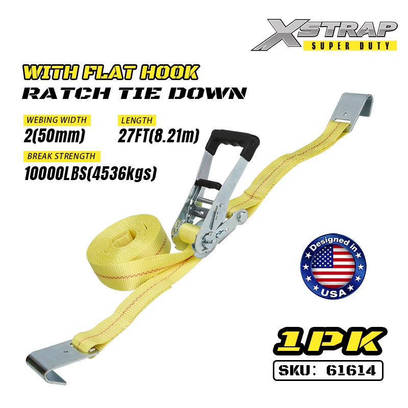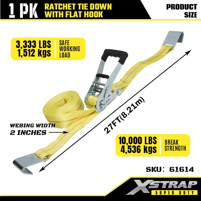 Xstrap Ratchet Tie Down with Flat Hooks, 2” x 27’ Polyester Tie Down Strap Ratchet Strap, 3333lbs Capacity Cargo Lashing Securing Straps with Flat Hooks for Heavy Duty Trailer, Flat Bed Trailer Ski Boat, Small Car, Heavy Equipment.