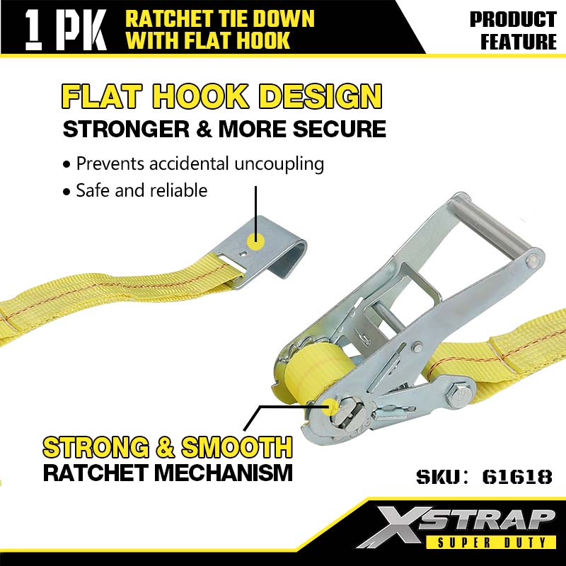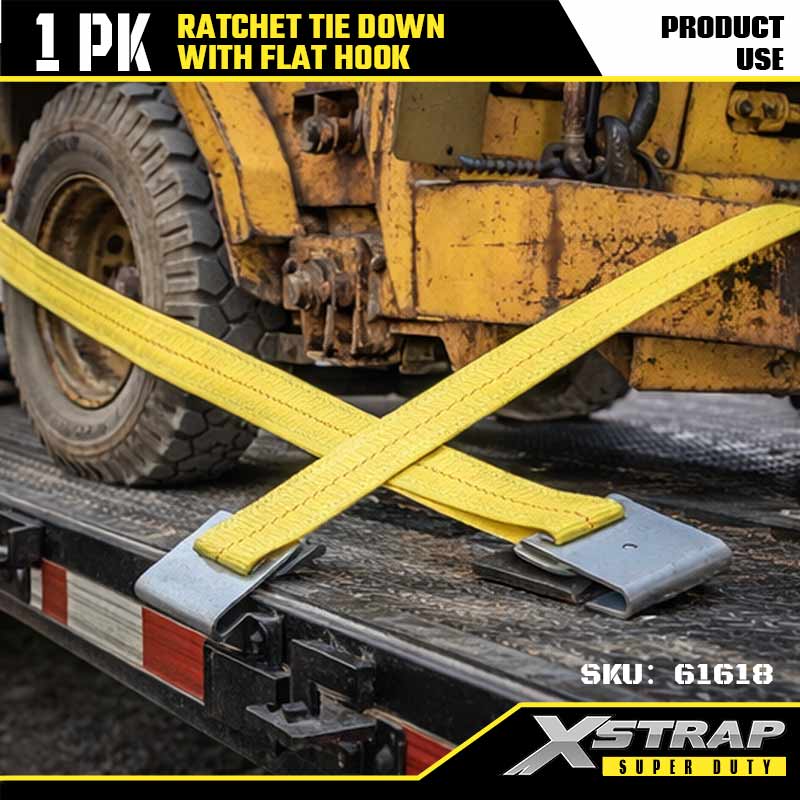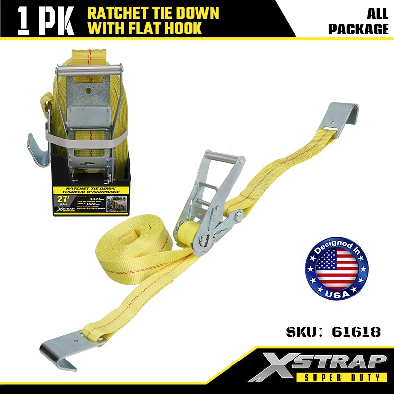 Xstrap Ratchet Tie Down with Flat Hooks, 2” x 27’ Polyester Tie Down Strap Ratchet Strap, 3333lbs Capacity Cargo Lashing Securing Straps with Flat Hooks for Heavy Duty Trailer, Flat Bed Trailer Ski Boat, Small Car, Heavy Equipment.