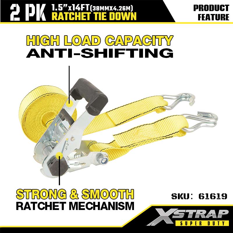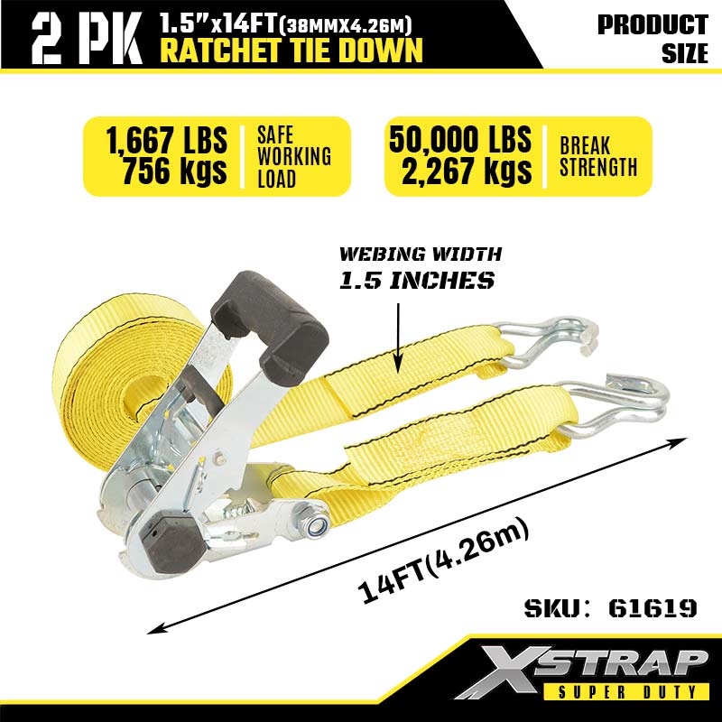 Xstrap 2PK Ratchet Tie Down with Double J Hooks, 1-1/2” x 14’ Polyester Tie Down Strap Ratchet Strap, 1667lbs Capacity Cargo Lashing Securing Straps with Double J Hooks for Heavy Duty Trailer, Flat Bed Trailer Ski Boat, Small Car, Heavy Equipment.