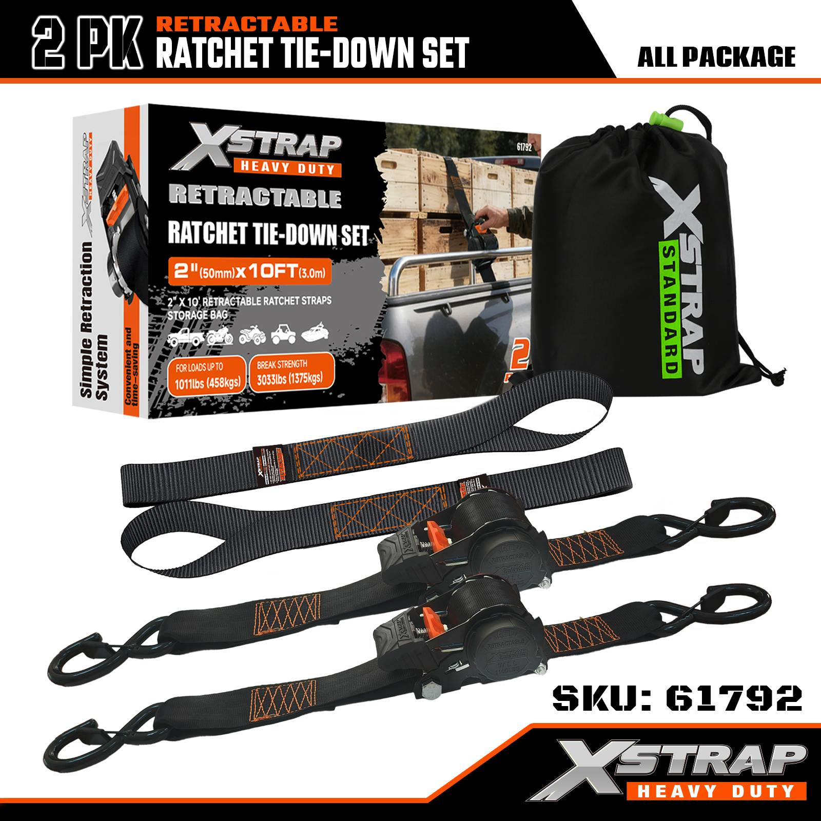 SMK is China Xstrap 61792 2PK 2” x 10’ Retractable Ratcet Tie Down Set with Safety S Hooks 1011lb SWL Factory and Custom Xstrap 61792 2PK 2” x 10’ Retractable Ratcet Tie Down Set with Safety S Hooks 1011lb SWL Suppliers. The product range includes tie-down straps, bungee cords, tow straps, lifting slings, hoists, and 4x4 accessories, widely used in transportation, logistics, outdoor, and industrial sectors. Its in-house brand XSTRAP enjoys strong recognition in global markets, alongside flexible OEM/ODM services for customized needs.