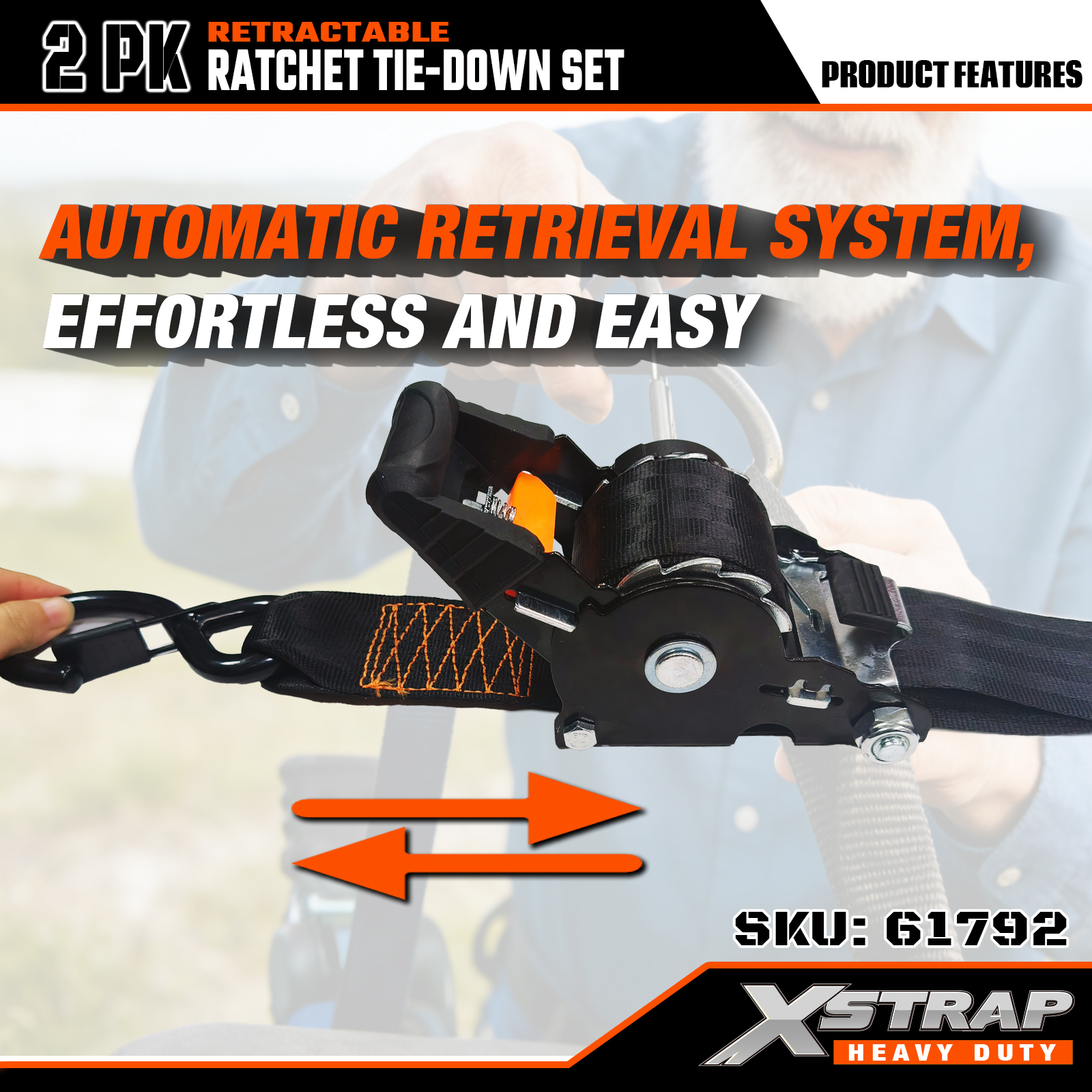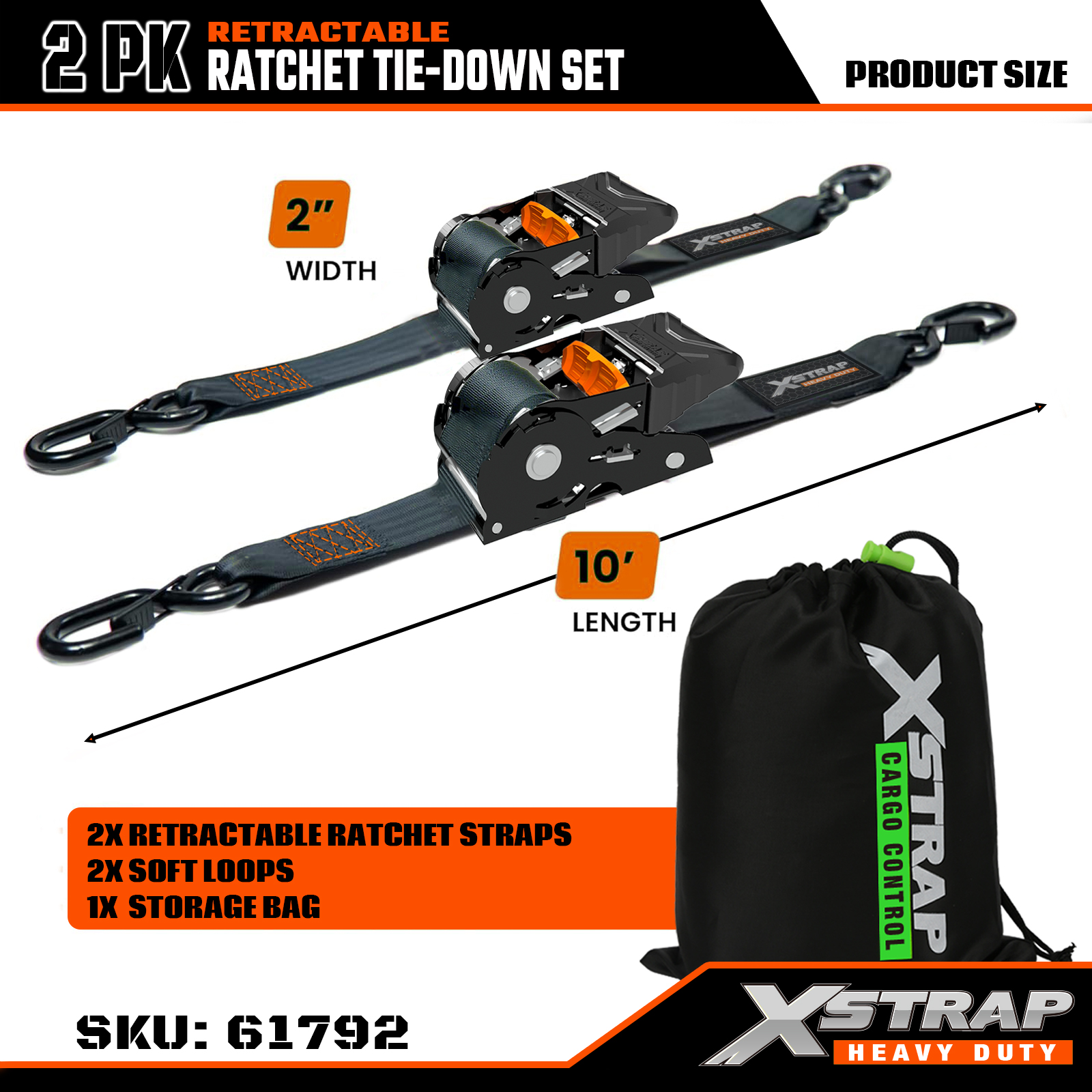 Xstrap 2PK Retractable Ratcet Tie Down Set with Safety S Hooks, 2” x 10’ Polyester Tie Down Strap Ratchet Strap, 1011lbs Capacity Cargo Lashing Securing Straps with Safety S Hooks for for Truck, Cargo Trailer, Motorcycle.