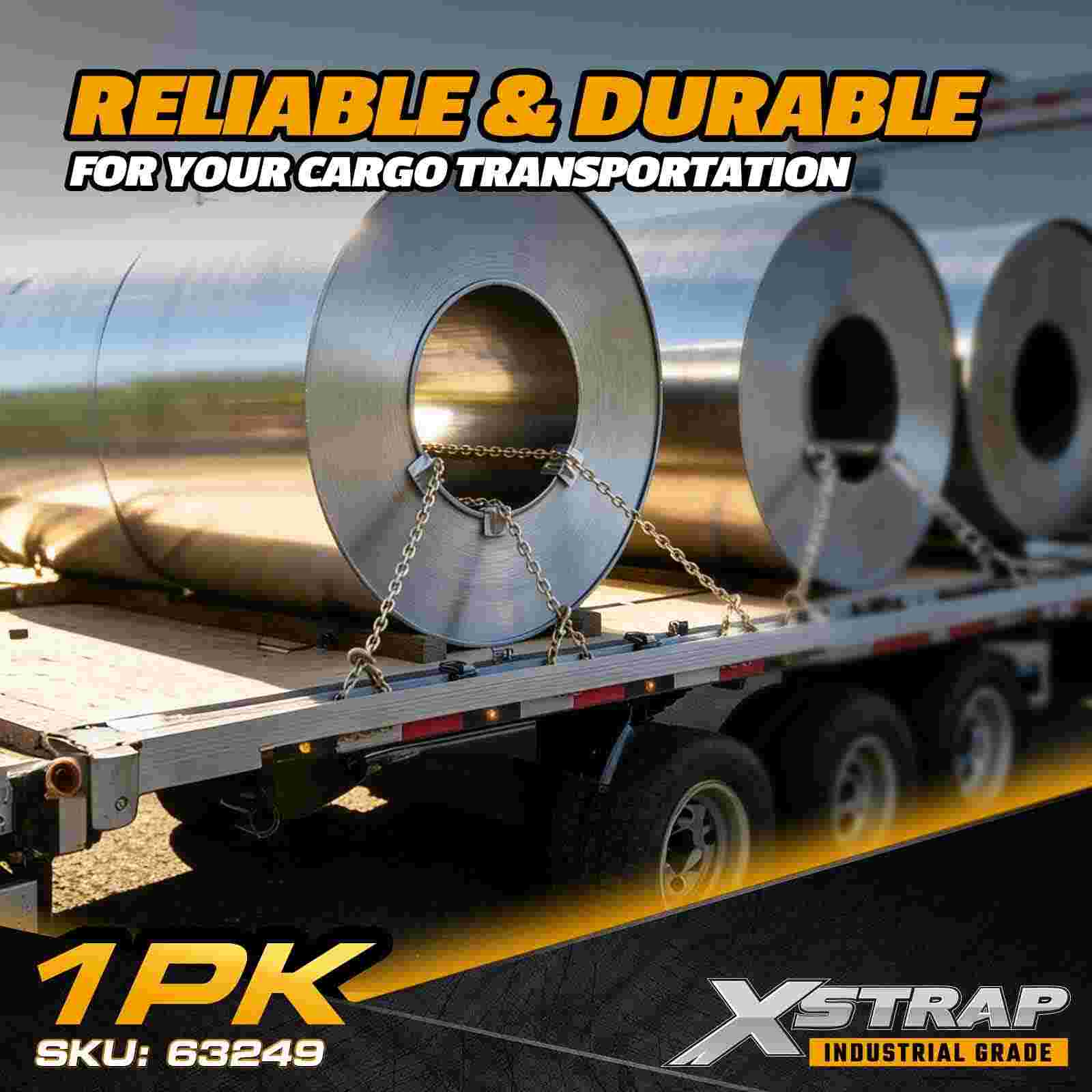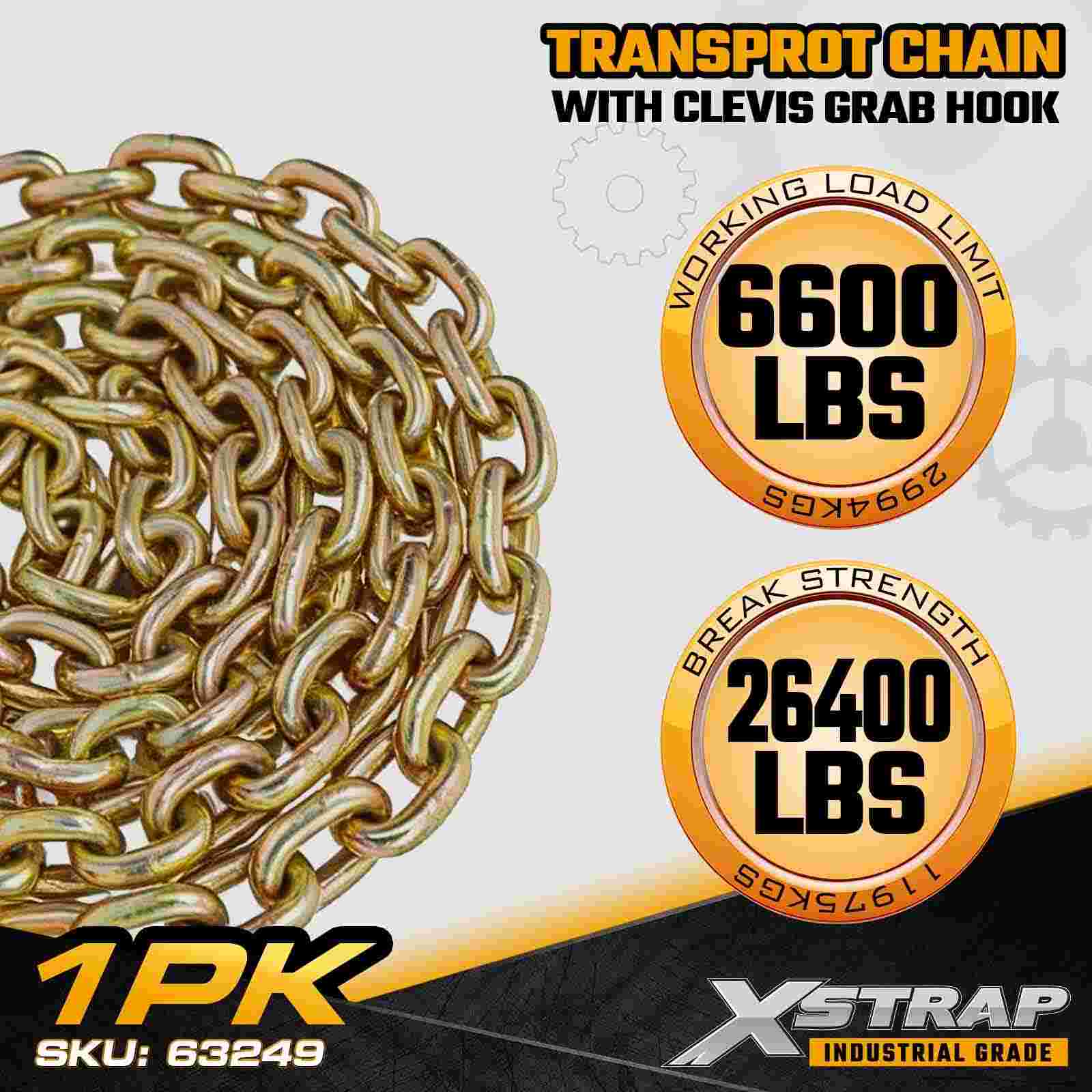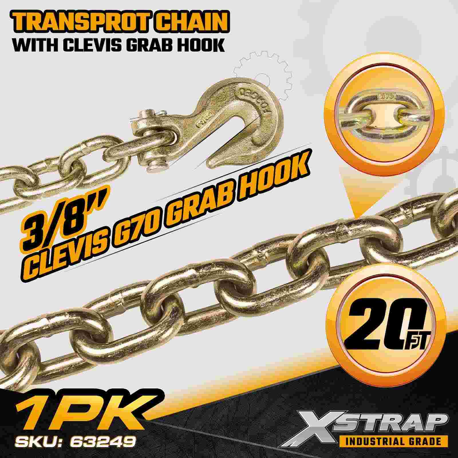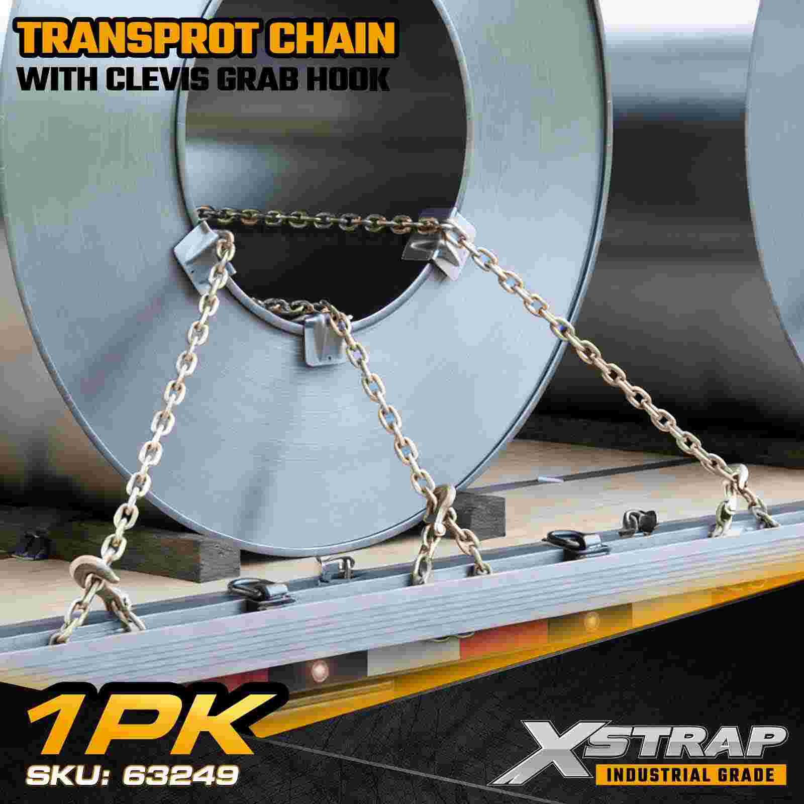 The Xstrap 63249 Grade 70 Transport Chain Assembly is a heavy-duty tie-down solution designed for securing large machinery, vehicles, and industrial loads. Built from heat-treated carbon steel with a corrosion-resistant yellow zinc chromate finish, this 3/8" × 20' chain meets transport standards and includes forged Grade 70 clevis grab hooks for reliable high-tension securement.